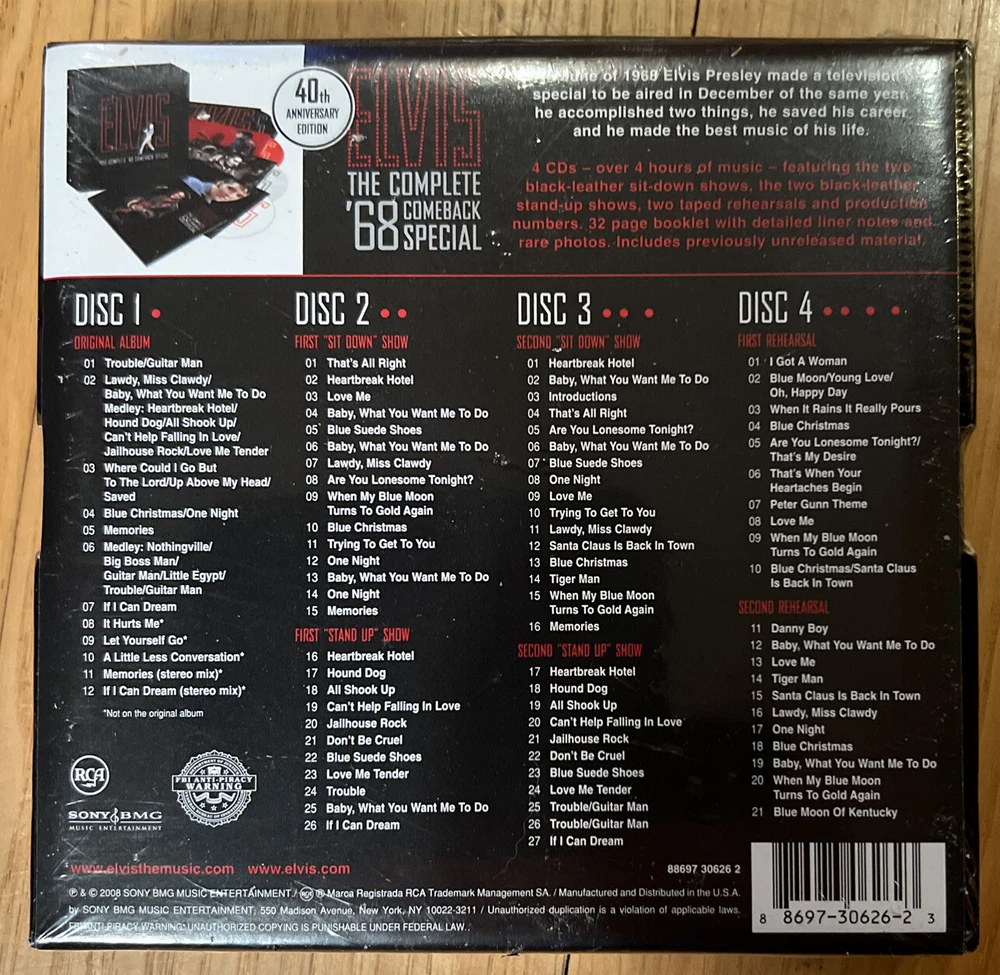This Elvis Presley box set is a must-have for any fan of rock and roll. The 40th anniversary edition of "The Complete '68 Comeback Special" features two taped rehearsals and production numbers, as well as previously unreleased material. The set also includes a 32-page booklet with detailed liner notes and rare photos, making it a collector's item for any music enthusiast. With a total run time of 4 hours, this CD set is a perfect addition to any music collection. This box set is a perfect way to celebrate the legendary Elvis Presley's 40th anniversary in style.