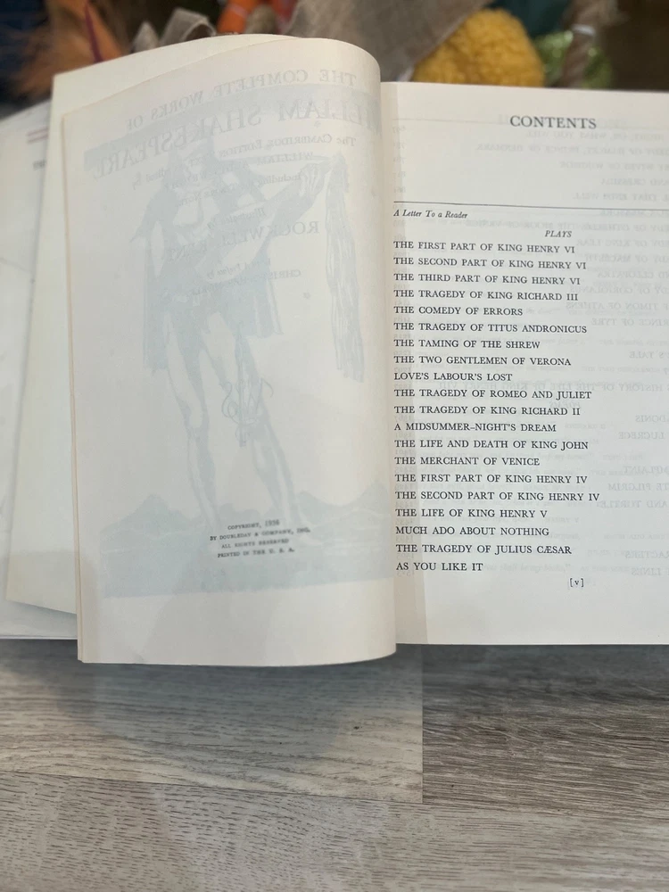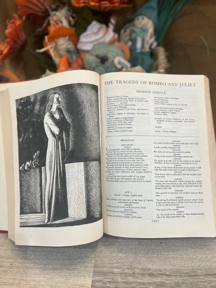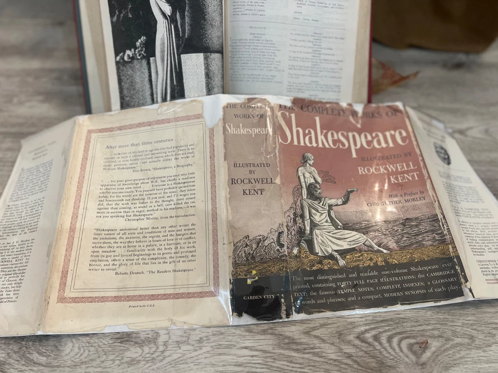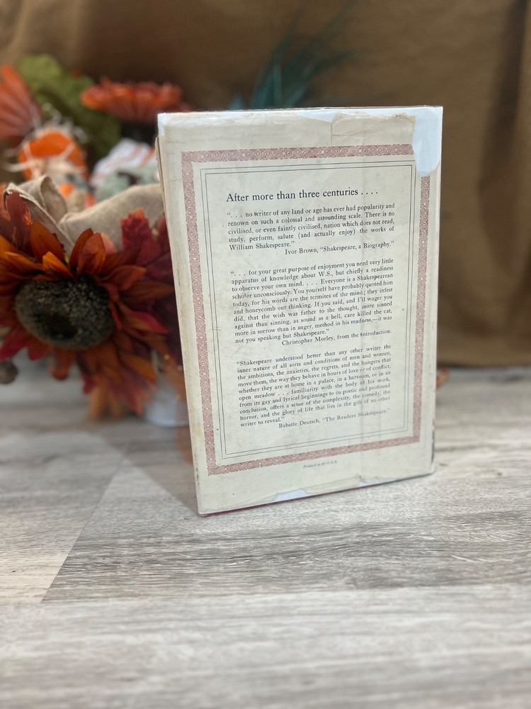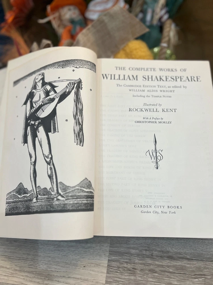 📖 The Complete Works of William Shakespeare (1936) – Illustrated by Rockwell Kent – Garden City Books – Original Dust Jacket This is the classic 1936 Rockwell Kent illustrated edition of The Complete Works of William Shakespeare , published by Garden City Books , featuring the Cambridge text edited by William Aldis Wright. Kent’s bold black-and-white illustrations have made this edition one of the most collected 20th-century Shakespeare printings. This copy includes its original dust jacket , now scarce, especially in any condition. 📌 Condition Overall Condition: Good / Good- (Please review all photos closely — they are part of the description.) Dust Jacket Original 1936 jacket Noticeable tears, chips, and creases Edge wear and surface wear consistent with age Still displays well and remains uncommon in any condition Book Boards are clean with bright red/gray cloth Gold spine and cover lettering still clear Binding is tight and secure No loose pages Pages are clean with age-appropriate toning and light foxing Previous owner inscriptions from 1966 on front endpaper All Rockwell Kent illustrations present and sharp 📚 Details Title: The Complete Works of William Shakespeare Illustrator: Rockwell Kent Publisher: Garden City Books Date: 1936 Edition: Cambridge Edition Text Pages: 1527 pages (approx.) Format: Hardcover with dust jacket ⭐ Why This Edition Is Special Rockwell Kent illustrations are highly collectible Large, readable format Includes Temple Notes, glossary, synopses, and complete works Original dust jacket is RARE Increasingly sought after by collectors and décor buyers 🚚 Shipping Will be shipped securely in a box , padded and protected Smoke-free home Ships within 1 business day 🛍️ A Beautiful, Collectible Shakespeare Edition Perfect for collectors, readers, home libraries, dark academia décor, or fans of Rockwell Kent’s artwork. If you have any questions or need additional photos, feel free to ask!