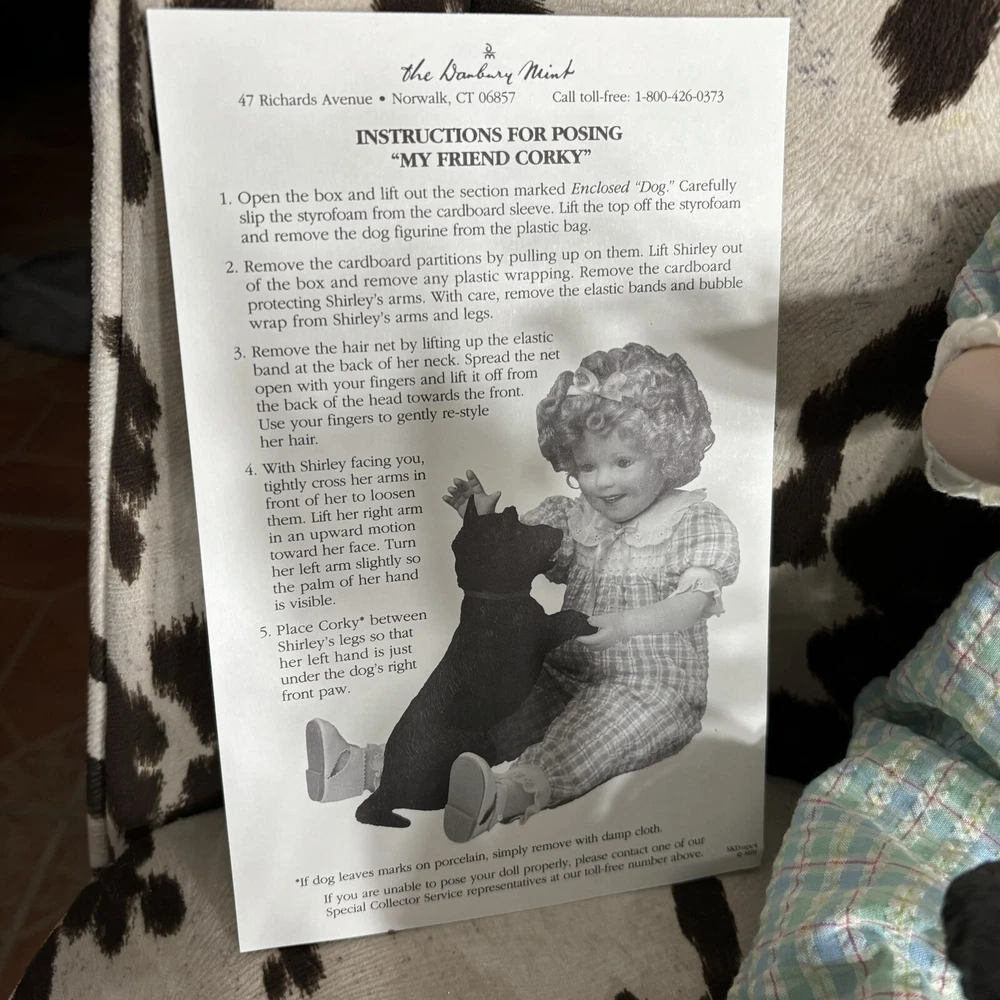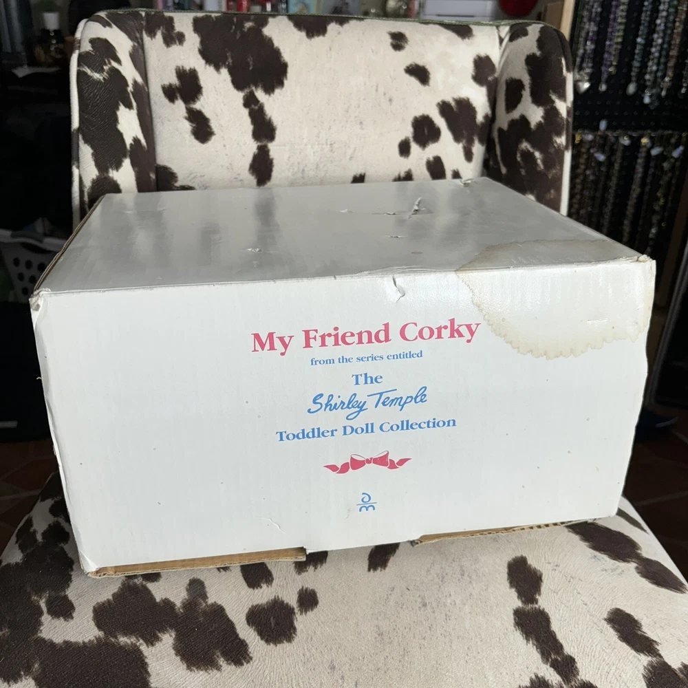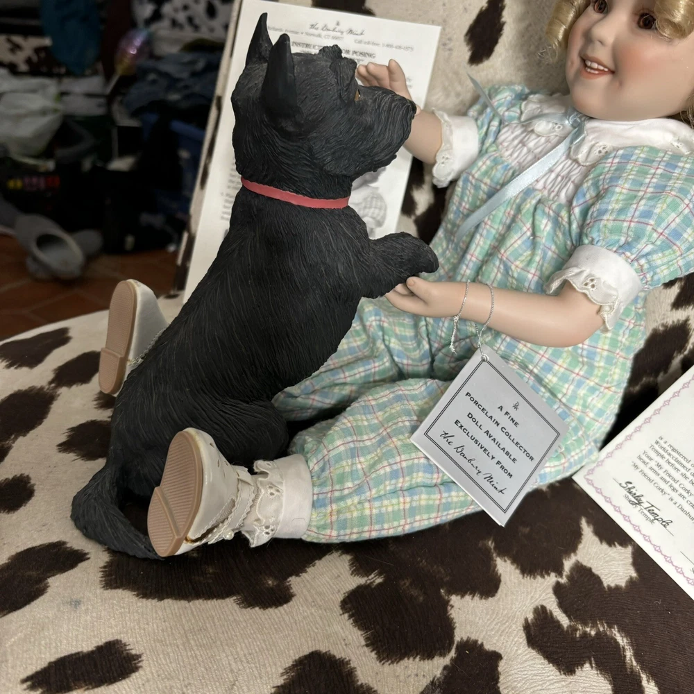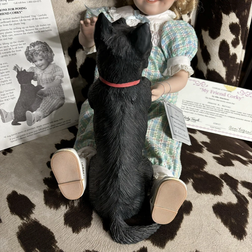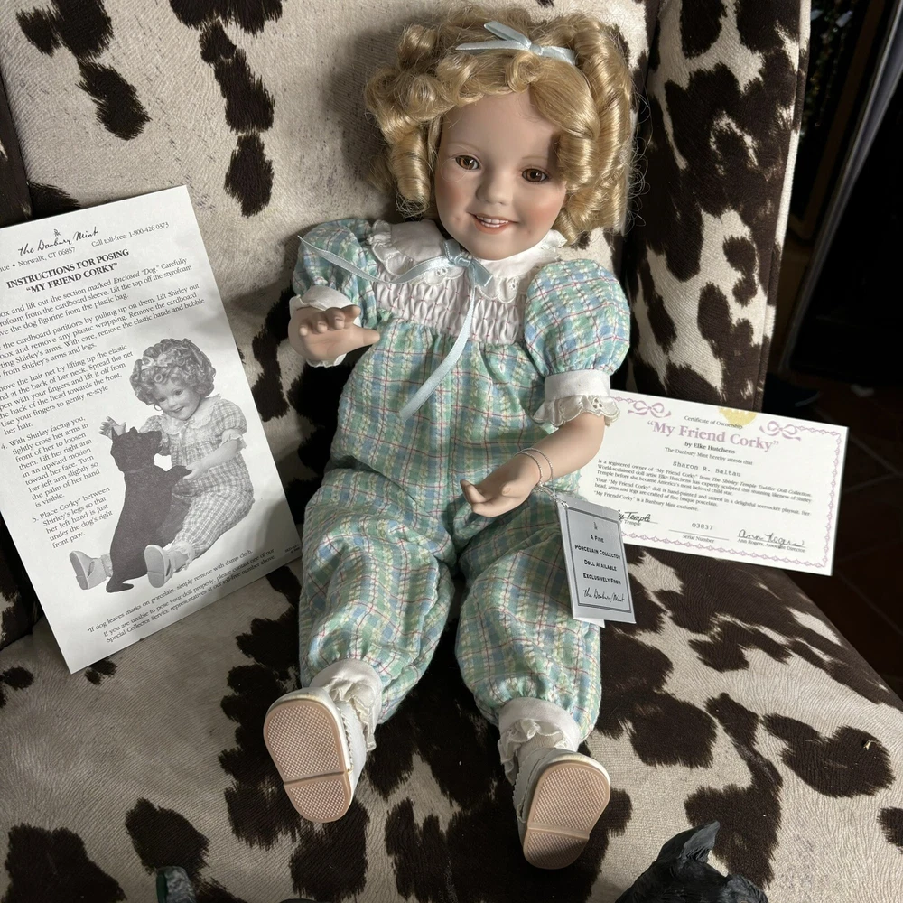 The Danbury Mint Shirley Temple and Dog ‘My Friend Corky’ Porcelain Doll New Brand new in box. Includes care sheet, posing instructions, and certificate of authenticity. Box has water damage and ware from storage, but no damage whatsoever to doll or dog. Vintage 1998 She measured approximately 11” in sitting position.