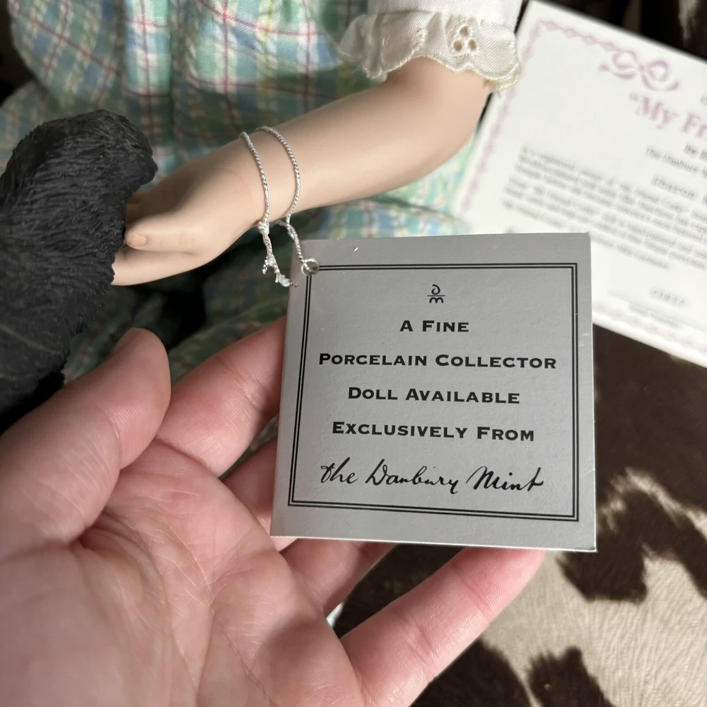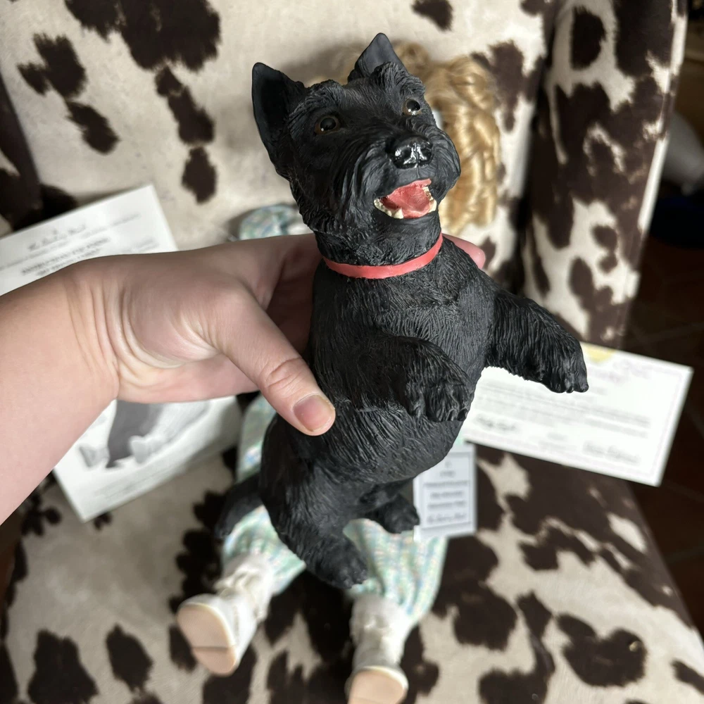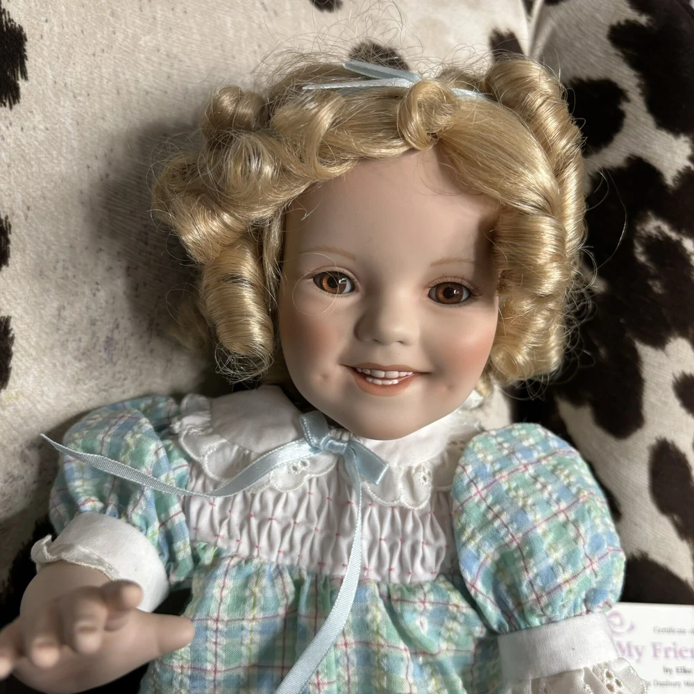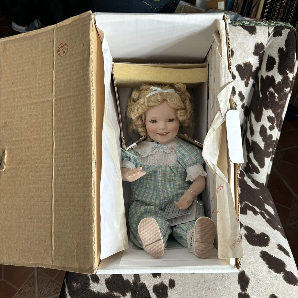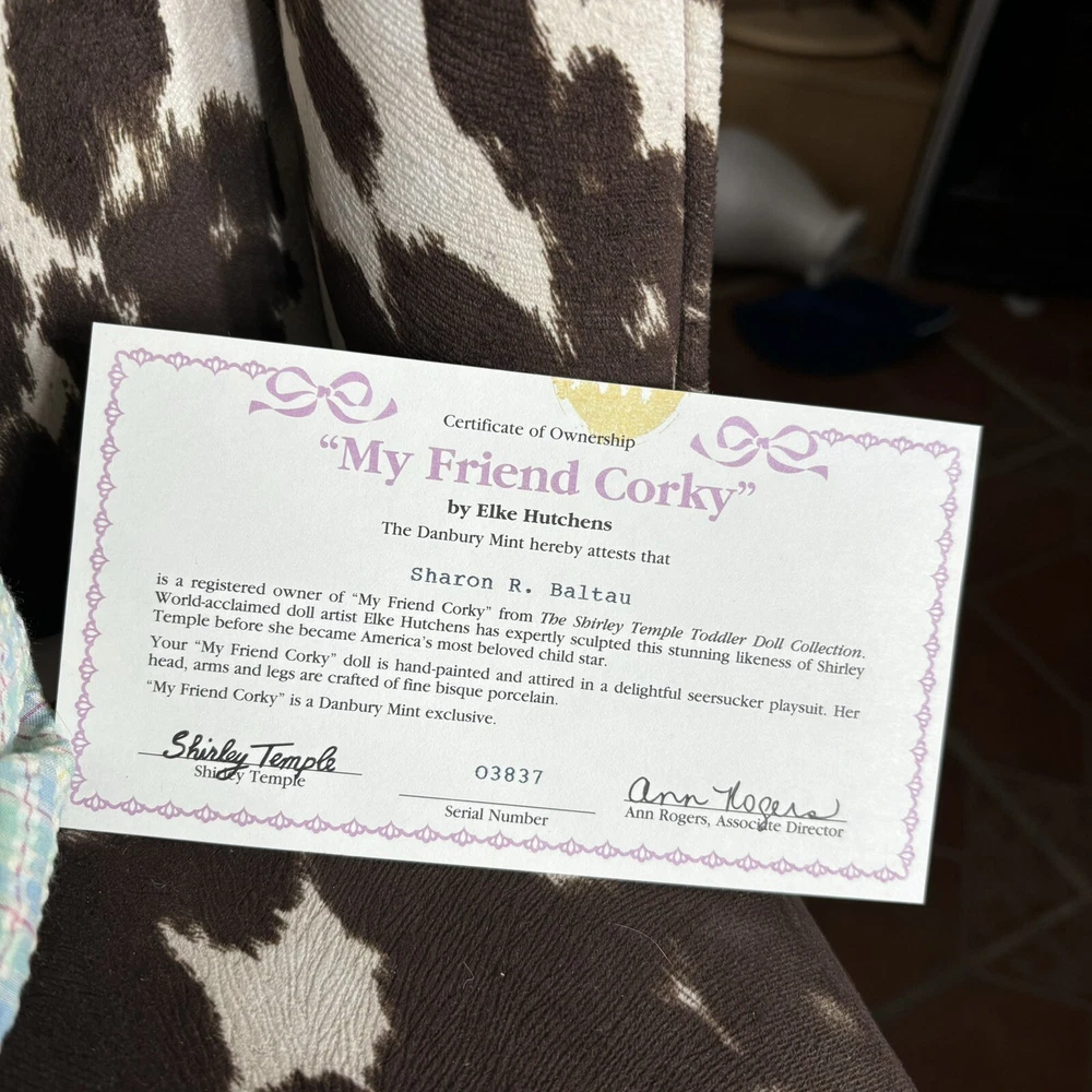 The Danbury Mint Shirley Temple and Dog ‘My Friend Corky’ Porcelain Doll New Brand new in box. Includes care sheet, posing instructions, and certificate of authenticity. Box has water damage and ware from storage, but no damage whatsoever to doll or dog. Vintage 1998 She measured approximately 11” in sitting position.