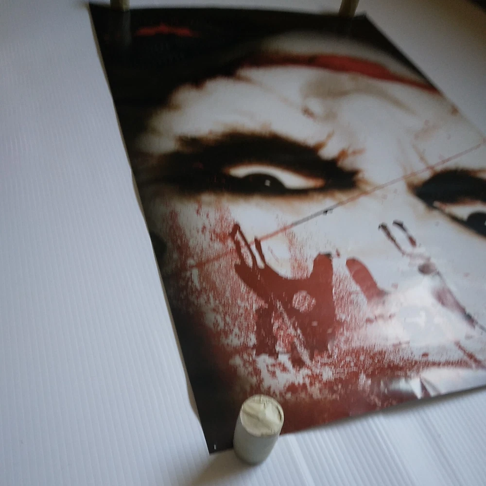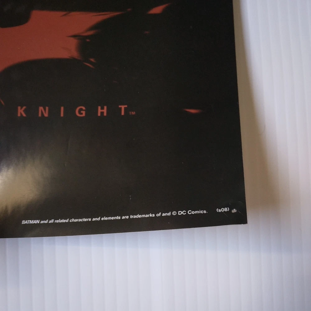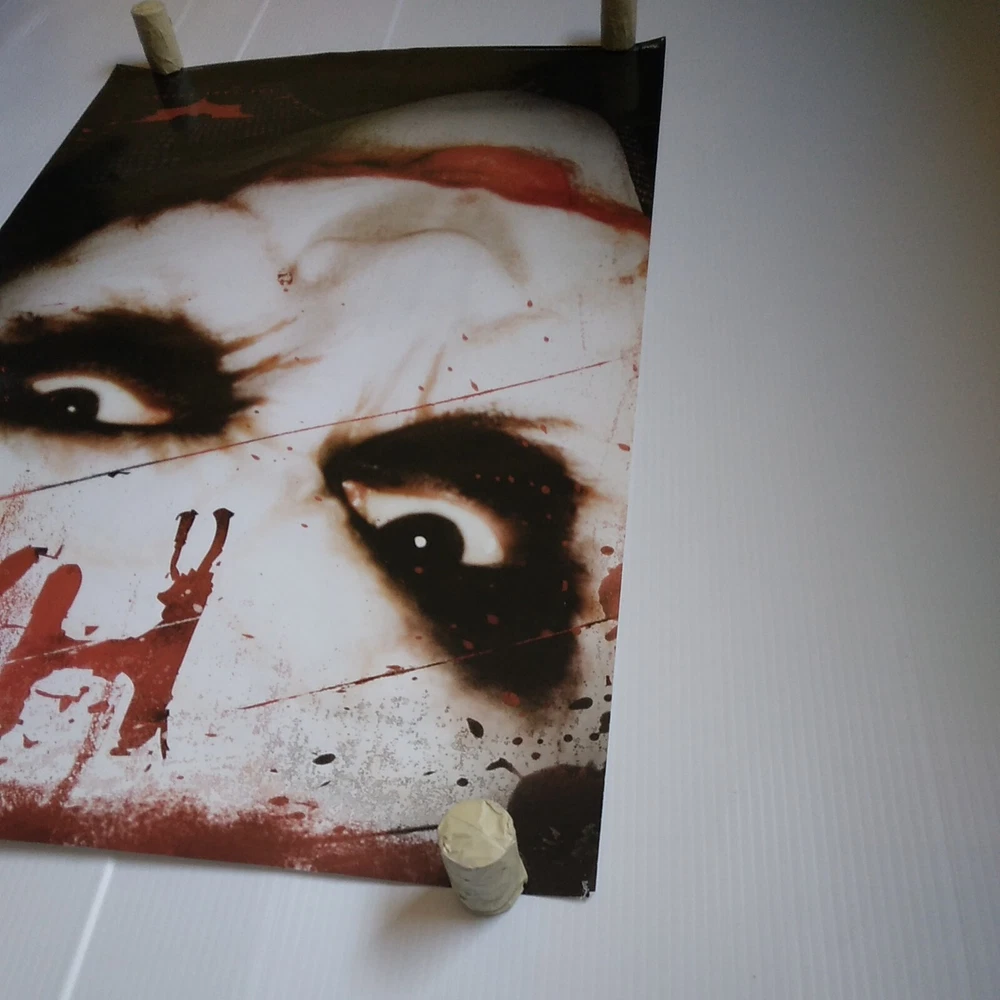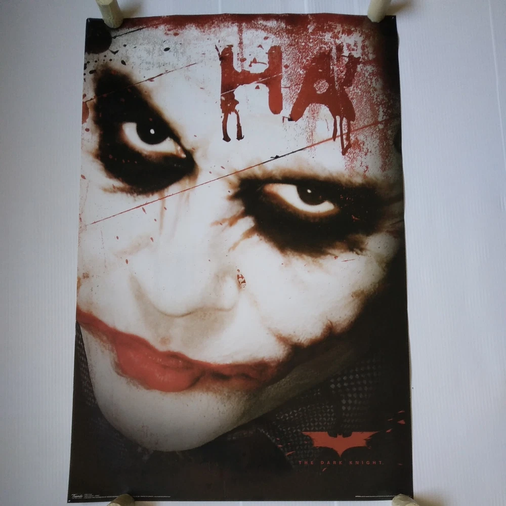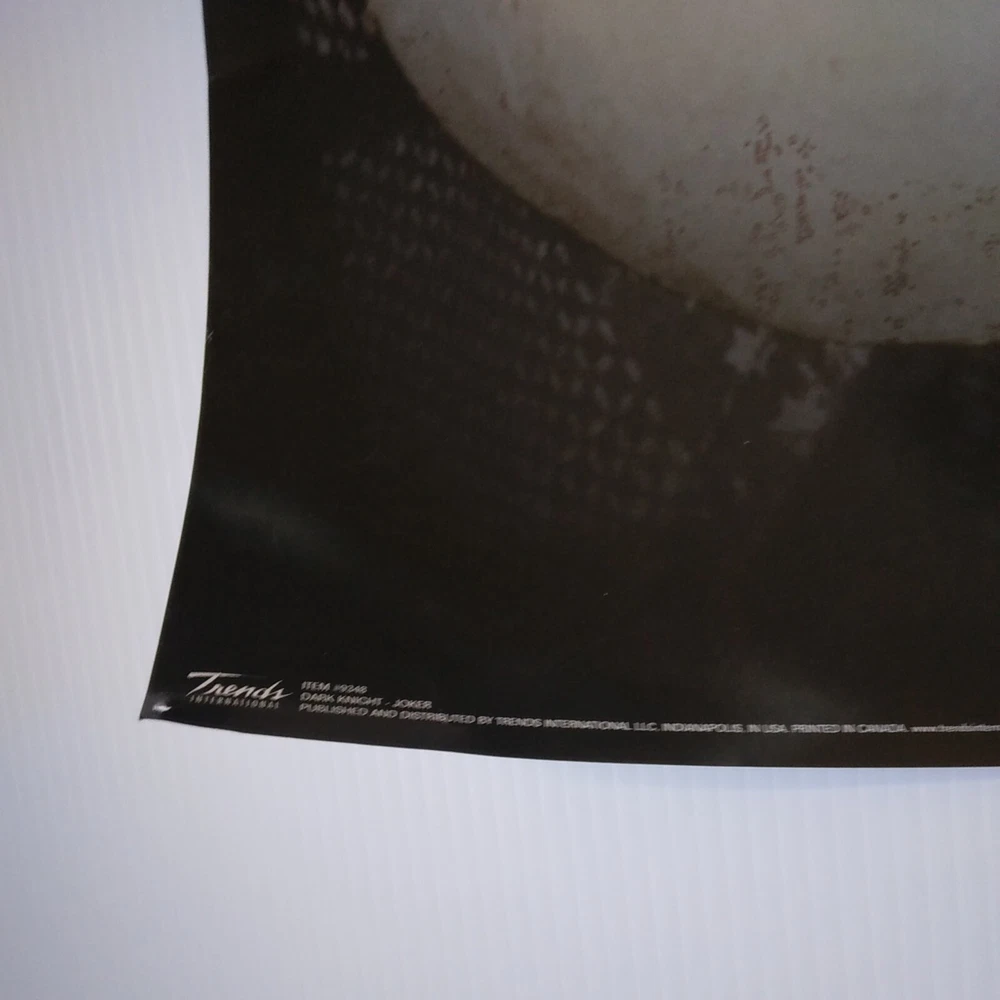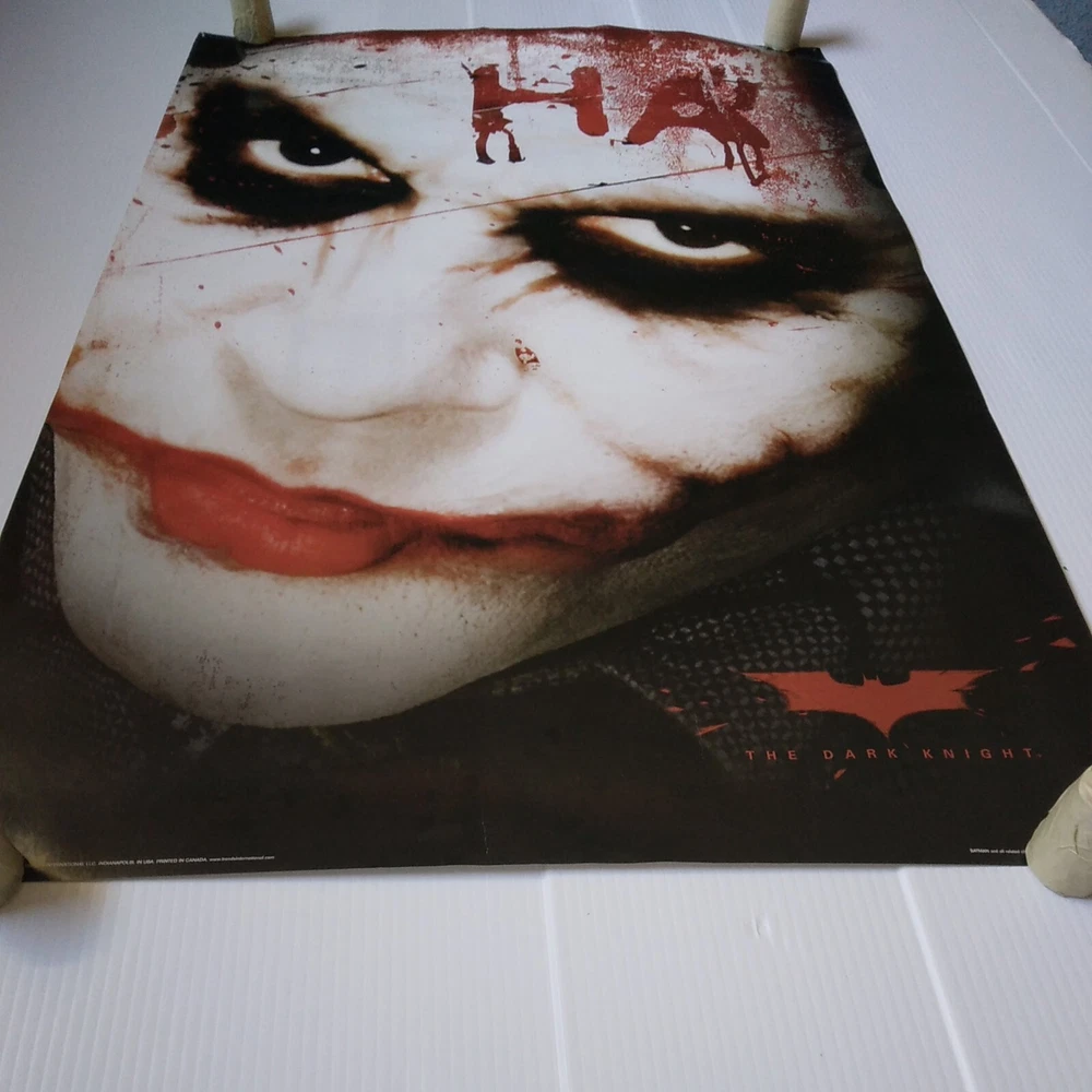 The Dark Knight Joker Movie Poster 34 inches tall by 22 inches wide. This poster is in overall good shape. Has some pinholes and slight wear at the edges. See pictures for a detailed look. Will ship well protected. Thanks for the interest.