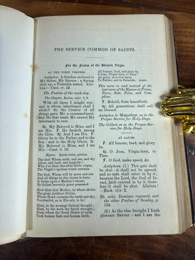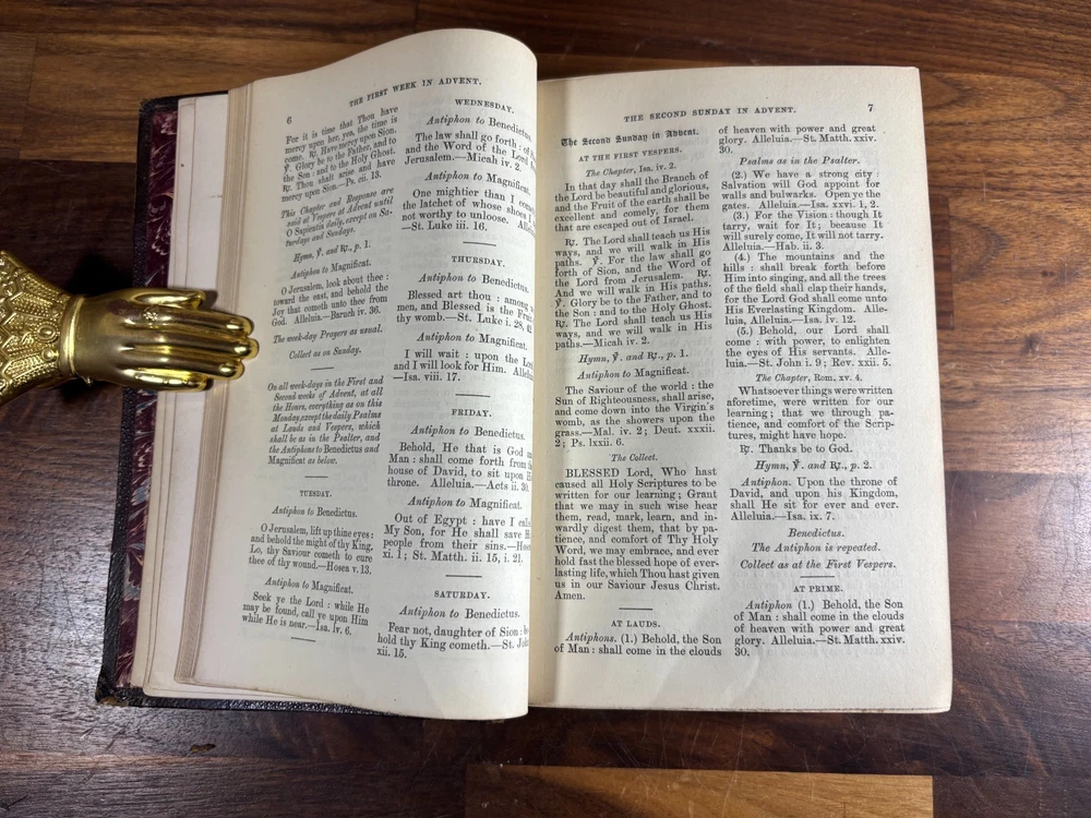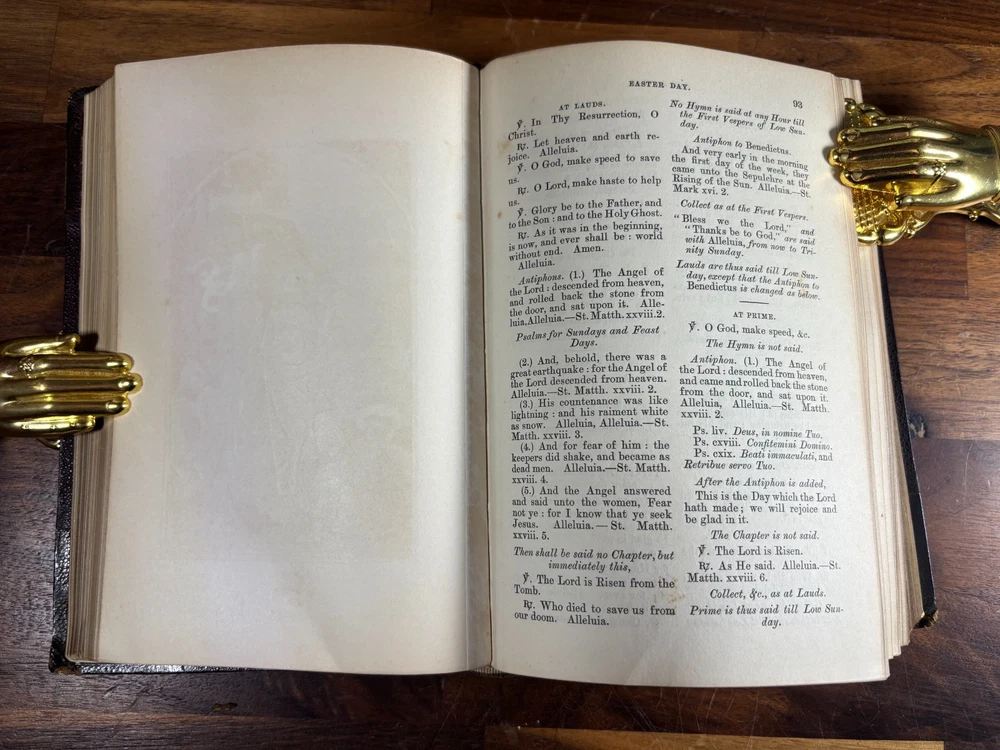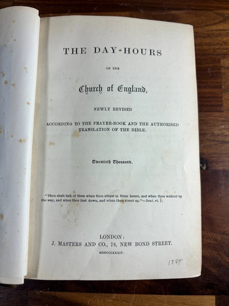 eBay Title: 1884 Day-Hours of the Church of England – Illustrated – Pustet Engravings, J. Masters London Item Description: Antique Anglican Devotional – Beautifully Illustrated with Pustet Plates Published 1884 by J. Masters & Co., London This is a rare and beautifully preserved original 1884 edition of The Day-Hours of the Church of England , newly revised according to the Book of Common Prayer and the Authorized (King James) Bible . A devotional Book of Hours designed for private or corporate use, reflecting the daily rhythm of Christian prayer in the Anglican tradition. Key Features: Publisher: J. Masters & Co., 78 New Bond Street, London Printed in: MDCCCLXXXIV (1884) Edition: "Twentieth Thousand" – evidence of its wide 19th-century popularity Illustrated by: Fr. Pustet, Ratisbonae (Franz Pustet of Regensburg) – renowned 19th-century Catholic ecclesiastical printer and engraver Binding: Leather binding Language: English Format: Small Octavo Illustrations: This edition features ornate devotional plates engraved by the world-renowned Catholic printer Fr. Pustet of Ratisbon (Regensburg) . These richly detailed engravings were originally produced for Roman liturgical books and were adopted in this Anglo-Catholic publication for their beauty and reverence. Perfect for lovers of liturgical art, high church design, or 19th-century devotional publishing. Ideal For: Collectors of Anglican devotional books Liturgical historians and researchers of the Oxford Movement Those interested in 19th-century religious illustration Lovers of antique Book of Hours traditions Fine press enthusiasts or ecclesiastical art collectors Dimensions: Weight - 686g Height - 18.5cm Width - 13.5cm Thickness - 4.5cm
