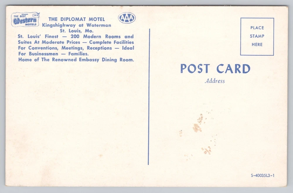 Vintage Chrome Postcard Unposted The Diplomat Motel Multiview St. Louis, Missouri, MO See Pictures For Condition. Card will be shipped using EBAY Standard Envelope Service. To US buyers only, no international. Be Sure To Browse Our eBay Store, We Have A Growing Postcard Inventory. Pick The SAVE SELLER Button To Get Notified Of New Items. You are purchasing the item in the pictures, I provide as many pictures as I can, from various angles. I WILL point out flaws when I see them in the pictures or the item description. Any stands or hangers used in the pictures are NOT included with the item listed. PLEASE TAKE A LOOK.. YES! I DO COMBINE ITEMS Please let me know when you are finished shopping and I will send you a corrected invoice. Free shipping items can be shipped with charged shipping items. Please pay for item(s) within 2 days of end of listing. We will ship out within 1 business days of receiving payment. Thank you for looking and feel free to ask questions. We will respond as soon as possible. Again Thank You for looking.