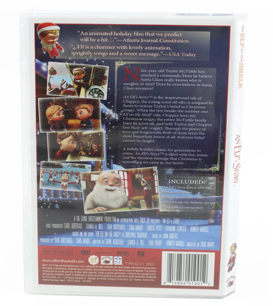 The Elf on the Shelf An Elf's Story: DVD Product Description A beloved Christmas classic. An Elf's Story is filled with fun, music, and the timeless message that Christmas is something we carry out in our hearts. An Elf's Story is the inspirational tale of Chippey, the enthusiastic young scout elf who is assigned by Santa to restore Taylor McTuttle's belief in Christmas magic. When Taylor breaks the number one Elf on the Shelf rule and touches Chippey in a boyish act of defiance, the elf loses his Christmas magic. Through the power of love and forgiveness, both Taylor and Chippey learn that true belief cannot be taught. Based on the bestselling The Elf on the Shelf: A Christmas Tradition DVD includes the 23-minute holiday special, TV trailer, behind-the-scenes, and filmmaker's commentary Debuted in 2011 An Elf's Story DVD. From the Manufacturer Nine year old Taylor McTuttle has reached a crossroads. Does he believe Santa Claus really knows who is naughty or nice? Does he even believe in Santa Claus anymore? An Elfs Story is the inspirational tale of Chippey, the enthusiastic young scout elf who is assigned by Santa to restore Taylors belief in Christmas magic. When Taylor breaks the number one Elf on the Shelf rule and touches Chippey in a boyish act of defiance, the elf loses his Christmas magic, the entire McTuttle family loses its scout elf and both Taylor and Chippey lose their self-respect. Through the power of love and forgiveness, both of them learn that true belief cannot be taught. A family holiday classic for generations to come, An Elfs Story is filled with fun, music and the timeless message that Christmas is something we carry in our hearts. The DVD includes the 23-minute holiday special, TV trailer, behind-the-scenes video, filmmakers commentary and a code for special website access to Santas secret shipping yard. Features Based on the bestselling Christmas tradition The Elf on the Shelf Includes code for Santa's Secret website Debuted on national television in 2011 to over 5 million viewers Details Fast and Free Shipping You're already purchasing the item. Why pay additional for shipping, especially slow shipping? We get your order shipped out within 1-business day and delivered to your doorstep as quickly as possible. Competitive Pricing With our dynamic pricing model, our prices are always competitive. Our prices are some of the lowest that you will find on the internet. Rest assured that you're getting a good deal when purchasing with us. 30-day Money Back Guarantee We are committed to making sure that you leave this transaction satisfied. If you're unhappy with the product for any reason, you may return it back for your money-back or a replacement within 30 days. No questions asked!