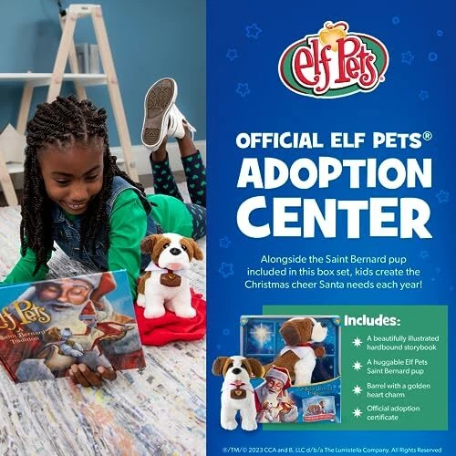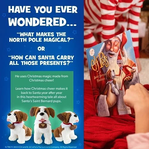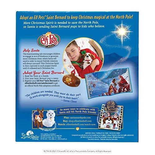 Meet the newest addition to The Elf on the Shelf collection - the Elf on the Shelf Pets Book St. Bernard Dog Plush Animal! This adorable figurine is perfect for the Christmas season and comes in a small size of 9 inches in length and 4.3 inches in height, with a weight of 1 pound. The plush material and multicolor design make this St. Bernard dog a perfect addition to any collection. The figurine is boxed and comes with a book, making it a great gift for teens. The Elf on the Shelf Pets Book St. Bernard Dog Plush Animal is a traditional piece with a seasonal theme, perfect for any collector.