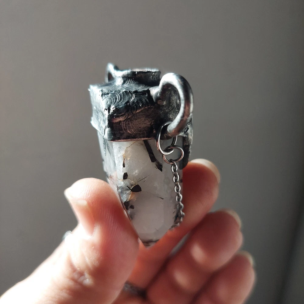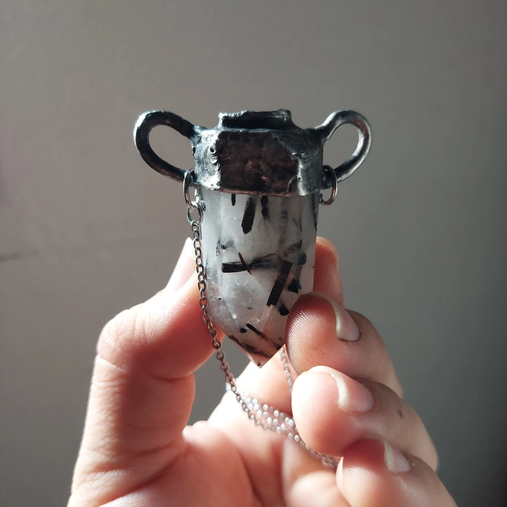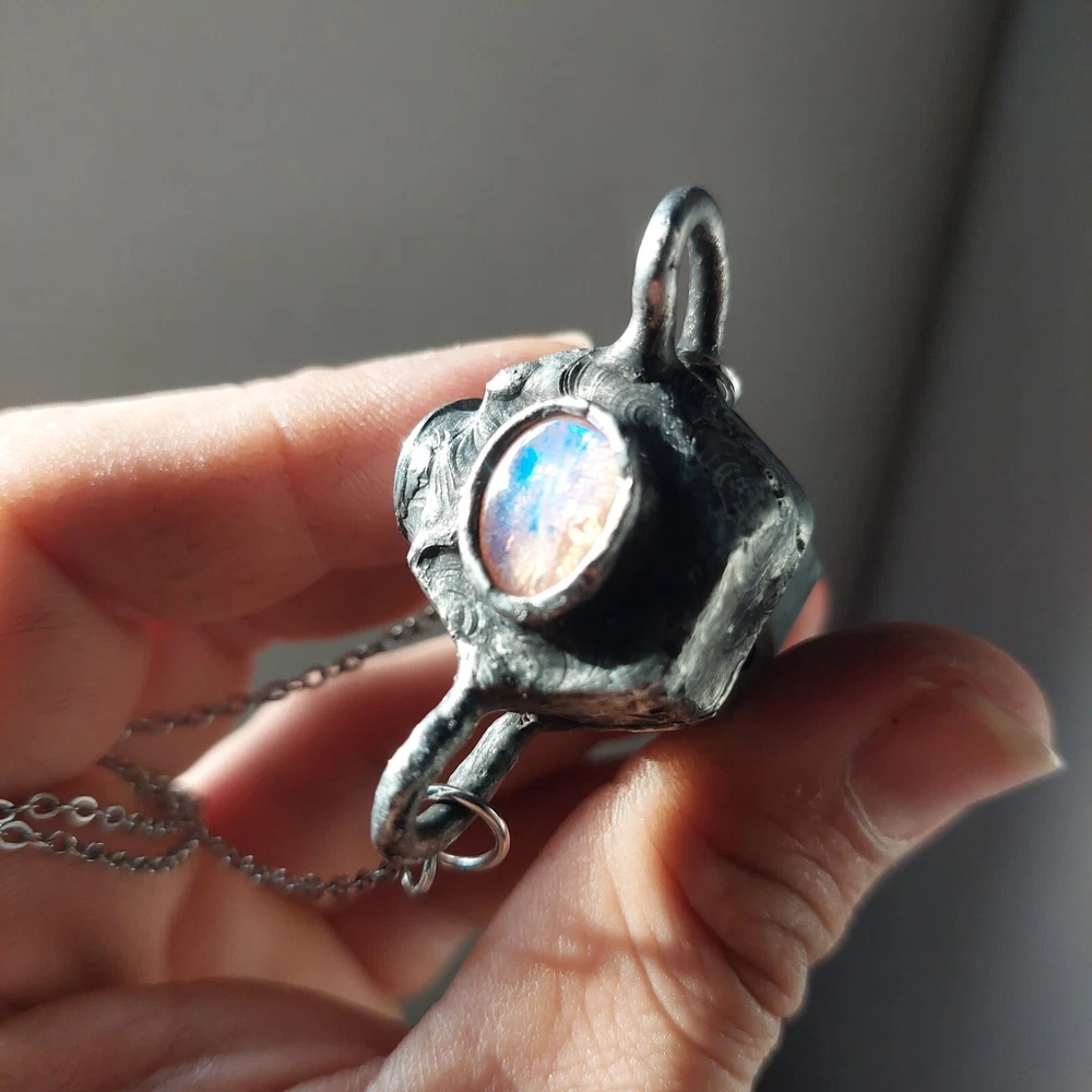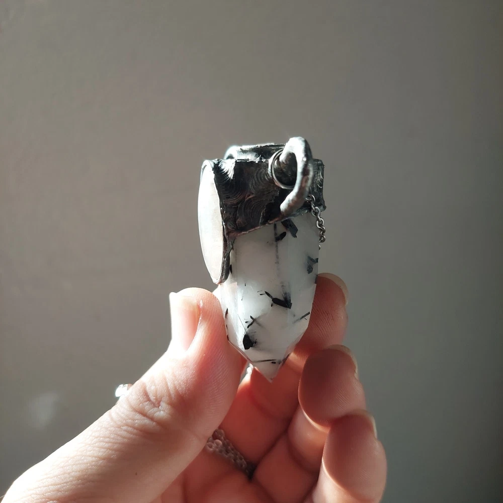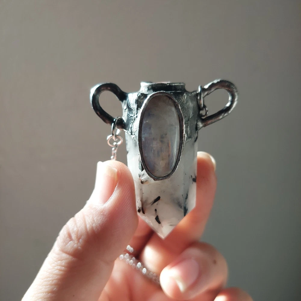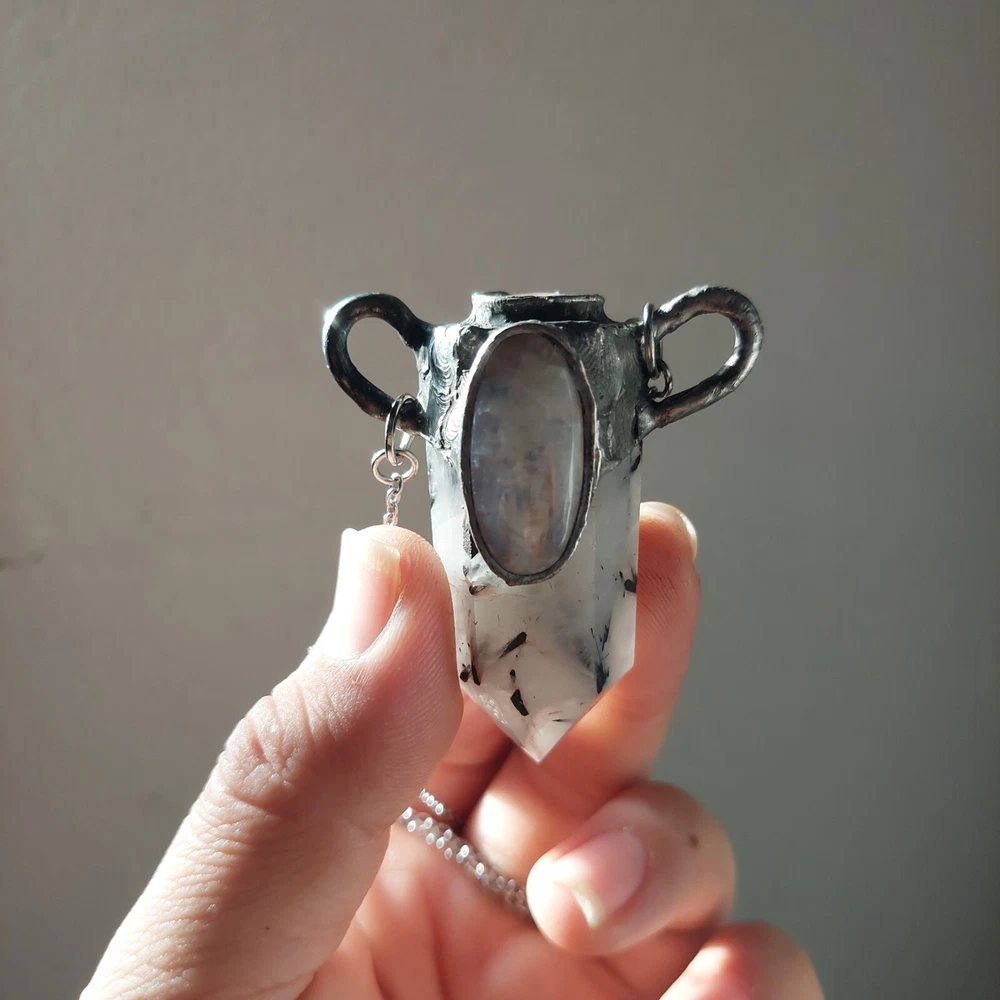 This gorgeous piece features rainbow moonstone on a black tourmaline in quartz polished point with moonstone also on its crown, measures approximately 2-3" and hangs on an 18-21" stainless steel silver chain. Jewelry is handcrafted with led free silver solder with a method called tiffany technique, using black patinas and a final polish to create an antique ancient magical feel to it. Tourmaline Quartz combines the properties of Tourmaline and Clear Quartz Crystal. Tourmaline purifies ones own energies and protects from negativity, while Quartz amplifies energies focused through it. This combination makes Tourmaline Quartz a powerful shield-stone that, depending on the desired intent of the wearer, can amplify and return negative energy, like a mirror spell, or can convert the negative energy into positive energy for the wearer. A stone for “new beginnings”, Moonstone is a stone of inner growth and strength. It soothes emotional instability and stress, and stabilises the emotions, providing calmness. Moonstone enhances intuition, promotes inspiration, success and good fortune in love and business matters.