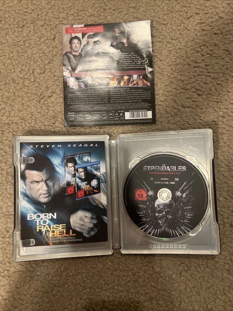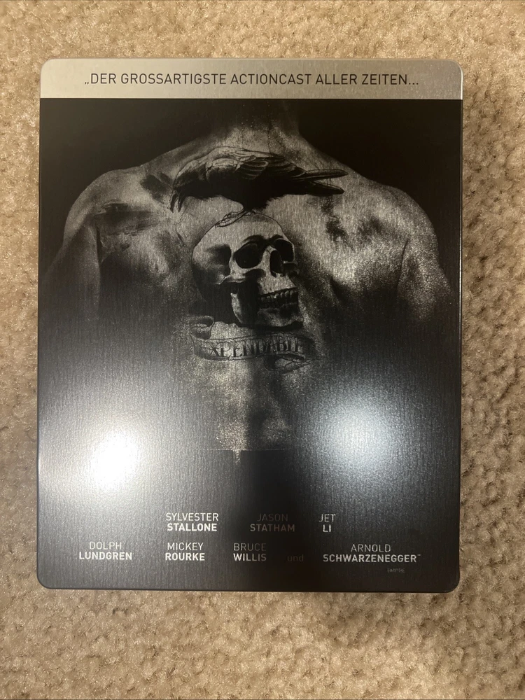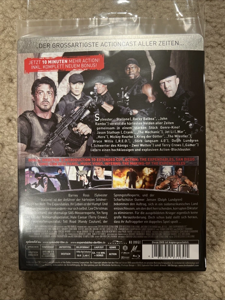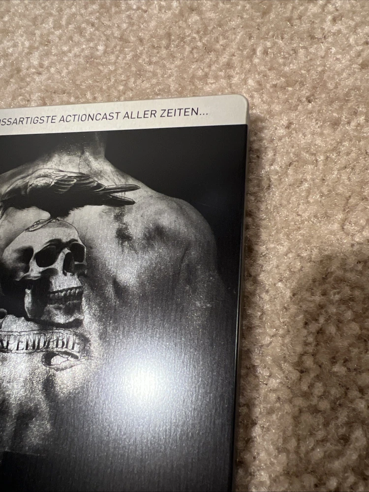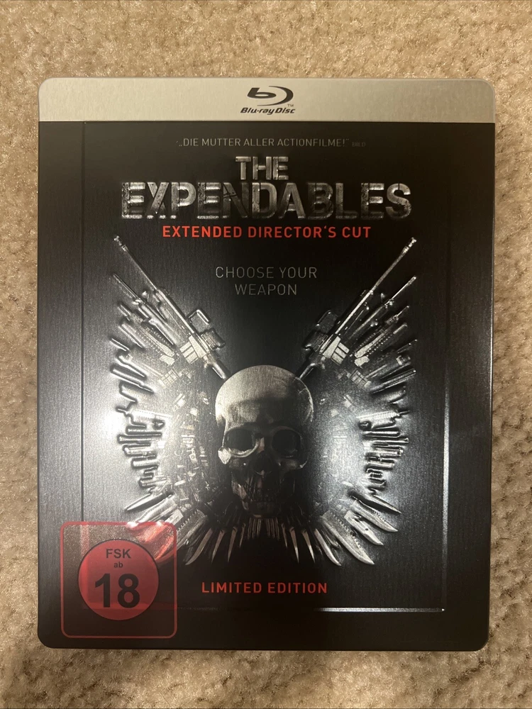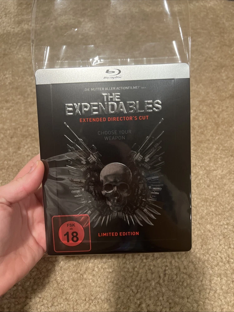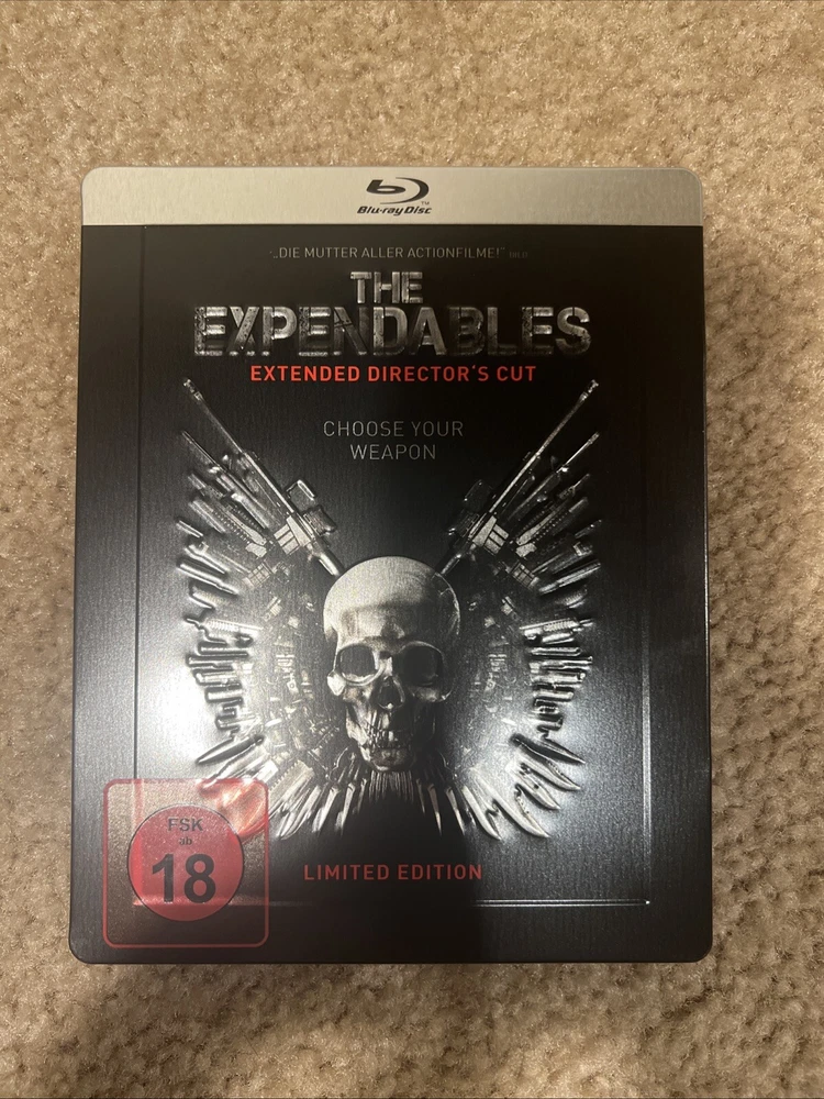 From my personal movie collection. No code. No disc scratches. No case dents or major scratches or chips. It is in like new condition. Being sold as is. See pictures for exact item you will receive. The Title "THE EXPENDABLES" Skull Logo and Border are all Embossed. This is a Germany Media Market Exclusive Release. The FSK Sticker is removable. This Blu ray is REGION B LOCKED and will Not play in a USA blu ray player. You will need a Region Free Blu Ray Player to Play This Disc. Thank you.