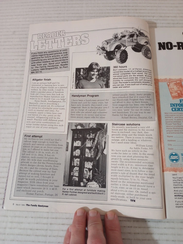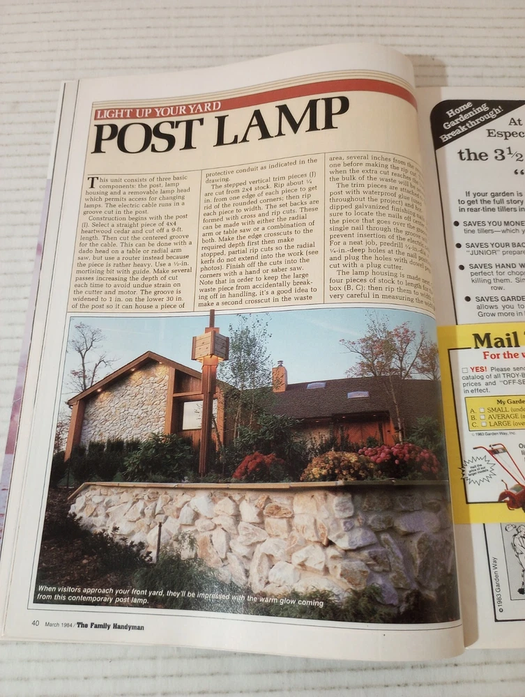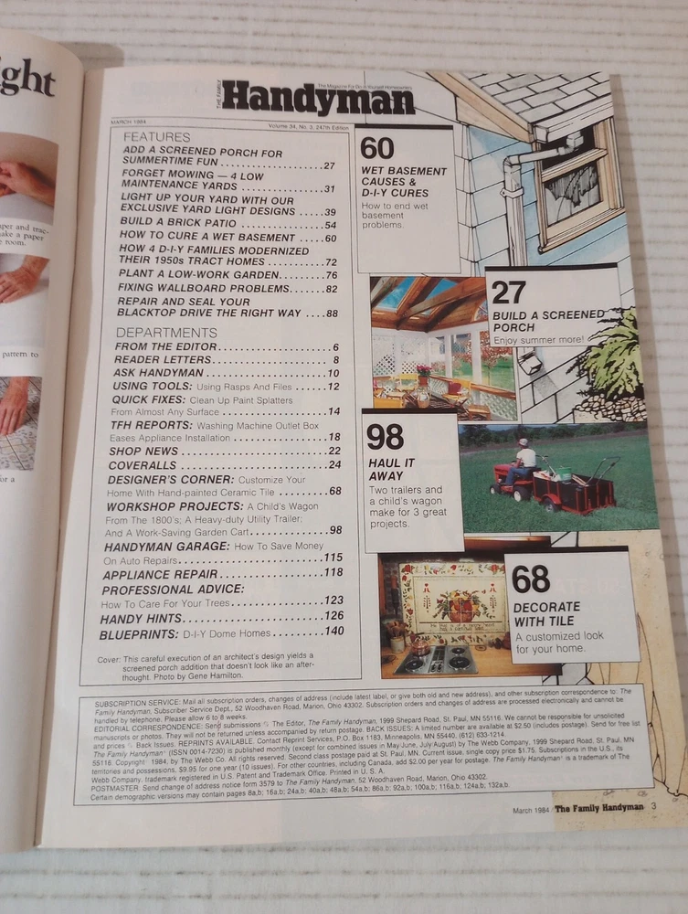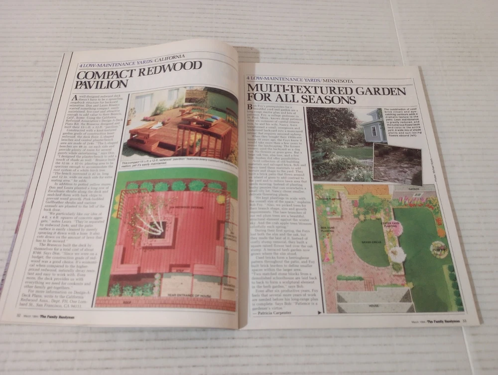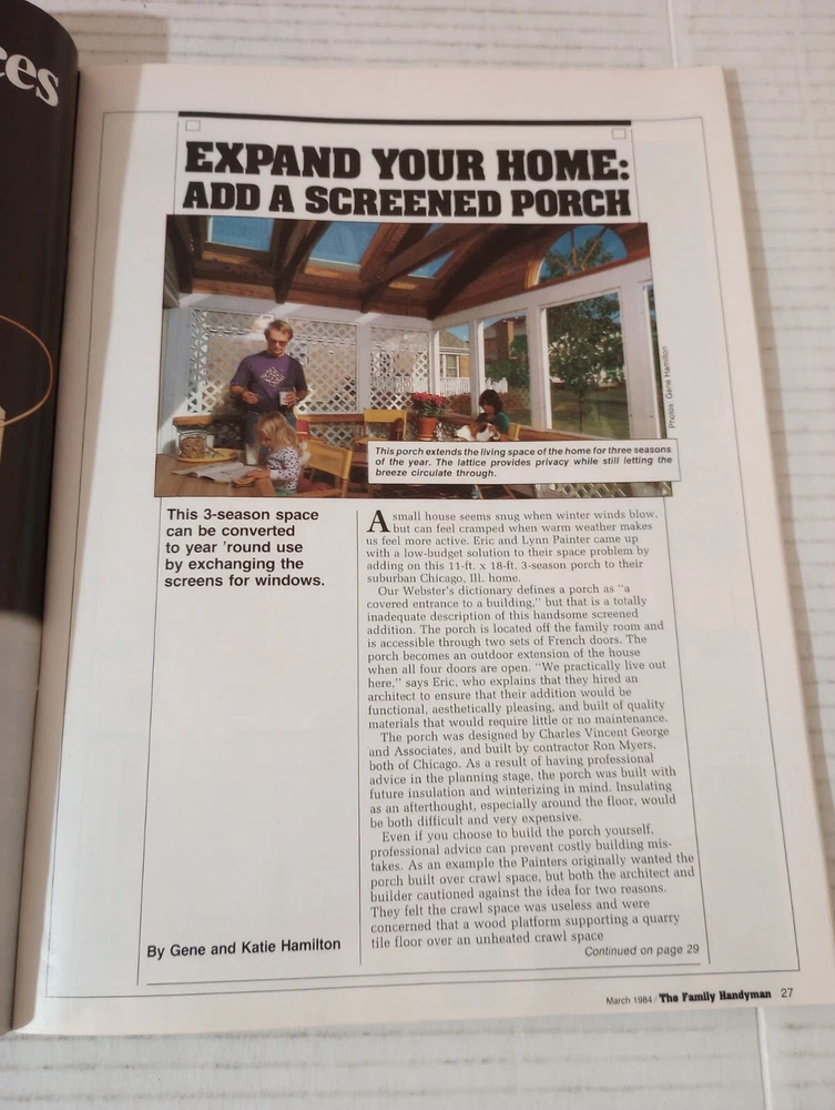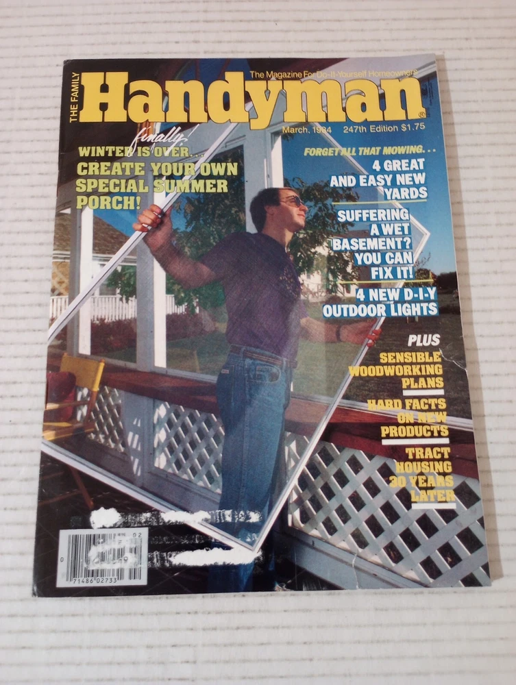 The Family Handyman DIY March 1984 Create Your Own Special Summer Porch. -Cover shows moderate wear. -Binding in excellent condition. -No writing on pages. -No missing pages. -See photos for details of condition and content. -Shipped with USPS Ground Advantage Mail or Priority Mail. -Also available for local pickup. We welcome offers counter offers and negotiation. We do not work on Sundays. Thank you for your time.