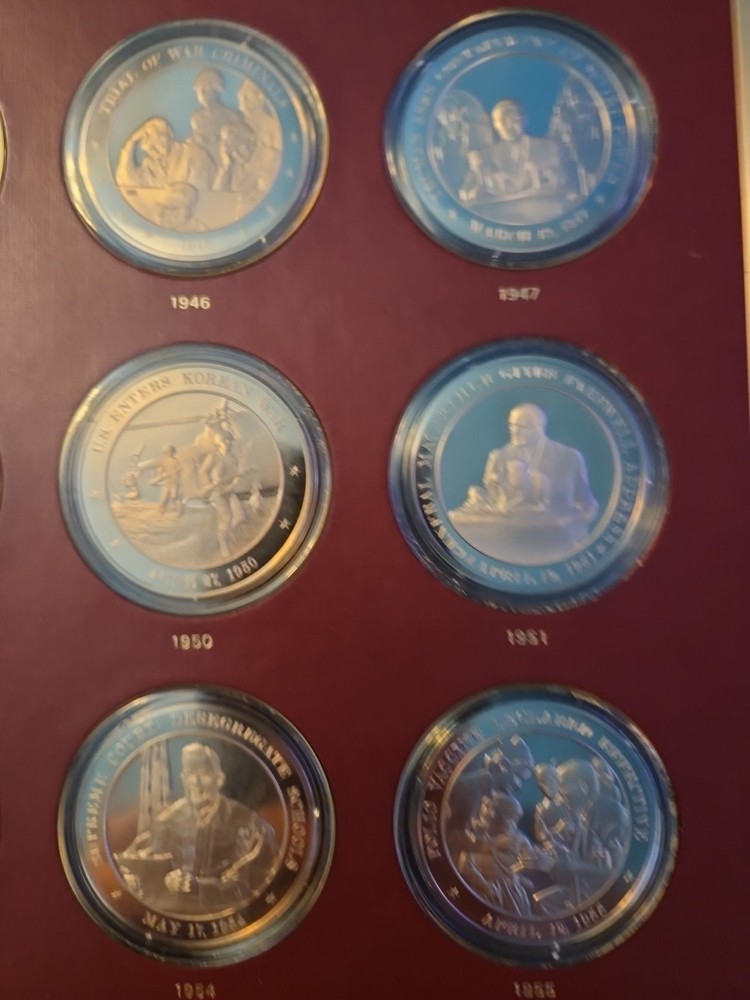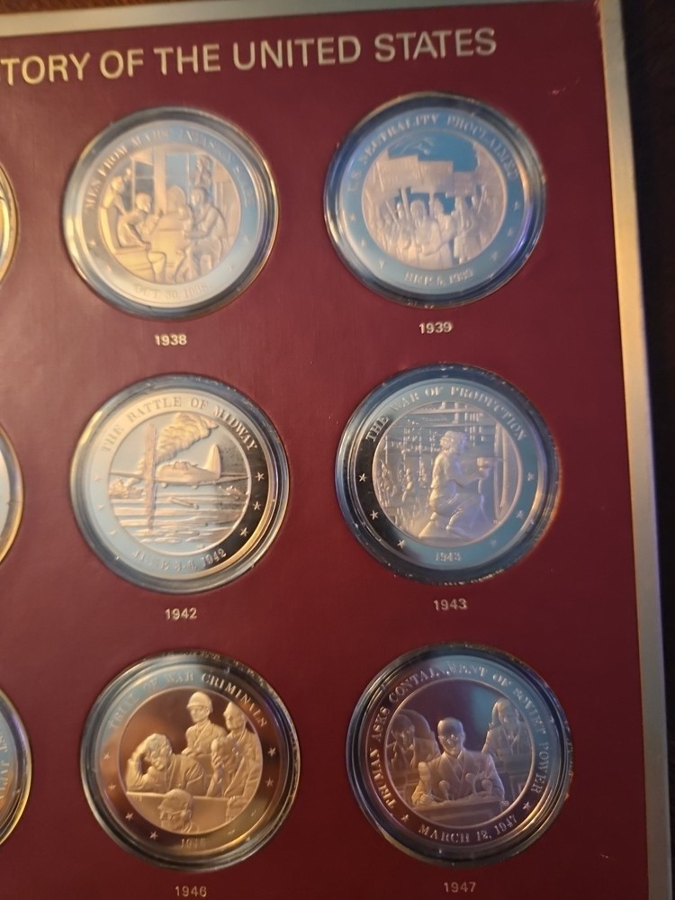 The Franklin Mint History of the United States is a collection of bronze medals showcasing key moments and figures in American history. Each medal is struck with a fineness of 0.999 bronze and is in uncirculated condition, making them valuable pieces for collectors and history enthusiasts. The brand, Franklin Mint, is known for producing high-quality coins and medals, adding to the appeal and authenticity of this series.From years 1936 to 1955. all coins are bronze enclosed in plastic cases. never been opened.