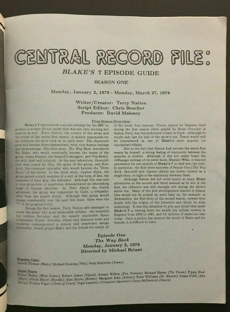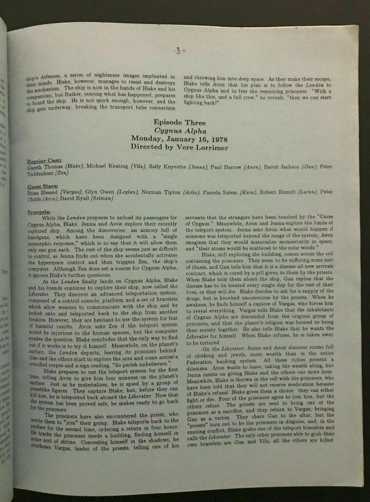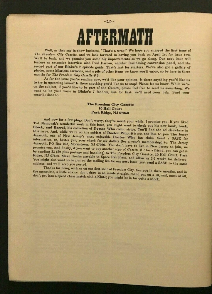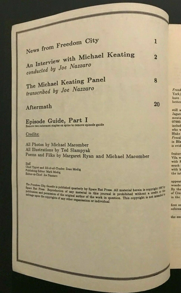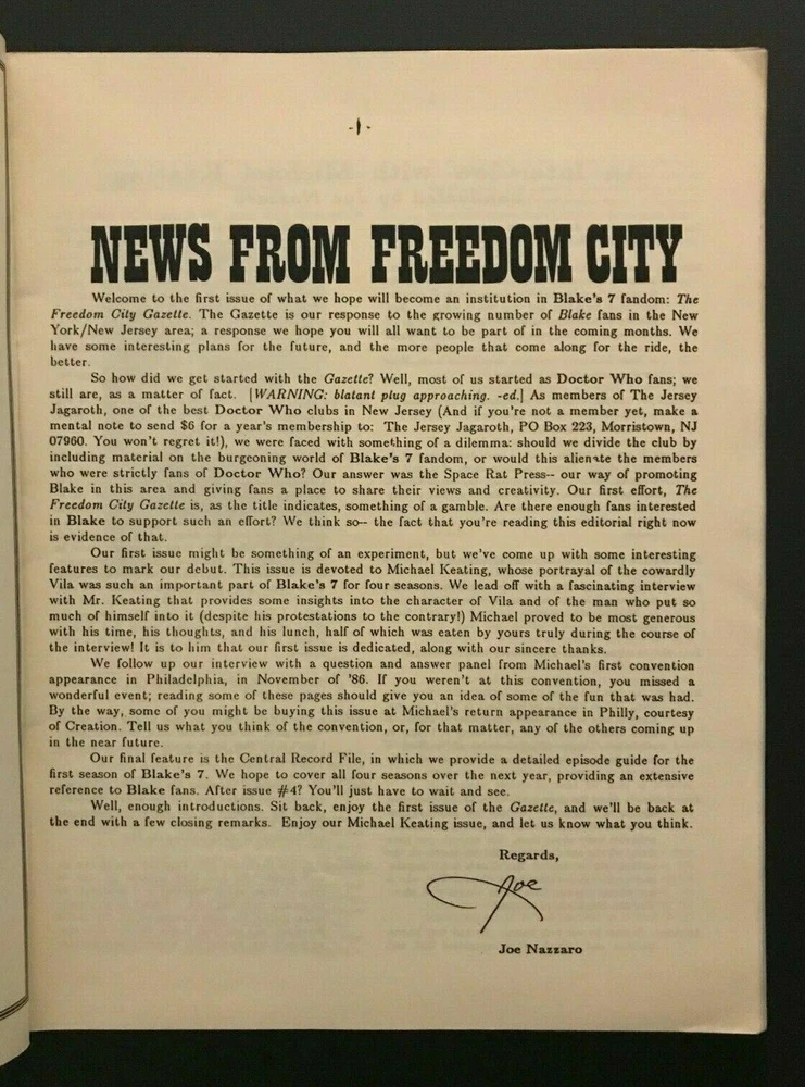 This Rare Space Rat Press Presents: The Freedom City Gazette Jan. 1987 is signed by Michael Keating and is in Excellent Condition. This is a First Issue from the Blake's 7 Fandom. The Gazette was created for the growing number of Blake's 7 fans in the New York/New Jersey area. Most of the creators of this Gazette were big Doctor Who Fans and Members of the Jersey Jargaroth a Doctor Who Fan Club. This First Issue was devoted to Michael Keating, whose portrayal of the cowardly Vila was such an important part of Blake's 7 for four seasons. The Booklet is lead off with a fascinating interview with Michael Keating that provides some insights into the character of Vila and the man who put so much of himself into it. This is an extraordinary selfless interview with Michael Keating. This is followed with a Central Record File, in which the issue has a detailed episode guide for the First Season of Blake's 7. There are many Candid Photos of Keating throughout the Booklet along with a Sketch of him on the back of the Booklet by Ted Slampyak 86' This is an Absolute Must Have for the Doctor Who/Blake's 7 Collector/FAN! RARE FIND! Signed: Audry - Love from Michael Keating (Inside of Last Page of Booklet), See pic. Pages: 20 Page Size: 8 1/2" x 11" You Receive The Space Rat Press Presents: The Freedom City Gazette Jan. 1987 Signed Michael Keating Issue in the Photos Abov e. Please be sure to check out the stores other items! New items listed on a daily basis! If you have any questions please feel free to email any time. Items will be shipped the next business day after payment has been made. Thanks for Shopping at Yobles & Please Come Back Soon! S Comes from a smoke-free and pet-free home .