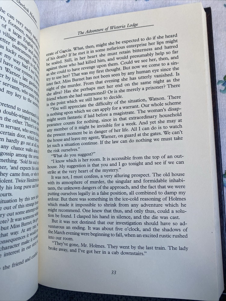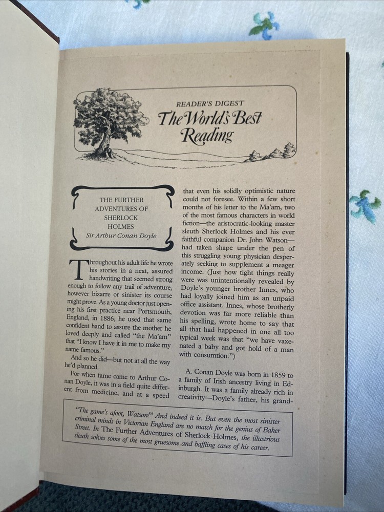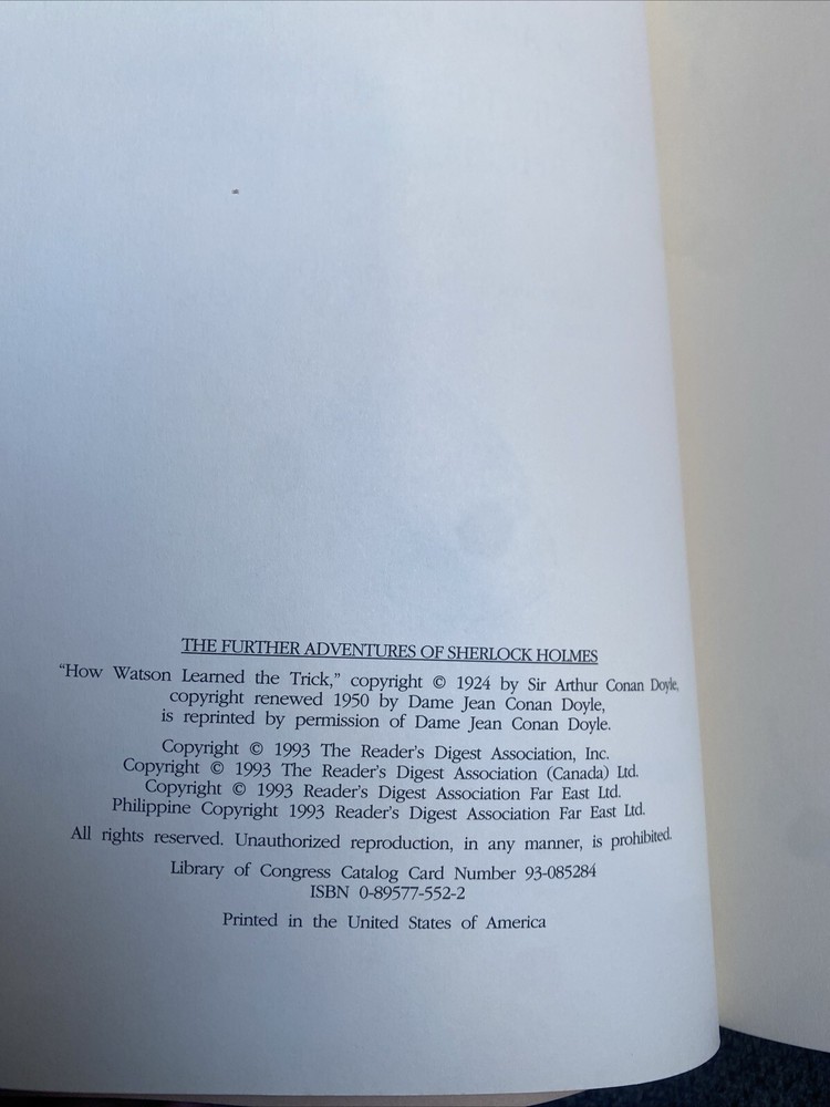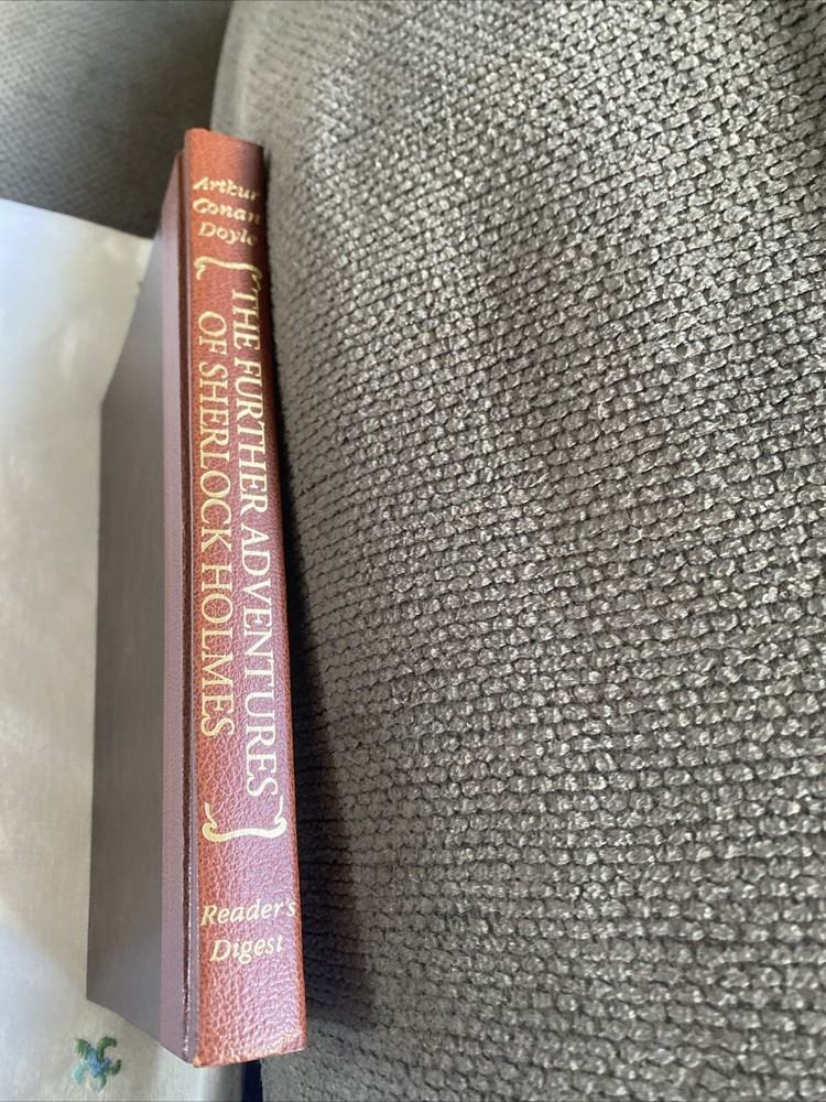 This hardcover book, titled "The Further Adventures of Sherlock Holmes", is a collector's edition published by Reader's Digest Association in 1993. The book is part of the Sherlock Holmes book series and features faux leather binding. The novel is written in English by Arthur Conan Doyle and is intended for young adults and adults. It has 219 pages and is published in the United States. The book is not signed or inscribed and does not have an ex libris. It falls under the genre of adventure and the topic of classic literature, crime, and novels.