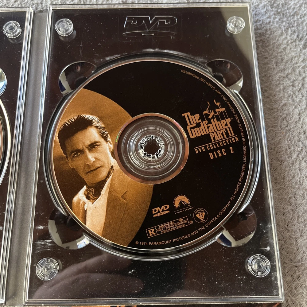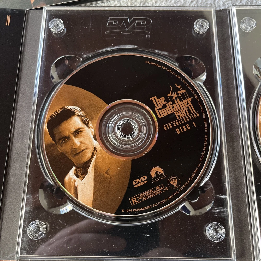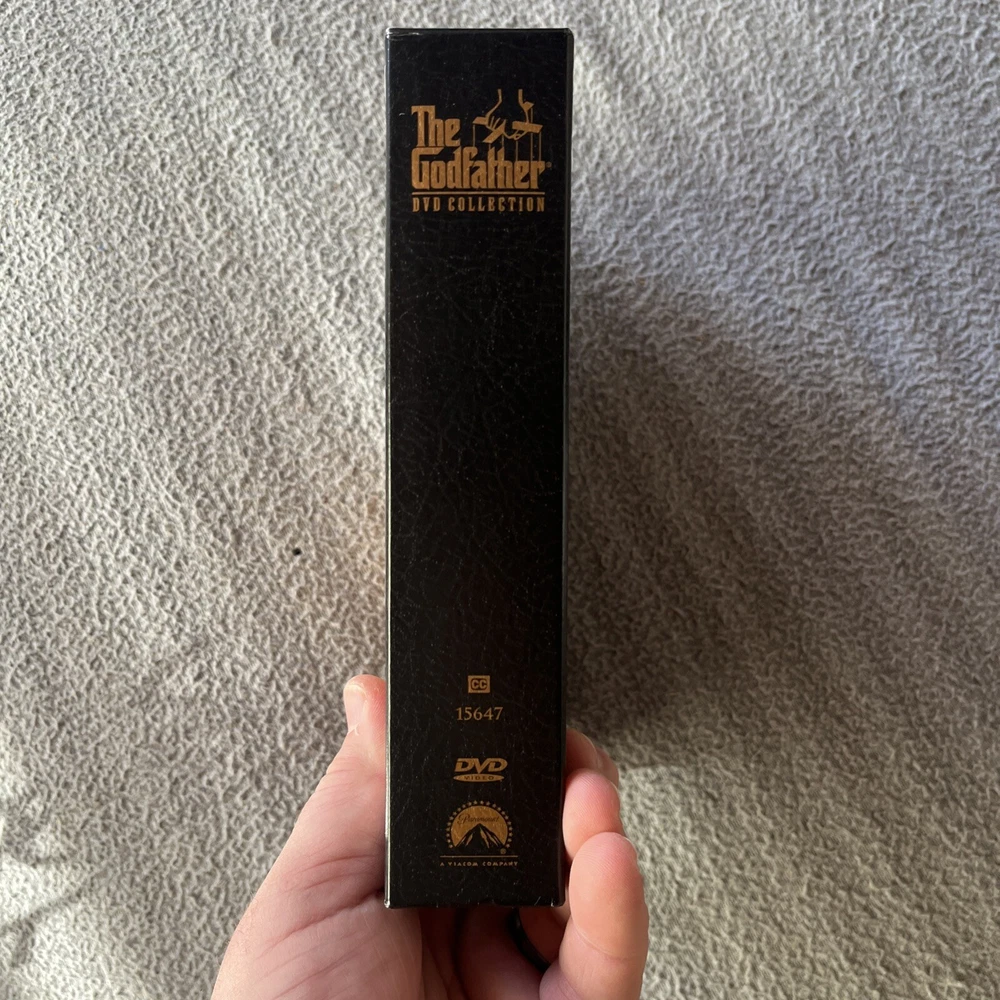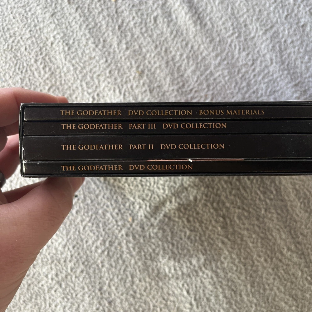 The Godfather DVD Collection in great condition. All DVDs are tested and working great. Perfect for anyone who wants to relive this epic saga. The product is "The Godfather DVD Collection I II III 2001, 5-Disc Set - Bonus Material." This set includes all three films in "The Godfather" series, featuring a star-studded cast including Al Pacino, James Caan, Marlon Brando, and Robert De Niro. The movies are in English with a crime sub-genre and a rating of R. This Collector's Edition Box Set also includes bonus material, making it a comprehensive collection for fans of the iconic film series.