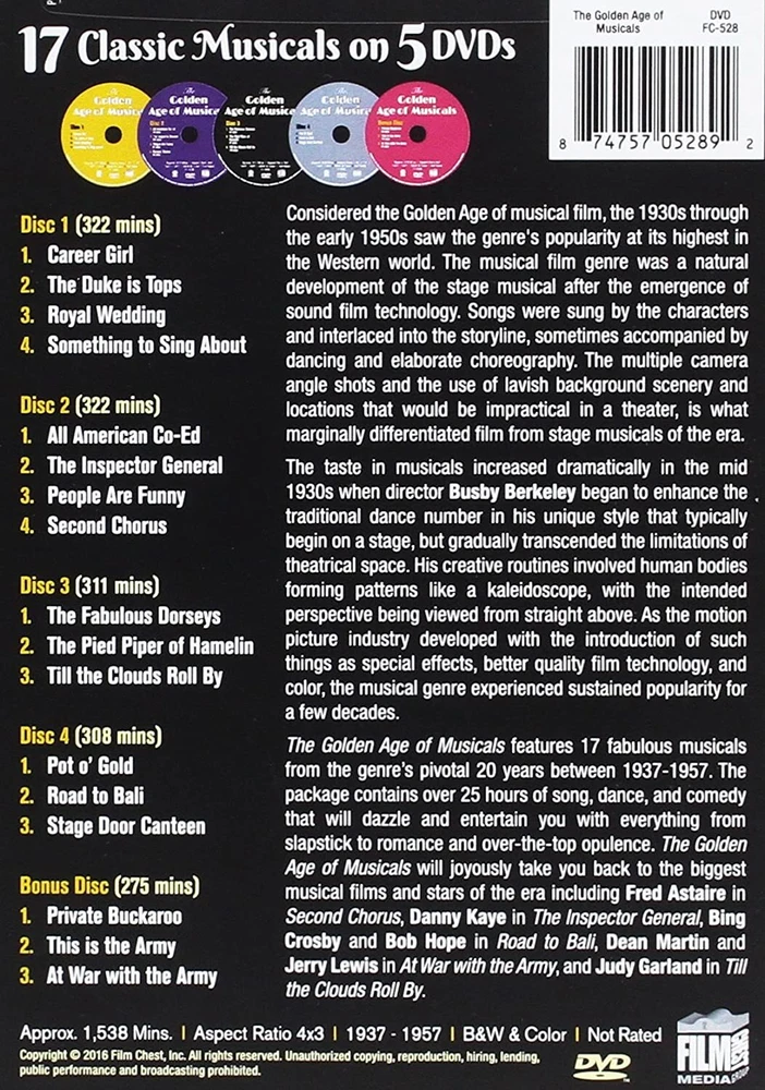 Further Details Title: The Golden Age of Musicals (5 Disc Collector's Set) Format: DVD Condition: New Number Of Discs: 5 Release Date: 08/09/2016 Actors: Frances Langford, Fred Astaire, James Cagney, Danny Kaye, The Dorseys Director: Hal Walker, Wallace Fox, Frank Borzage, Stanley Donovan, Victor Schertzinger Audio Language: English Runtime: 25 hours and 38 minutes Region Code: DVD: 1 (US, Canada...) Studio: Film Chest Certificate: MPAA Not Rated Description: Considered the Golden Age of musical film, the 1930s through the early 1950s saw the genre's popularity at it's highest in the Western world. The musical film genre was a natural development of the stage musical after the emergence of sound film technology. Songs were sung by the characters and interlaced into the storyline, sometimes accompanied by dancing and elaborate choreography. The multiple camera angle shots and the use of lavish background scenery and locations that would be impractical in a theater, is what marginally differentiated film from stage musicals of the era. The taste in musicals increased dramatically in the mid 1930s when director Busby Berkeley began to enhance the traditional dance number in his unique style that typically begin on a stage, but gradually transcended the limitations of theatrical space. His creative routines involved human bodies forming patterns like a kaleidoscope, with the intended perspective being viewed from straight above. As the motion picture industry developed with the introduction of such things as special effects, better quality film technology, and color, the musical genre experienced sustained popularity for a few decades. The Golden Age of Musicals features 17 fabulous musicals from during the genre's pivotal 20 years between 1937-1957. The package contains over 25 hours of song, dance, and comedy that will dazzle and entertain you with everything from slapstick to romance and over-the-top opulence. The Golden Age of Musicals will joyously take you back to the biggest musical films and stars of the era including Fred Astaire in Second Chorus, Danny Kaye in The Inspector General, Bing Crosby and Bob Hope in Road to Bali, Dean Martin and Jerry Lewis in At War with the Army, and Judy Garland in Till the Clouds Roll By. DVDs ARE REGION 1 UNLESS OTHERWISE STATED Missing Information? Please contact us if any details are missing and where possible we will add the information to our listing.