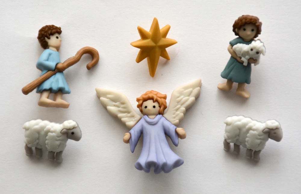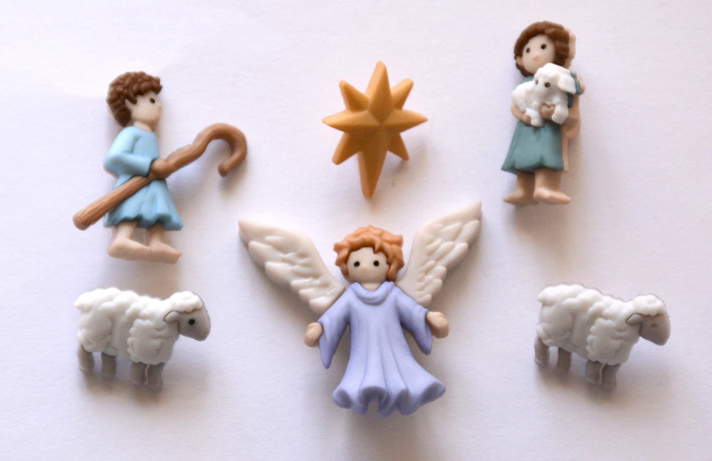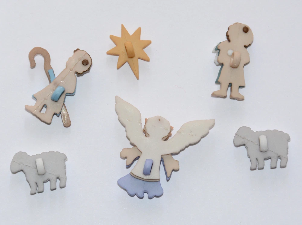 The Good Shepherd ~ Christmas Buttons from Jesse James Co. / Holiday Collection The Good Shepherd Package contains 6 Snap/Shank Back Buttons Angel (1" high) Star (3/4" high) Sheep (5/8" wide) Shepherd with Hook (1" high) Shepherd with Lamb (1" high) Buttons are new and still in the original packaging. Great for Christmas Scrapbooking, Cards, Crafts and Decorating. Notes to Buyers My items are from a pet and smoke-free home. Payment / Shipping Charges All buttons, appliques, cards and other small items ship with a flat rate shipping charge as long as you use eBay’s shopping cart and buy everything in the same transaction. If you pay for items separately, shipping on additional purchases will not be fully refunded due to the fees I’m charged on the extra transactions. Shipping I ship via USPS using tracking the same or next business day following notice of your cleared payment. Please note that delivery time is listed by eBay; but I’m at the mercy of USPS. If you need your order ASAP please consider upgrading to Priority Mail. If USPS does seem to stall your package, please notify me and I will file a claim with them to see if I can get it moving. Returns / Damaged Items If you do find a defect or problem with your order, please notify me before filing a claim or leaving negative / neutral feedback so I can resolve any issues. Please include a photo so I know how to handle the problem. Returned items must be received in the same condition as shipped – including smoke free.