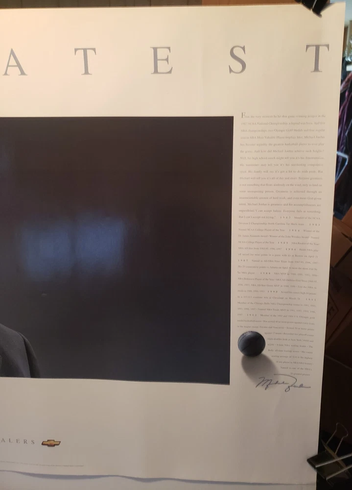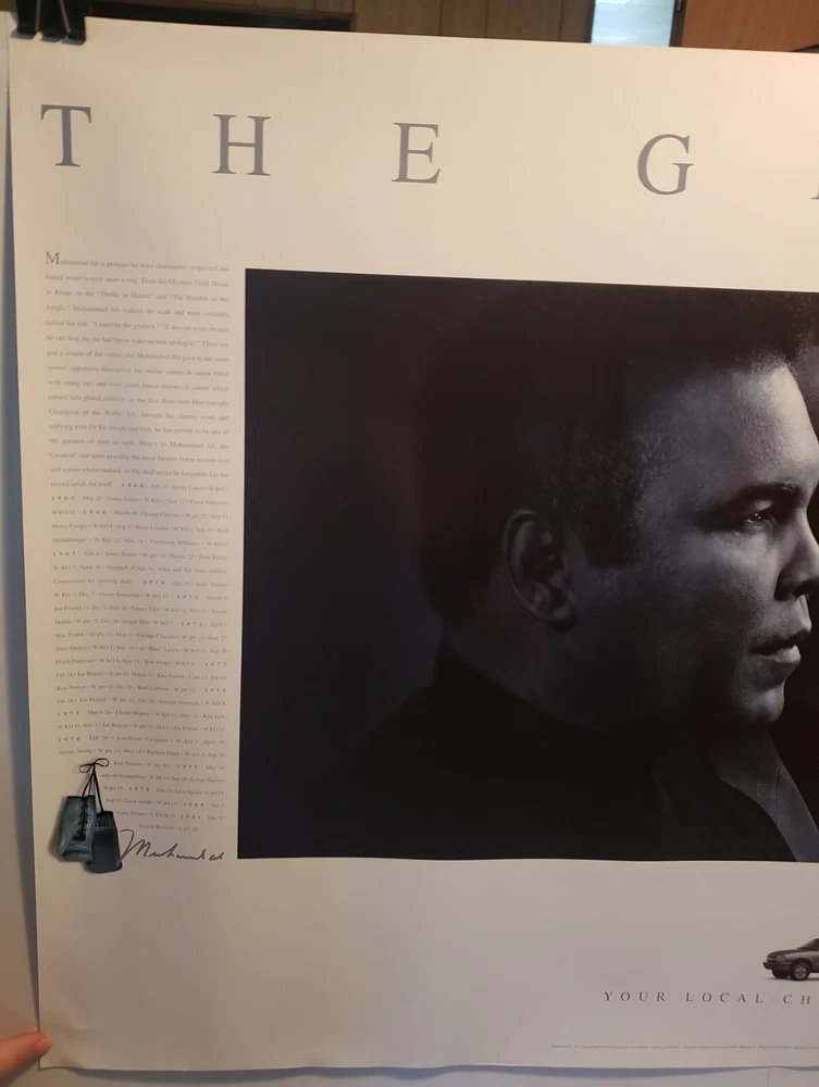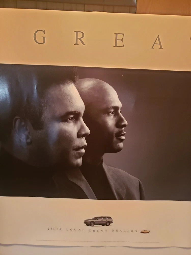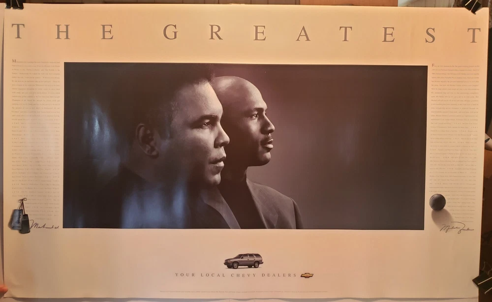 This is a The Greatest Michael Jordan Muhammad Ali Chevy 23 x 37 1/2" (approx.) Poster Chicago Bulls . Poster has a light corner stain on bottom corner, some thumb bends, some wear . Please see photos for condition. I have other items in my E-Bay store if you are interested. Please see above for shipping and handling. E-mail me with any questions. Thank You!!!
