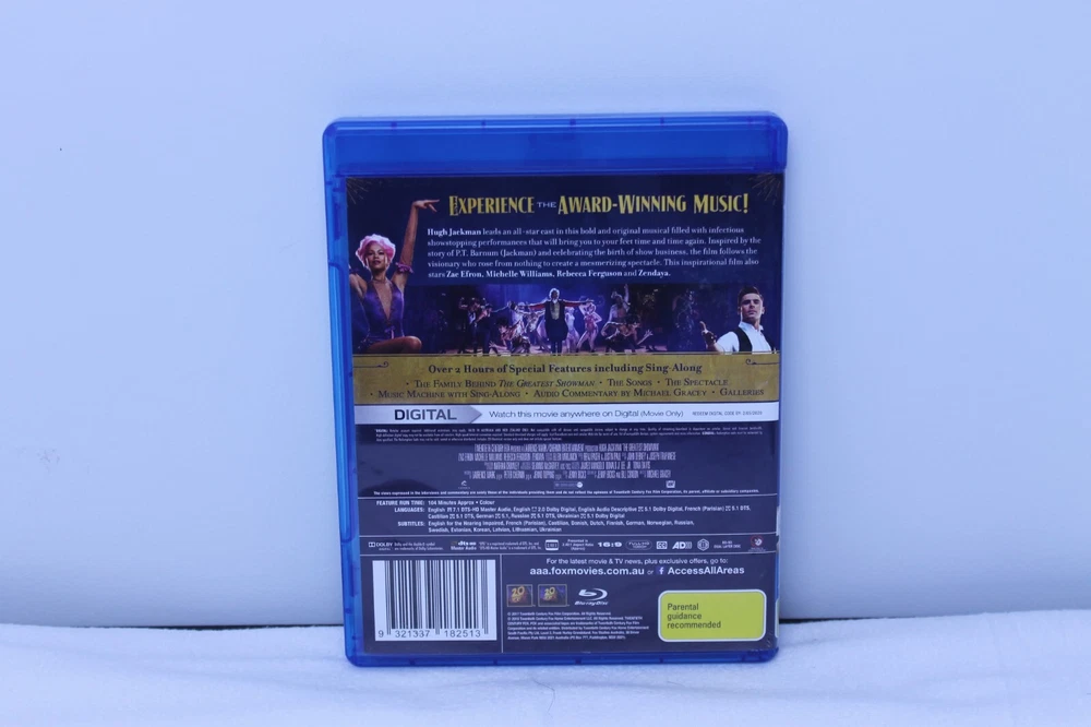 The Greatest Showman Blu-ray starring Hugh Jackman is a must-have for fans of musicals and biographies. This Blu-ray edition includes bonus features such as additional scenes and a behind-the-scenes featurette, giving viewers an even deeper look into the making of the film. With a PG rating and a runtime of 105 minutes, this 2017 release from 20th Century Fox is perfect for a movie night at home. Get your copy now for fast, free postage and tracking to Australia and beyond.