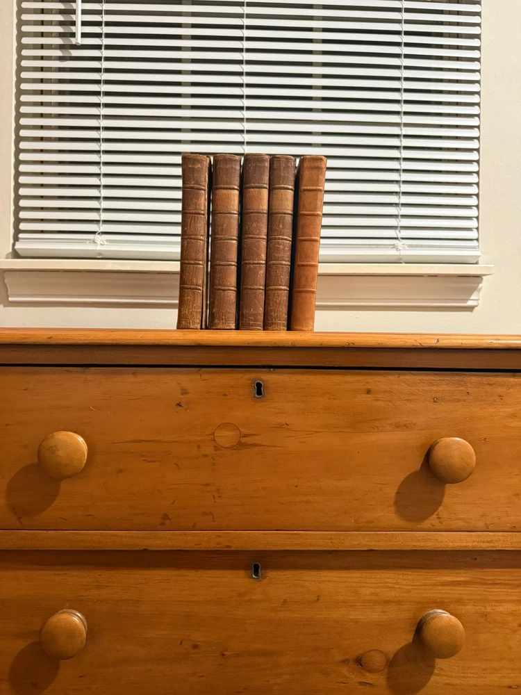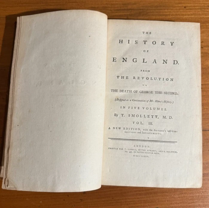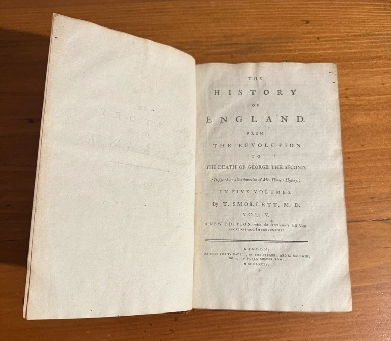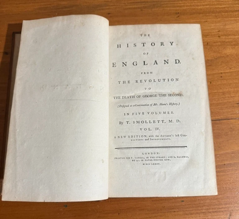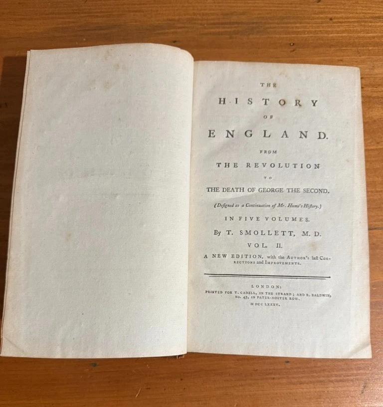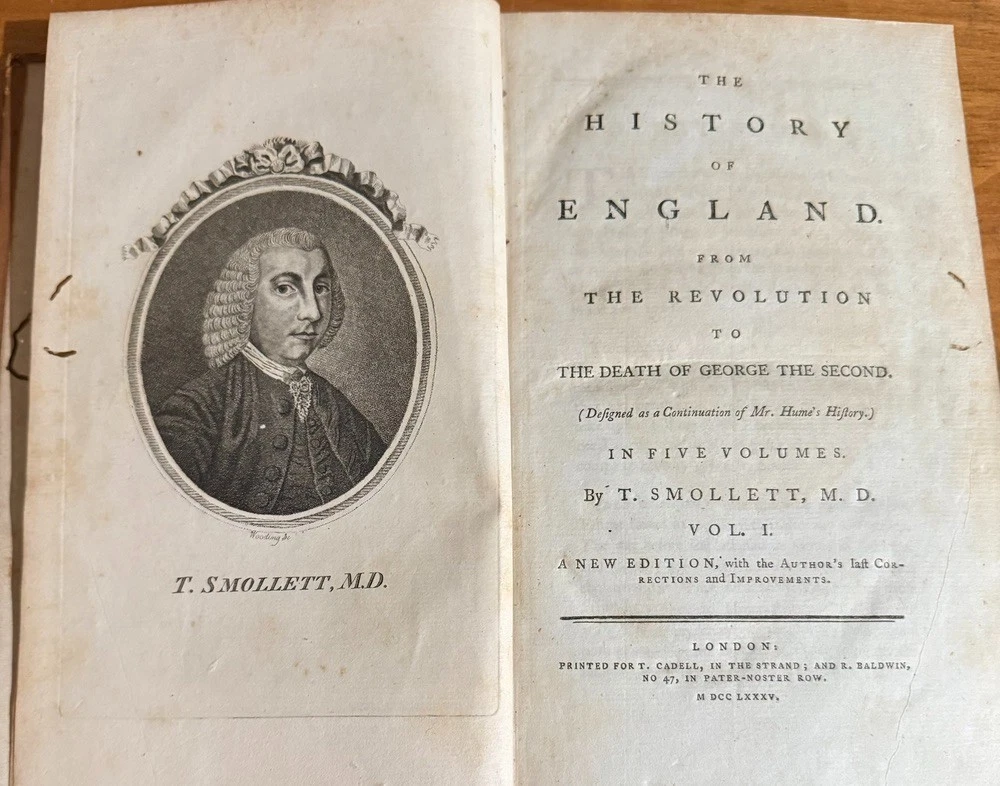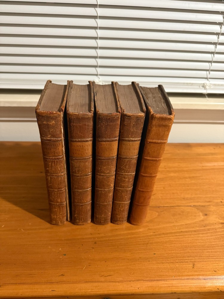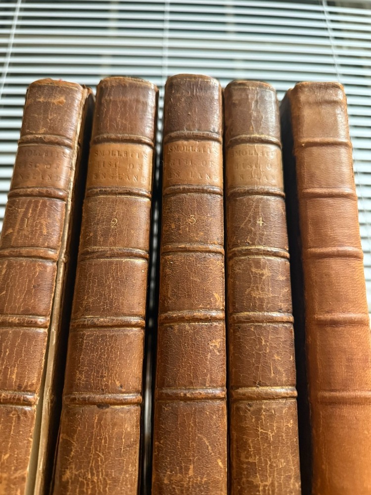 The History of England from the Revolution to the Death of George II by Tobias Smollett, M.D. Five volumes. 1785. A new edition, with the Author's Corrections and Improvements. Early edition of Tobias Smollett’s monumental history of England, first published between 1757 and 1765. Smollett (1721–1771), celebrated novelist and historian, brings his sharp wit and critical perspective to the events from the Glorious Revolution of 1688 through the reign of George II. His narrative remains a major historical source for the 18th century and reflects the Enlightenment ideals of reason, politics, and progress. Octavo volumes in uniform contemporary full leather bindings (rubbed, with some wear to spines and corners), gilt titles to spines. The front cover of Volume I has separated, but will be included in shipment. A handsome and complete set, ideal for collectors of 18th-century history, Smollett enthusiasts, or those seeking an elegant addition to a personal library.