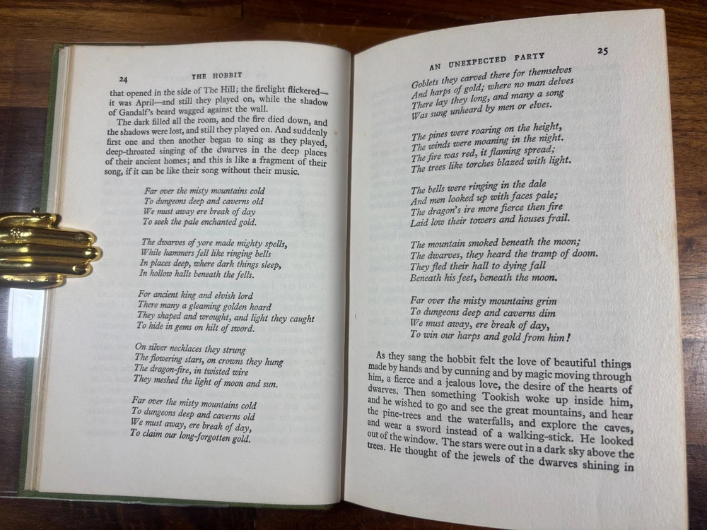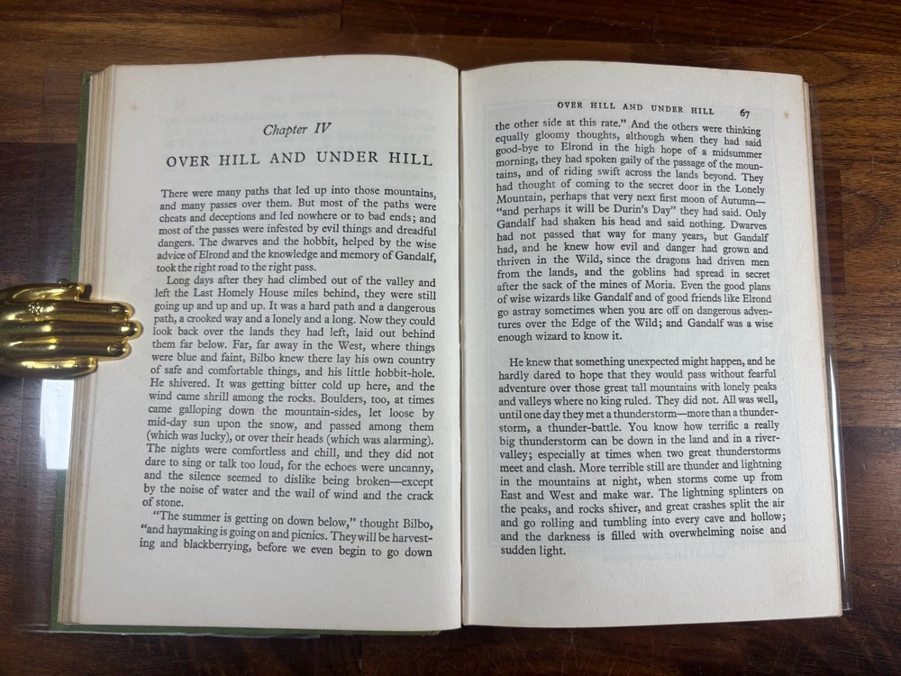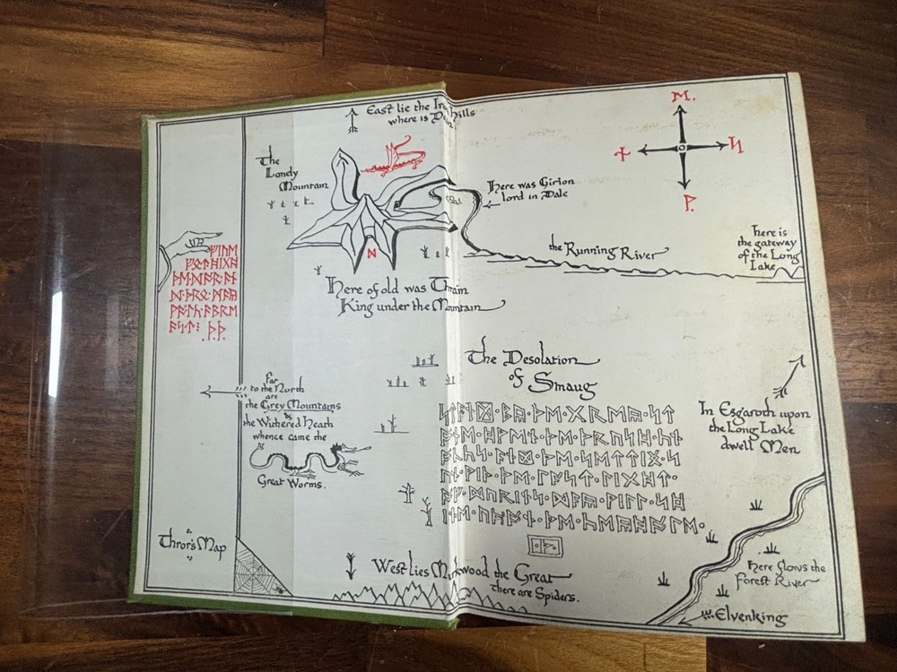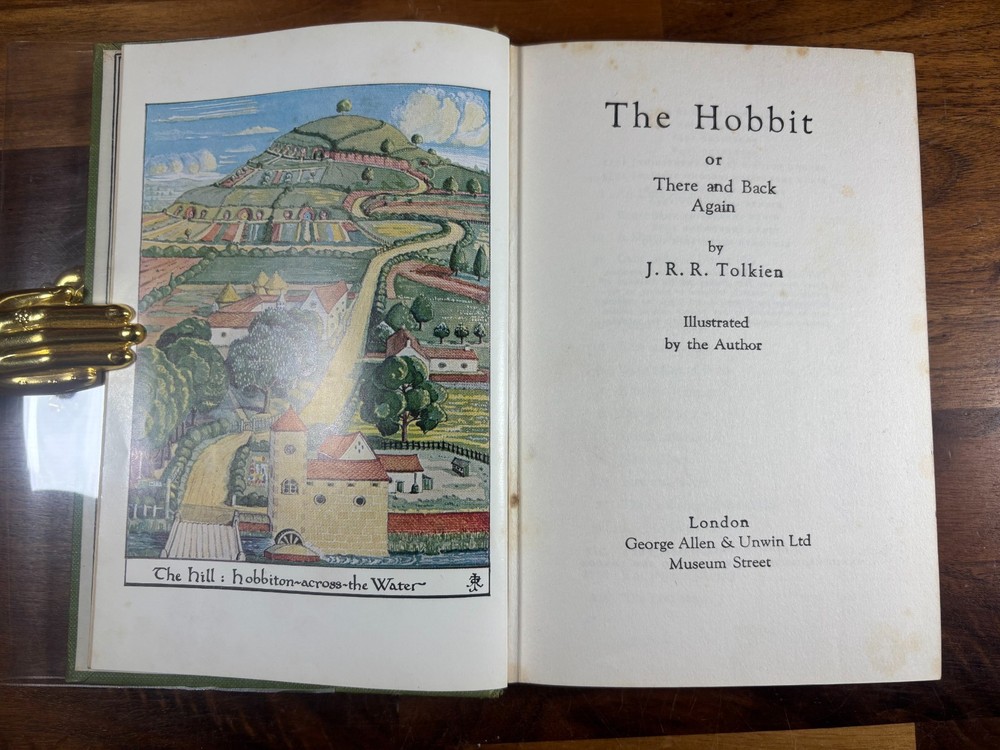 The Hobbit J.R.R. Tolkien 11th Impression (1959), 2nd Edition George Allen & Unwin Illustrated Item Short Description Offered here is a 1959 11th Impression of The Hobbit by J.R.R. Tolkien , published by George Allen & Unwin (London). This is part of the Second Edition of the novel, which incorporates Tolkien’s major revisions to the “Riddles in the Dark” chapter to align with the later The Lord of the Rings . This edition features: The classic green cloth binding with Tolkien’s dragon illustration Thorin’s Map as the illustrated endpapers The color frontispiece “The Hill: Hobbiton-Across-the-Water” Numerous black-and-white illustrations by Tolkien throughout the text Clean, crisp printing of Tolkien’s iconic poetry and prose The 1950s impressions of The Hobbit have become increasingly collectible, especially examples in such well-preserved condition. Publication Details Title: The Hobbit, or There and Back Again Author: J.R.R. Tolkien Publisher: George Allen & Unwin Ltd Edition: Second Edition Impression: 11th Impression (1959) Format: Hardback Illustrated: Yes — by Tolkien Country: United Kingdom Condition Notes Boards: Clean and bright, minimal wear. Spine: Clear titling; slight age toning. Pages: Crisp with only light scattered foxing. Illustrations: All present and well-printed, including the colour plate. Binding: In good condition, minor wearing along the edges. Protective Cover: Plastic sleeve included for preservation. In the photos the light is reflecting off of the plastic protective cover. These are not defects only reflections. A strong collectible copy with excellent shelf appeal. About J.R.R. Tolkien John Ronald Reuel Tolkien (1892–1973) was a philologist, Oxford professor, and one of the most influential authors of the 20th century. His creation of Middle-earth — beginning with The Hobbit in 1937 and culminating in The Lord of the Rings — transformed modern fantasy literature. Tolkien personally illustrated early editions of The Hobbit , bringing his world to life through maps, drawings, and watercolors. His works pioneered immersive world-building, complete with invented languages, mythology, and deep historical lore. Today, Tolkien’s books remain cornerstones of modern storytelling, inspiring films, art, games, and generations of readers. A 1950s printing of The Hobbit such as this one represents not only a beloved novel, but also an important moment in Tolkien’s evolving mythology: the Second Edition , which introduced the revised characterization of Gollum that shaped the entire Legendarium. Why Collect This Book? Early post-LOTR printing with rising collector demand Contains Tolkien’s corrected text aligning The Hobbit with The Lord of the Rings Features Tolkien’s own illustrations and maps A beautifully preserved vintage example of one of the most important novels of the 20th century Perfect for collectors of Tolkien, early fantasy literature, or mid-century illustrated books.