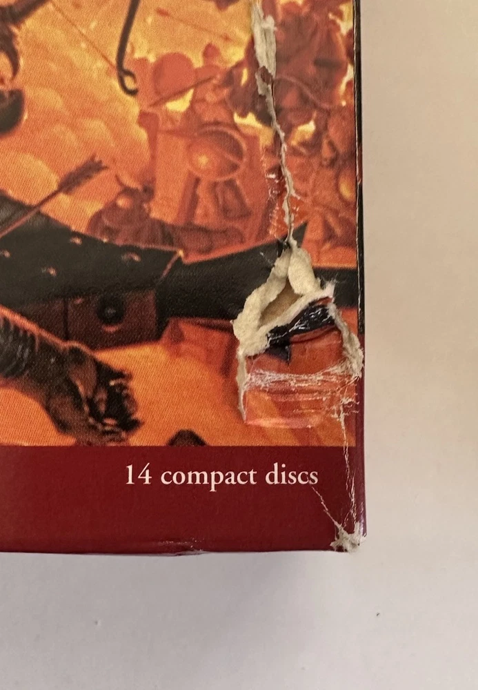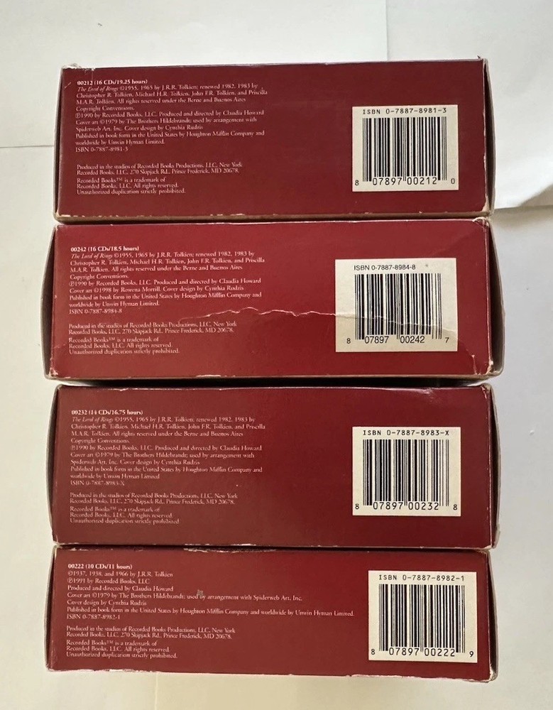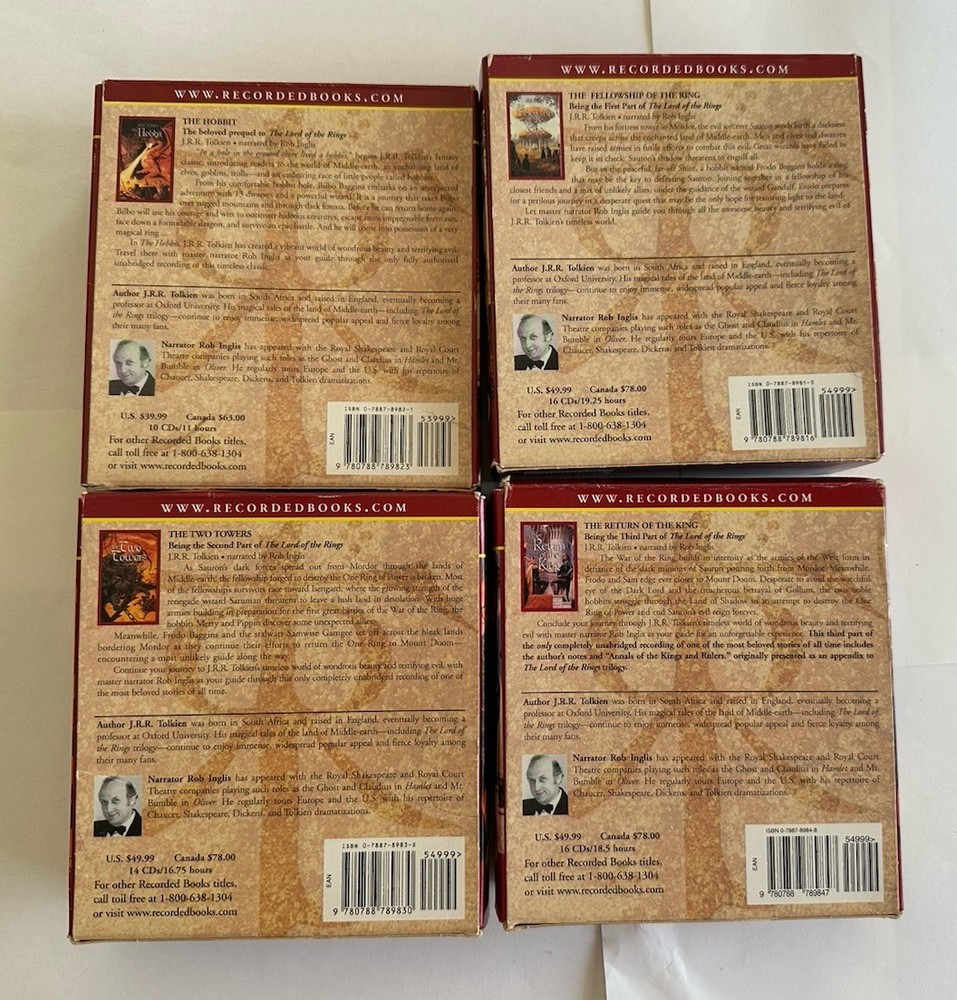 The product is a complete box set of 56 CDs containing audiobooks of J.R.R. Tolkien's "The Hobbit" and "The Lord of the Rings" series. Published by Houghton Mifflin Harcourt in the 1990s, this box set is designed for young adult and adult audiences, featuring an unabridged audio CD format with a run time of 63 hours. The narrative, set in the fantasy genre, follows the action-packed and adventurous stories of Middle Earth, making it a must-have for fans of literature and collectibles alike. Narrated by Bob Ingles, this box set is a valuable addition to any Tolkien enthusiast's collection. These LOTR box set audiobooks are complete with all discs and play great. The discs look like they were never played. The outer boxes do have some shelf wear mostly at the corners. There is a treat to the Two Towers outer boxes in the lower left corner. See all photos for details.