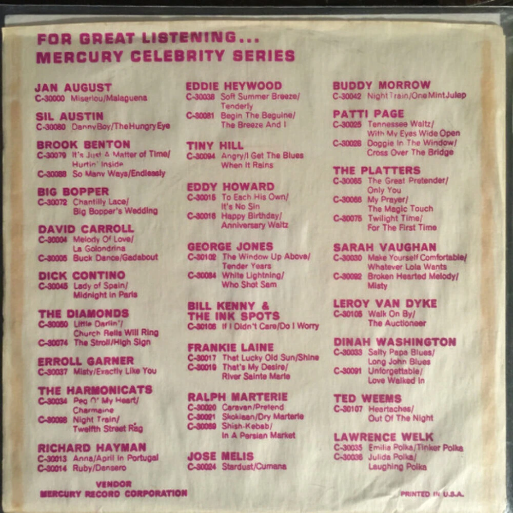 {Description} ALL IMAGES DISPLAYED ARE SAMPLE IMAGES. They do not reflect the actual items condition or contents included. Please read the full item description for condition and exclusions prior to placing your order. Please assume that inserts and custom inner liners, posters, stickers, shrink etc. are NOT present (even if included in the sample photos). Please ask us to confirm prior to ordering. There may be writing on jackets, seam splits, paper loss etc. depending on condition of the item listed above. We have a grade for the media and the cover. If the cover grade is “Generic” or “No Cover” there is not any cover, or it is a generic cover. IF you are condition sensitive, please ask BEFORE placing order. We will inspect and reply as soon as possible. Please read the condition notes on each item and understand how we grade and details prior to placing your order. We grade all our items visually unless otherwise noted. We use the goldmine standard for grading all items. {Description} Grading: Mint (M) Vinyl Absolutely perfect in every way. Certainly never been played, possibly even still sealed. Should be used sparingly as a grade, if at all. CD Perfect. No scuffs/scratches unplayed - possibly still sealed. Insert/Inlay/Booklet/Sleeve/Digipak: Perfect. No wear, marks, or any other imperfections - possibly still sealed. Cassette J-Card is crisp, clean, and perfect in every way. Likely sealed. Cassette is brand new, and professionally produced. Used sparingly as a grade, should be free of even the slightest blemishes and/or defects. This grade should be used sparingly, if at all. Near Mint (NM or M-) Vinyl A nearly perfect record. A NM or M- record has more than likely never been played, and the vinyl will play perfectly, with no imperfections during playback. Many dealers won't give a grade higher than this implying (perhaps correctly) that no record is ever truly perfect. The record should show no obvious signs of wear. A 45 RPM or EP sleeve should have no more than the most minor defects, such as any sign of slight handling. An LP cover should have no creases, folds, seam splits, cut-out holes, or other noticeable similar defects. The same should be true of any other inserts, such as posters, lyric sleeves, etc. CD Near perfect. No obvious signs of use, it may have been played - but it has been handled very carefully. Insert/Inlay/Booklet/Sleeve/Digipak: Near Perfect. No obvious wear, it may have only the slightest of marks from handling. Cassette Sleeve should be totally crisp and clean with only the slightest evidence of handling. Tape is likely new, free of any wear or damage. Very Good Plus (VG+) Vinyl Generally worth 50% of the Near Mint value. A Very Good Plus record will show some signs that it was played and otherwise handled by a previous owner who took good care of it. Defects should be more of a cosmetic nature, not affecting the actual playback. Record surfaces may show some signs of wear and may have slight scuffs or very light scratches that don't affect one's listening experiences. Slight warps that do not affect the sound are "OK". The label may have some ring wear or discoloration, but it should be barely noticeable. Spindle marks may be present. Picture sleeves and inner sleeves will have some slight wear, slightly turned-up corners, or a slight seam split. An LP cover may have slight signs of wear, and may be marred by a cut-out hole, indentation, or cut corner. In general, if not for a couple of minor things wrong with it, this would be Near Mint. CD A few minor scuffs/scratches. This has been played but handled with good care - and certainly not abused. Insert/Inlay/Booklet/Sleeve/Digipak: Slight wear, marks, indentations, it may possibly have a cut-out hole (or similar). Cassette Sleeve has slight wear, marks, indentations, and/or may possibly have a cut-out hole (or similar). Tape has been taken very good care of and may have light marks or spindle wear. Should play cleanly with minimal noise or degradation. Very Good (VG) Vinyl Generally worth 25% of Near Mint value. Many of the defects found in a VG+ record will be more pronounced in a VG disc. Surface noise will be evident upon playing, especially in soft passages and during a song's intro and fade but will not overpower the music otherwise. Groove wear will start to be noticeable, as with light scratches (deep enough to feel with a fingernail) that will affect the sound. Labels may be marred by writing or have tape or stickers (or their residue) attached. The same will be true of picture sleeves or LP covers. However, it will not have all these problems at the same time. Goldmine price guides with more than one price will list Very Good as the lowest price. CD Quite a few light scuffs/scratches, or several more-pronounced scratches. This has obviously been played, but not handled as carefully as a VG+. Insert/Inlay/Booklet/Sleeve/Digipak: More wear, marks, indentations than a VG+. May have slight fading, a small tear/rip, or some writing. Cassette Sleeve will contain more wear, marks, and/or indentations than a VG+. May have slight fading, a small tear/rip, or some writing. Shell may have heavier marks and wear than VG including plastic discoloration. Should play with some stronger hiss or degradation, but not enough to overpower music. Good (G), Good Plus (G+) Vinyl Generally worth 10-15% of the Near Mint value. A record in Good or Good Plus condition can be played through without skipping. But it will have significant surface noise, scratches, and visible groove wear. A cover or sleeve will have seam splits, especially at the bottom or on the spine. Tape, writing, ring wear, or other defects will be present. While the record will be playable without skipping, noticeable surface noise and "ticks" will almost certainly accompany the playback. CD There are a lot of scuffs/scratches. However, it will still play through without problems. This has not been handled with much care at all. Insert/Inlay/Bo
