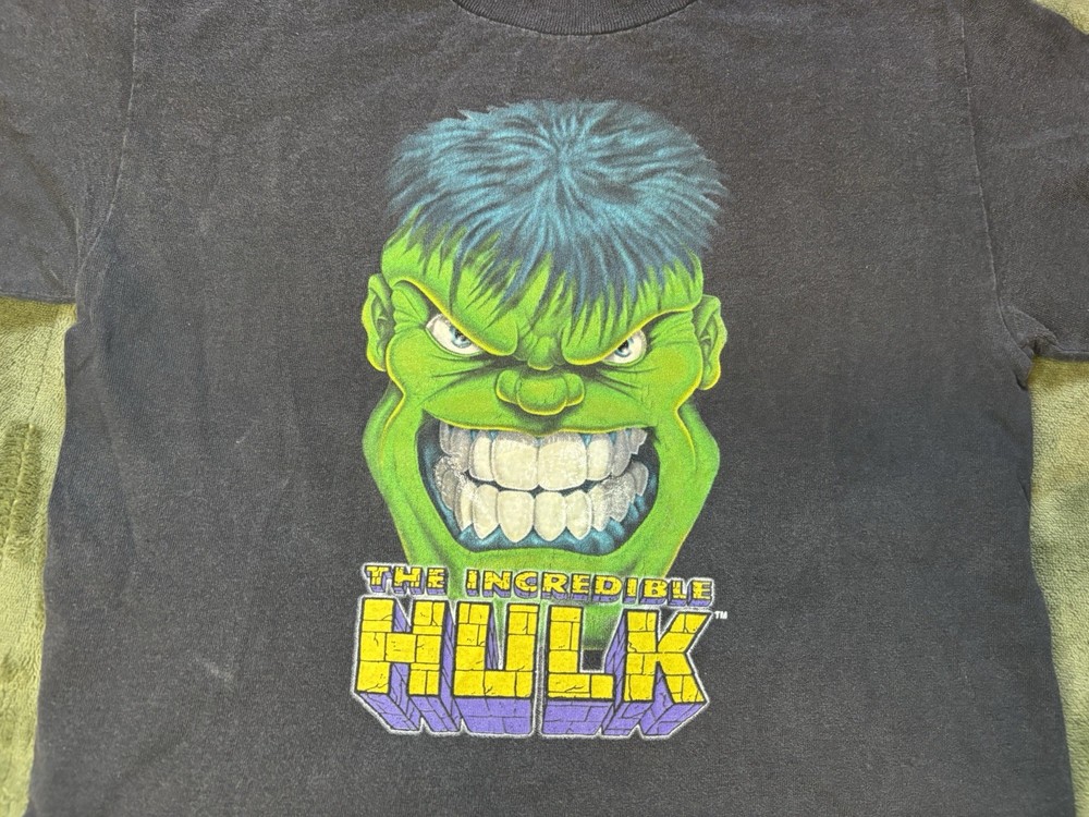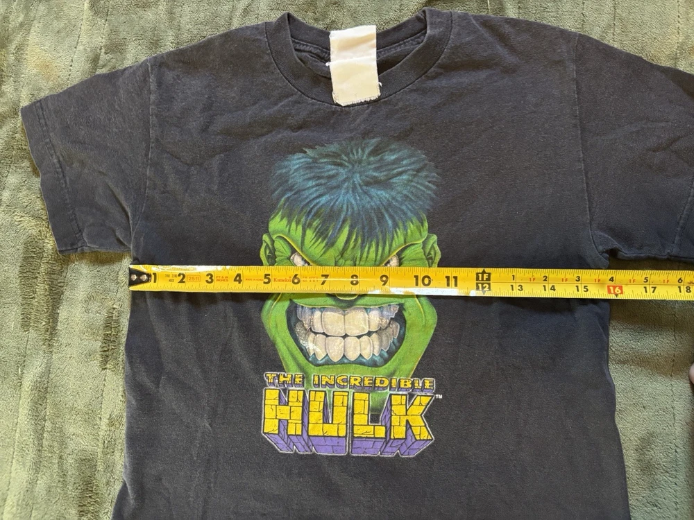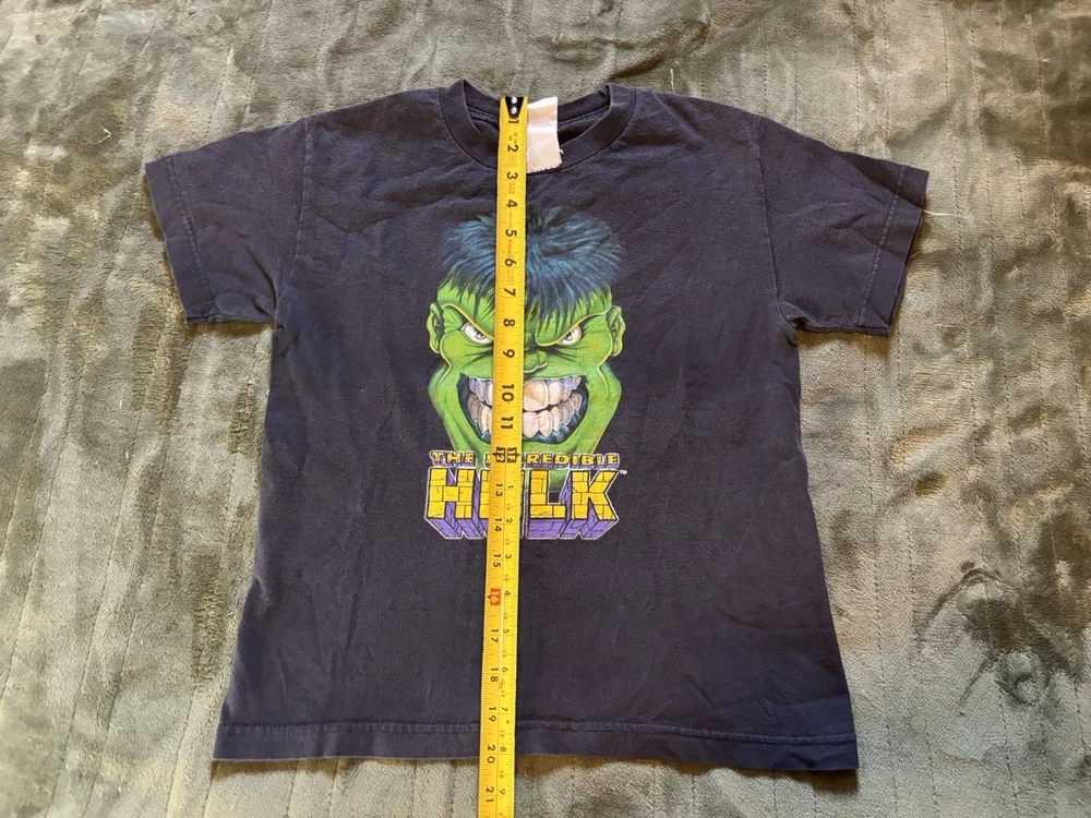 This youth boys' large shirt featuring The Incredible Hulk is a vintage 90s piece perfect for fans of Marvel comics and superheroes. The black shirt with a graphic print of The Hulk is a pullover with short sleeves and a crew neck neckline, suitable for casual occasions like parties and travel. Machine washable and easy to care for, this regular fit t-shirt is ideal for the summer, fall, and spring seasons, making it a versatile addition to any young superhero's wardrobe.
