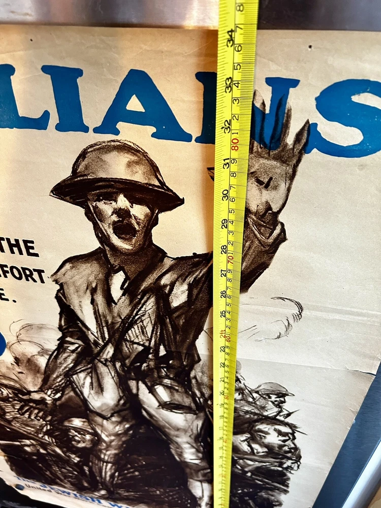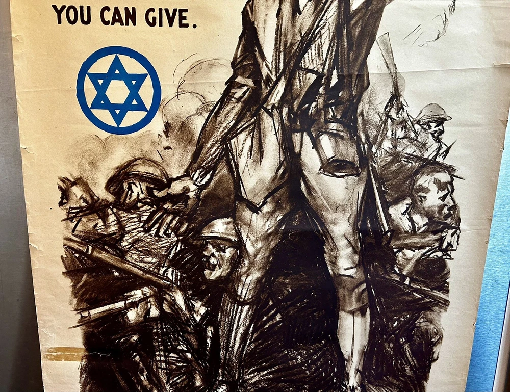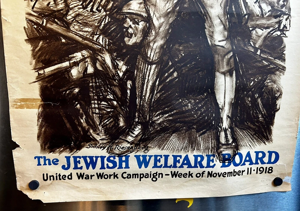 Rare world war 1 Jewish related poster Measures 22” x 34” Has some visible tears on corners / edges but still would display amazingly framed “Civilians, when we go through this we need all the help and comfort you can give - The Jewish Welfare Board” was one of many posters issued during World War I. This poster was commissioned by the National Jewish Welfare Board. The board was formed on April 9, 1917 and became one of the six organizations that formed the United Service Organization during WWI. According to The Vintage Poster, the board provided Jewish soldiers with kosher food, Passover meals, holiday services, and trans-denominational prayer books, while also training Rabbis to serve as aids in the Jewish military. According to the Jewish Virtual Library, approximately 250,000 Jewish Americans fought during World War 1, about 3,500 died, and 12,000 were wounded. This poster was commissioned in 1918 from Sidney Riesenberg, an American artist and illustrator from New York who was known especially for his oil paintings. This picture of a soldier prompts civilians to join the war effort and help fund the Jewish Welfare Board. This poster was created as a lithographic print at the time of its distribution.” (Typed by computer) This is an original 1918 World War 1 poster from the Jewish Welfare Board featuring Sidney Riesenberg. The poster is a unique piece of militaria that showcases the theme of the Jewish community during World War 1. It is a valuable addition to any collection of original period items from the United States. The poster is in excellent shape and is a great conversation starter for any history enthusiast.