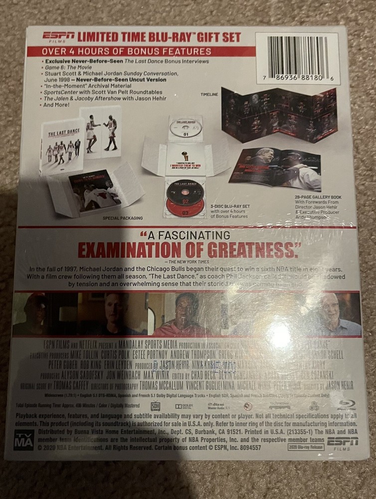 The Last Dance: A Ten-Part Documentary Event (Limited Time Blu-ray Gift Set) is a limited edition box set that includes a Blu-ray disc of a documentary film about the career of Michael Jordan and the Chicago Bulls basketball team. The documentary is directed by Jason Hehir and features interviews with Jordan, his teammates, and opponents, as well as footage of his incredible skill on the court. The set is region-free and includes English language subtitles. The cardboard sleeve case type protects the disc and makes it a great addition to any fan's collection.