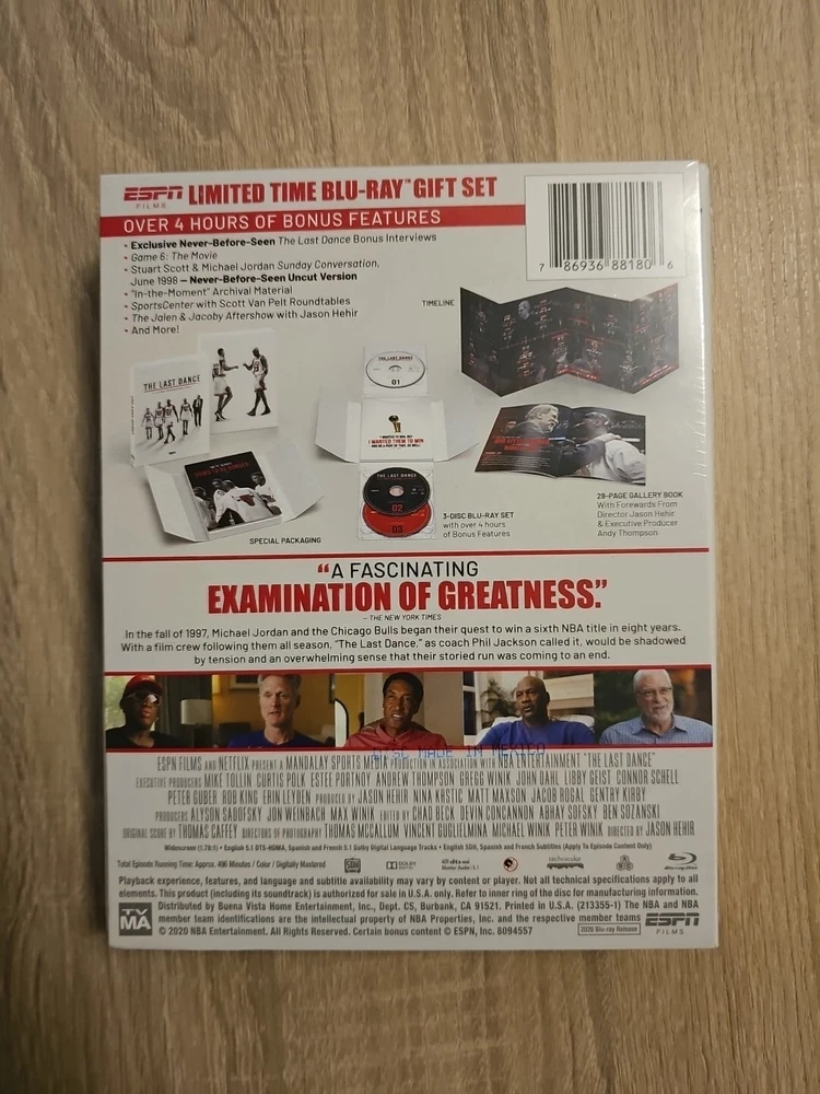 Sub-Genre:Biography, BasketballLanguage:EnglishRegion Code:Blu-ray: Region FreeCase Type:Cardboard SleeveMovie/TV Title:The Last Dance: a Ten-Part Documentary Eventgtin13:0786936881806Actor:Scottie Pippen, Phil Jackson, David Aldridge, Michael Jordan, Steve KerrEdition:Limited Edition, Box SetFormat:Blu-ray DiscSeason:Complete Series Box SetGenre:DocumentaryUPC:0786936881806Director:Jason Hehir