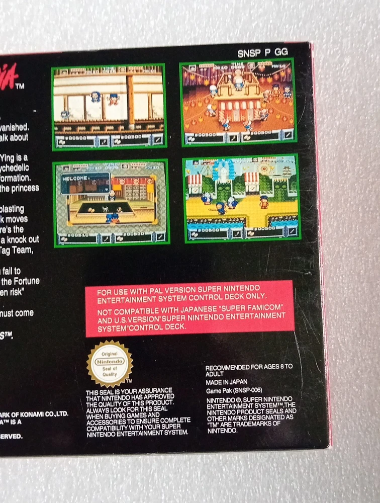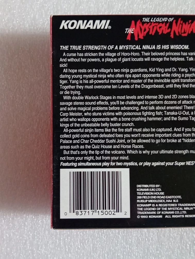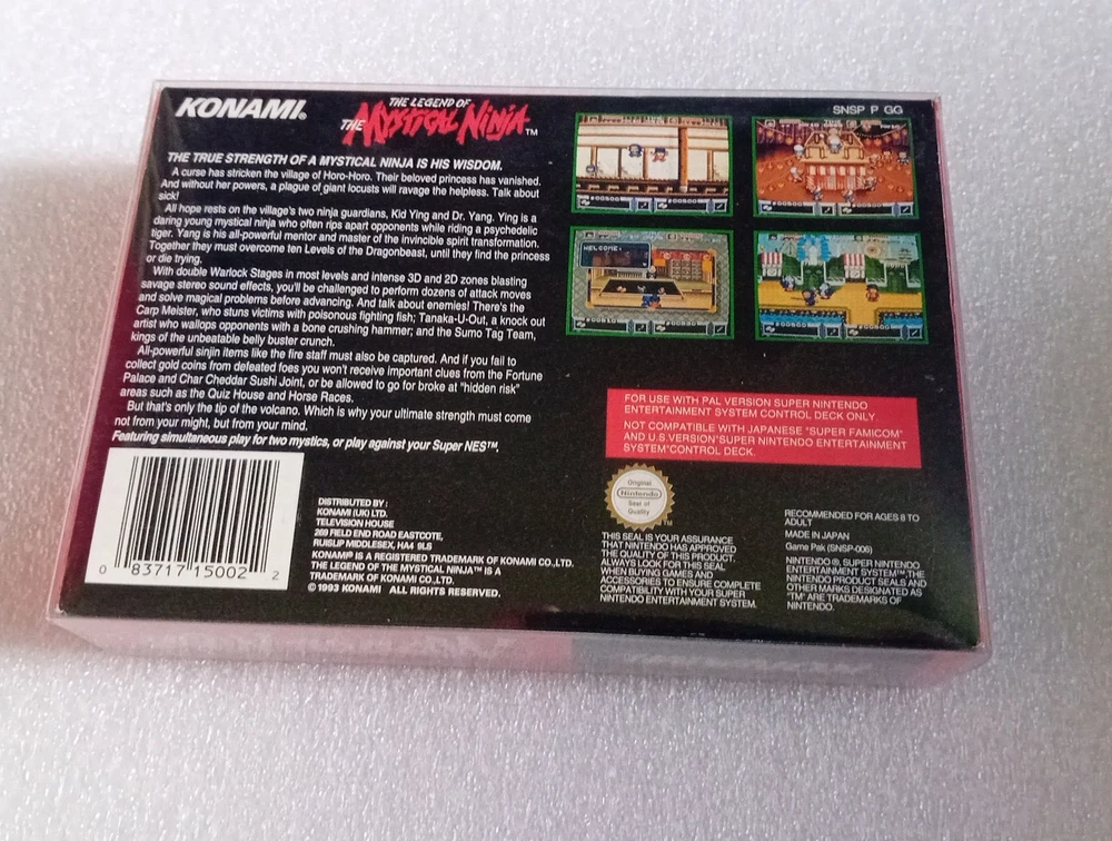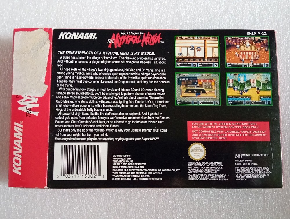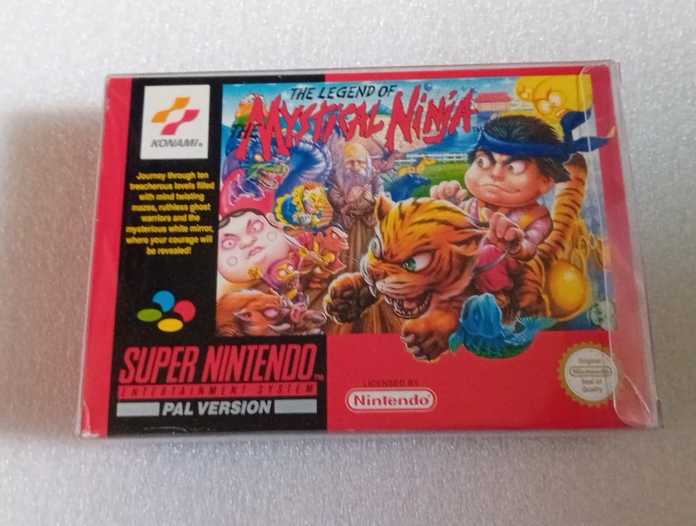Mystical ninja for super nintendo. SNES PAL still in very good shape and condition. It has a small part ripped on one opening flap. Boxed with insert, cartridge and manual. Please see pictures for conditions.