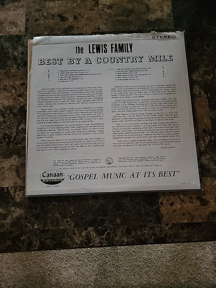 The Lewis Family's "Best by a Country Mile" is a 33 RPM LP record that features a mix of gospel, country, and religious & devotional genres. The vinyl record comes in a cardboard sleeve and has a record grading of Very Good Plus (VG+), while the sleeve grading is Fair (F). The record size is 12 inches and the material is vinyl. This LP is a great addition to any music lover's collection, with its smooth vocals and upbeat rhythms. The Lewis Family's signature sound is showcased in this album, making it a must-have for fans of country and gospel music.