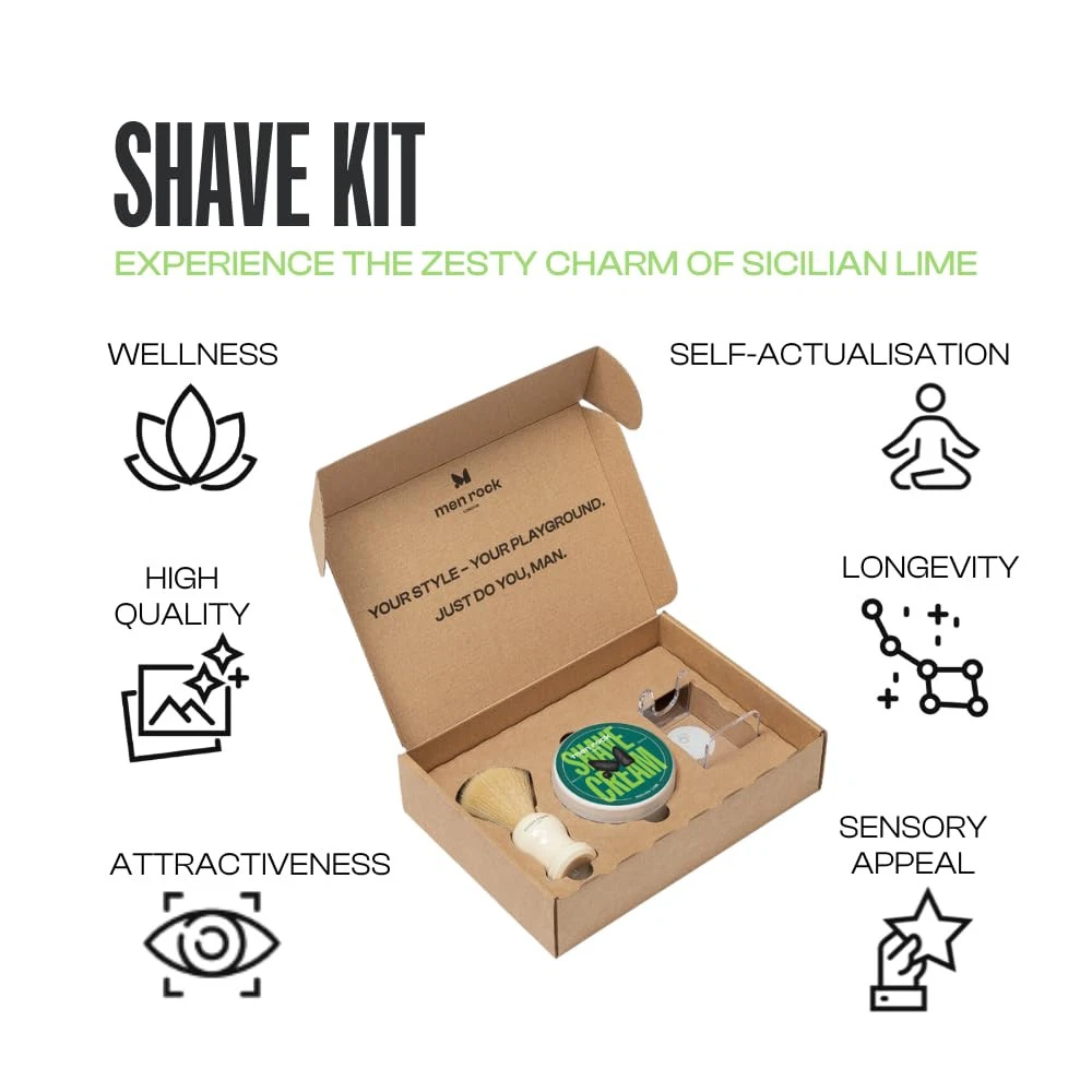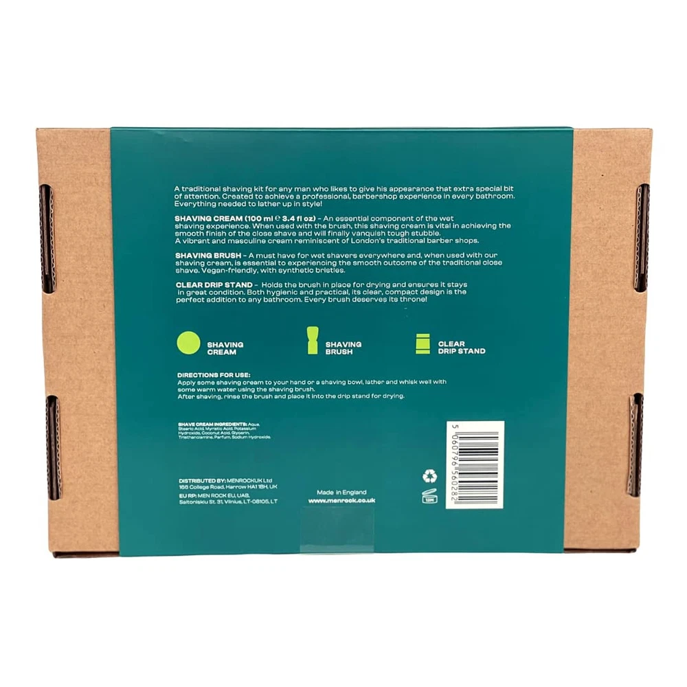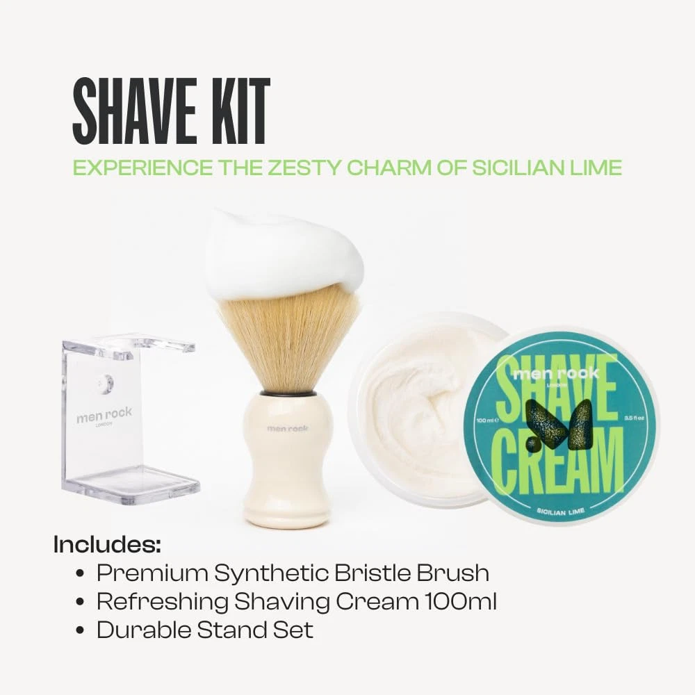 Not just another gift set, it's a true 'Life Shaver’. Our best-selling shaving cream paired with a vegan brush and a clear drip stand is an all-occasions gift. Complete Shaving Set: Includes 100ml Shave Cream, Synthetic Shaving Brush, and Drip Stand for a professional wet shave experience. Luxurious Shave Cream: Infused with Sicilian Lime and Spicy Black Pepper fragrance, providing a refreshing and invigorating scent. Premium Synthetic Brush: Mimics natural bristles, creating a rich lather and ensuring gentle application on the skin. Durable Drip Stand: Keeps the shaving brush in top condition by allowing proper drying, extending the life of the bristles. Perfect Gift: Ideal for both beginners and seasoned shavers, making it the ultimate grooming gift for any occasion.