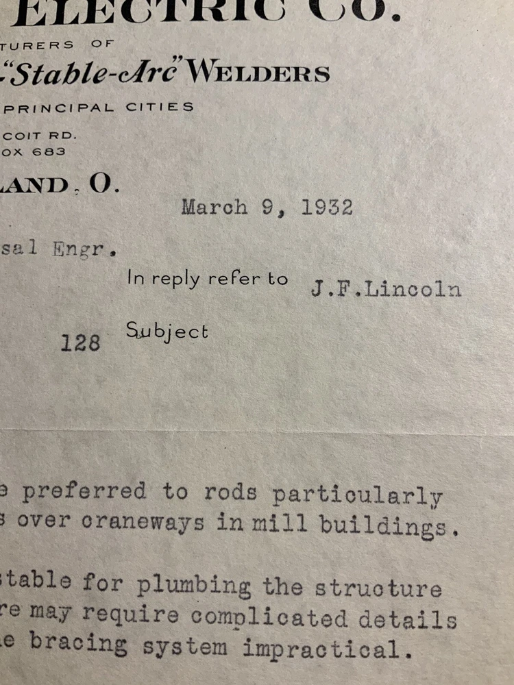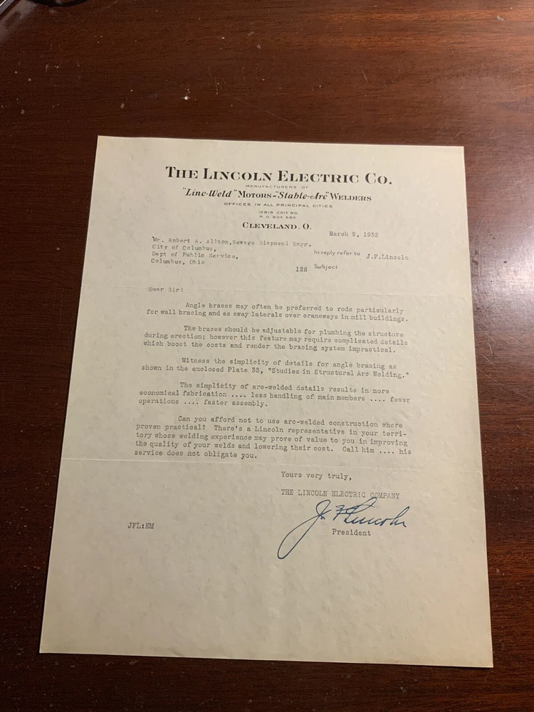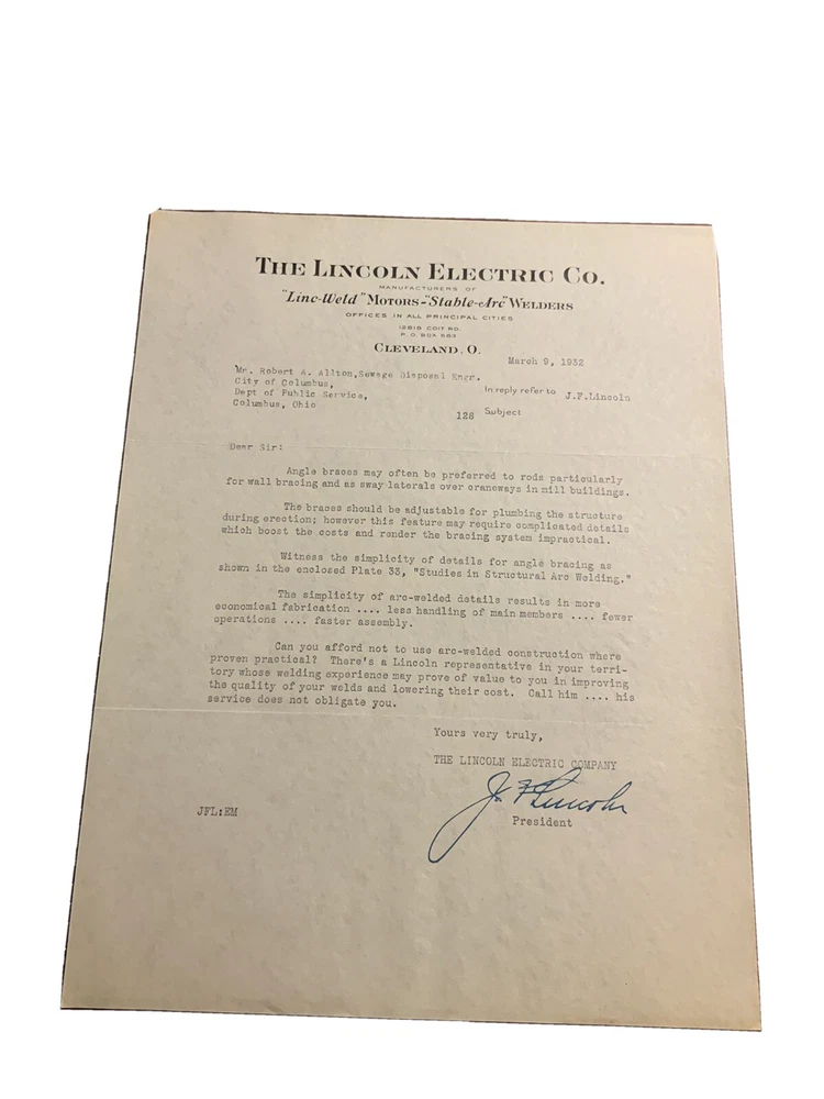 Title/Info: The Lincoln Electric Co Cleveland Ohio Letter Welders Motors March 9 1932. 1 sheet. The Lincoln Electric Co. Manufacturers of "Linc-Weld" Motors - "Stable-Arc" Welders. Offices in All Principal Cities. 12818 Coit Rd. Cleveland, O. 8.5" x 11" Additional Info: Exactly the same as pictured. Scans may not pick up all flaws. (Ch 8, Brobx5.005)