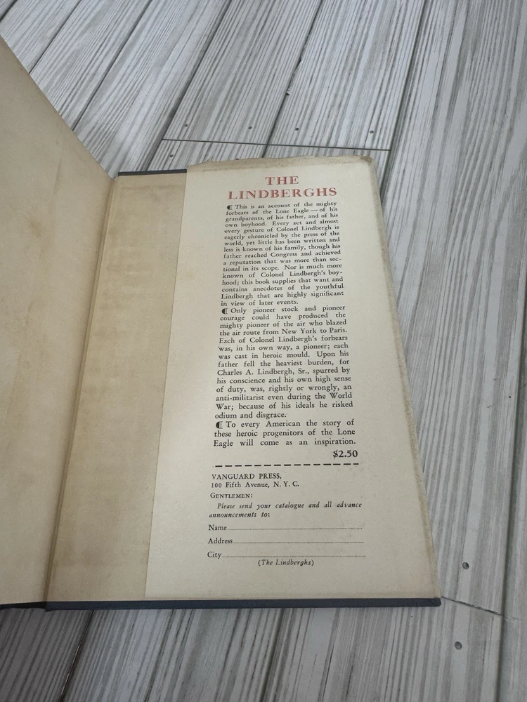 The Lindberghs by Lynn and Dora B. Haines 📘 Published by Vanguard Press, 1931 – First Edition (presumed) Hardcover with original dust jacket This early biography details the family history and American roots of famed aviator Charles A. Lindbergh. Includes rare photos and anecdotes not widely known. A valuable collector’s piece from the early 20th century. Condition: • Dust jacket present with moderate to heavy wear (creases, edge tears, chips) • Hardcover binding solid, blue boards clean with some corner/edge rub • Pages intact with mild foxing, one endpaper has pencil notes and spotting • See all photos for condition — smoke-free storage 📦 Ships fast via Media Mail – FREE SHIPPING