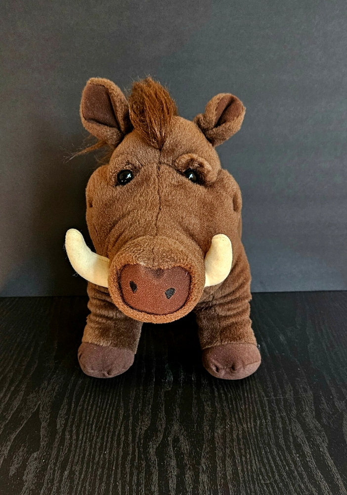 The product is a 16" plush stuffed animal of Pumba from the Disney movie "The Lion King." Manufactured by Build-A-Bear Workshop in 2019, this brown-colored bear is part of the franchise's collection and features the character of Pumba with brown eyes. As a single unit, this stuffed animal is perfect for all occasions and is a retired piece from the 2010-2019 time period. Made of plush material, this Build-A-Bear Workshop creation is an original piece and a must-have for fans of the beloved movie.