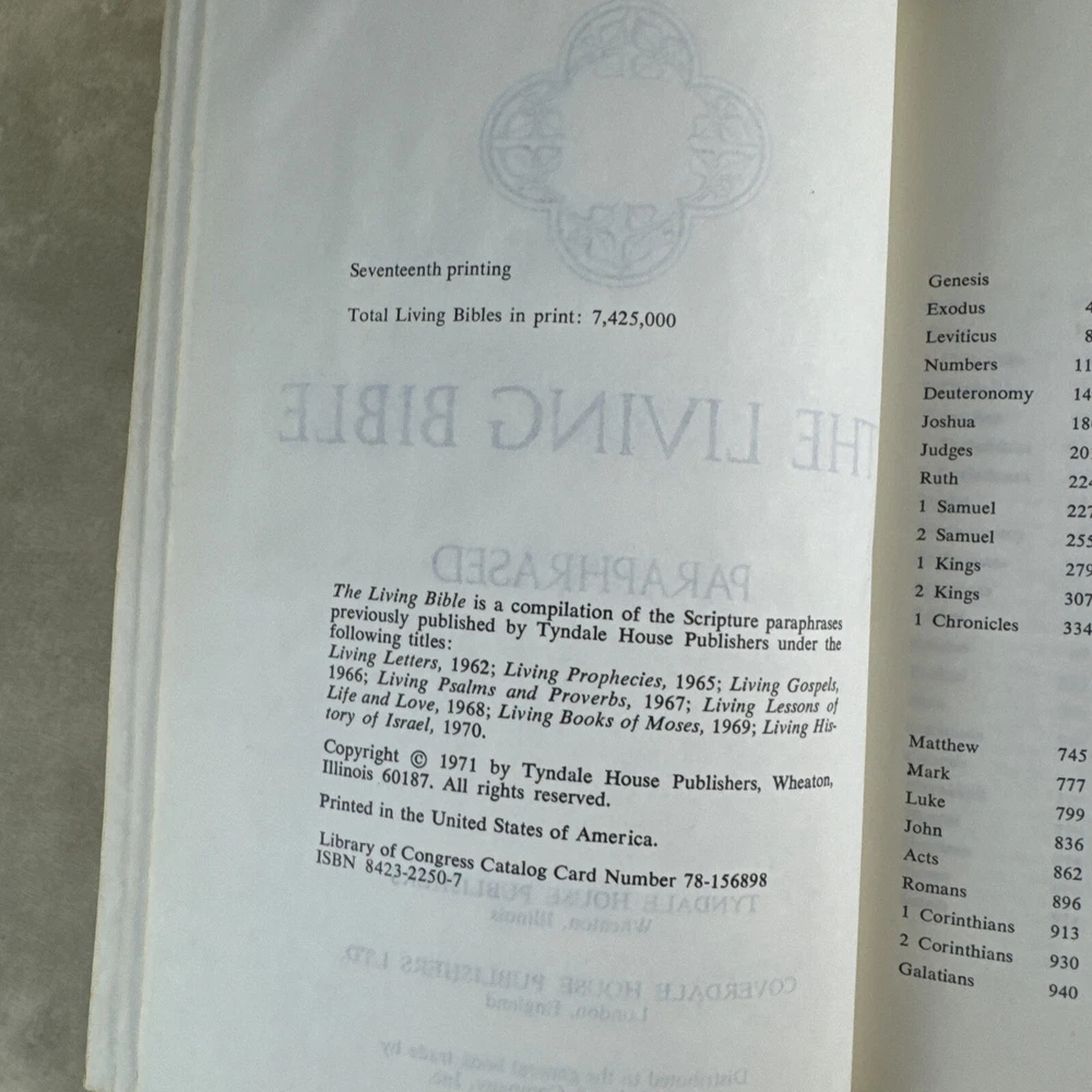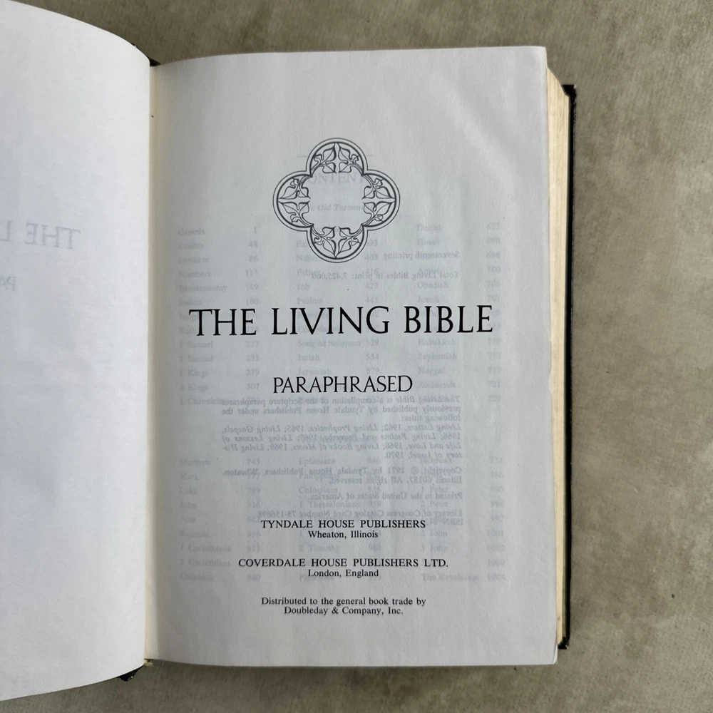 Features:Large PrintInscribed:NoLanguage:EnglishPersonalized:NoGenre:Religious & SpiritualPersonalize:NoBook Series:NAISBN:Does not applyCountry/Region of Manufacture:United StatesNarrative Type:NonfictionAuthor:TyndalePublisher:Tyndale HouseFormat:Faux LeatherPublication Year:1973gtin13:Does not applyTopic:Catholicism, Christianity, Jesus Christ, Religious HistoryVintage:YesType:Prayer BookEx Libris:NoOriginal Language:EnglishSigned:NoIntended Audience:Young Adults, AdultsBook Title:The Living Bible
