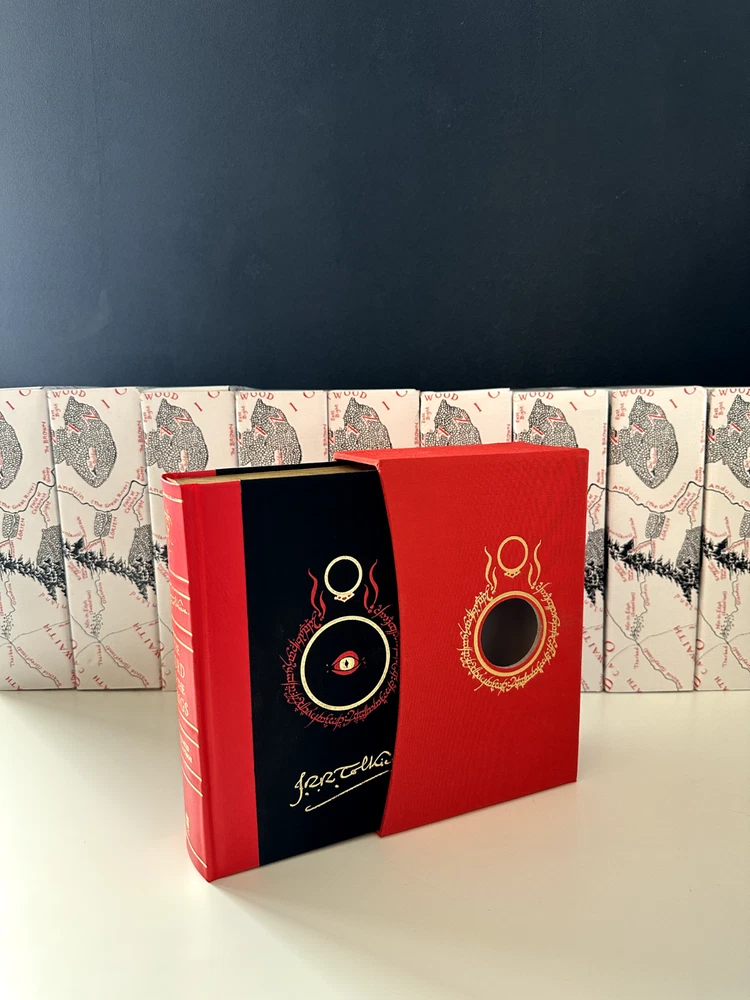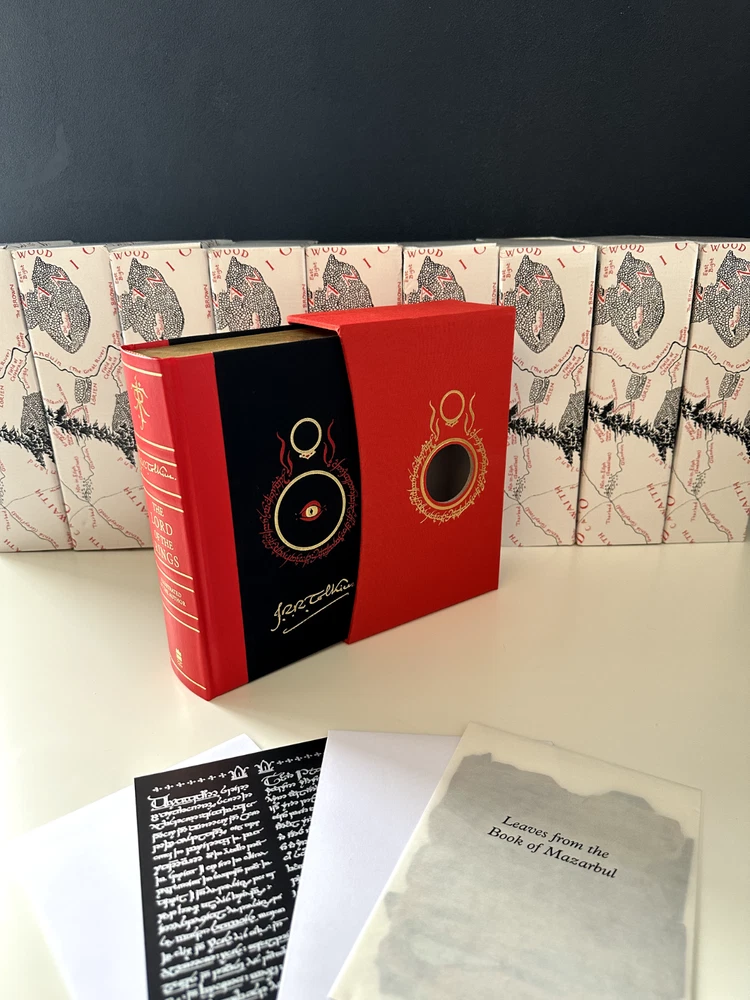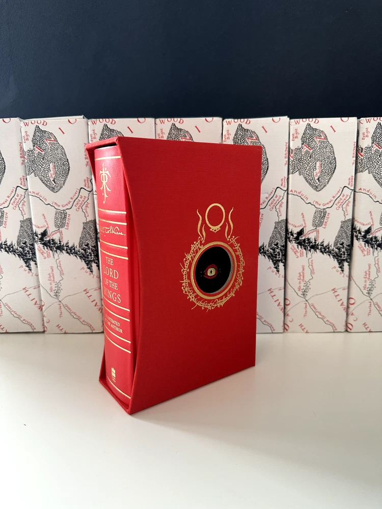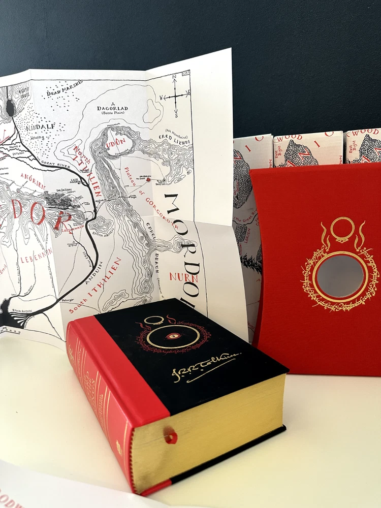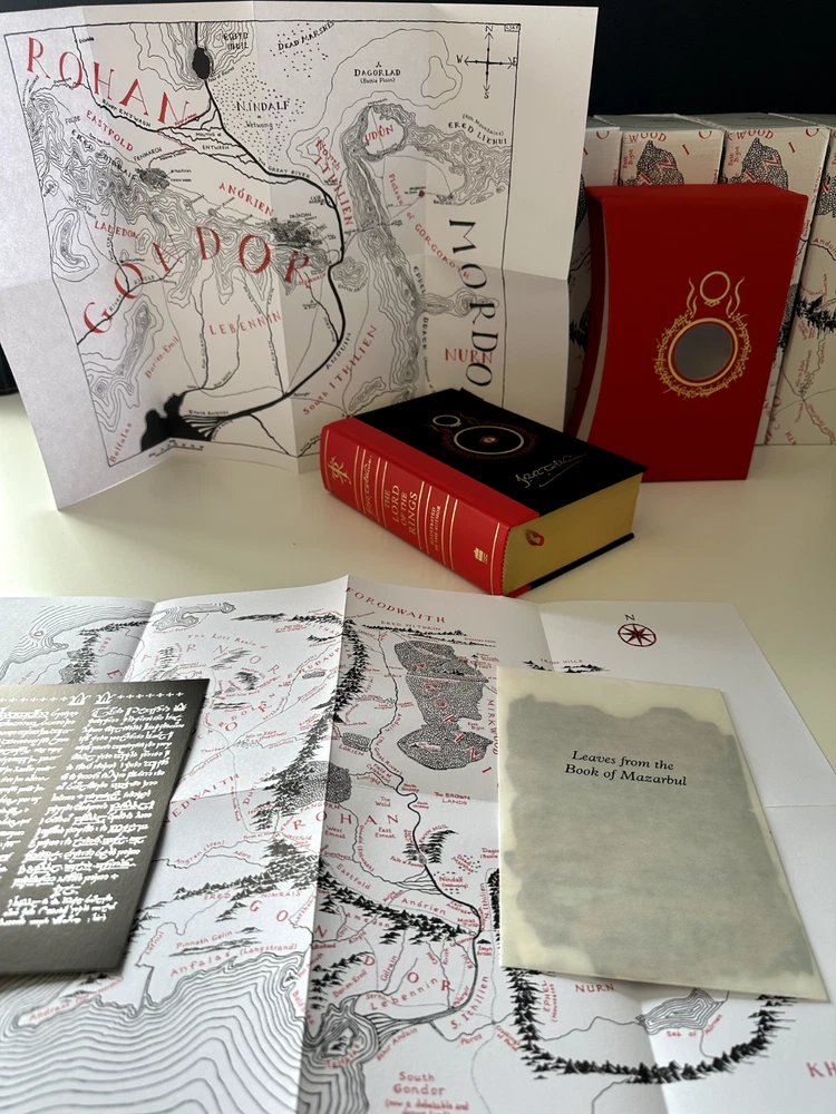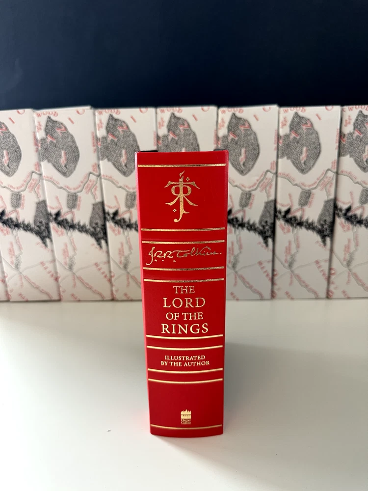 NOTE THAT, the displayed book is my personal copy, which offers an illustration. Your copy will be sealed in an unopened box (displayed on the background). Sumptuous slipcased edition of Tolkien’s classic epic tale of adventure, fully illustrated in colour for the first time by the author himself. This deluxe volume is quarterbound in leather and includes many special features unique to this edition. Since it was first published in 1954, The Lord of the Rings has been a book people have treasured. Steeped in unrivalled magic and otherworldliness, its sweeping fantasy and epic adventure has touched the hearts of young and old alike. Over 100 million copies of its many editions have been sold around the world, and occasional collectors’ editions become prized and valuable items of publishing. This one-volume deluxe slipcased edition contains the complete text, fully corrected and reset, which is printed in red and black and features, for the very first time, thirty colour illustrations, maps and sketches drawn by Tolkien himself as he composed this epic work. These include the pages from the Book of Mazarbul, marvellous facsimiles created by Tolkien to accompany the famous ‘Bridge of Khazad-dum’ chapter. Also appearing are two poster-size, fold-out maps revealing all the detail of Middle-earth. This very special deluxe edition is quarterbound in cloth and red leather, with raised ribs on the spine and stamped in two foils. The pages are edged in gold and contained within are special features unique to this edition.