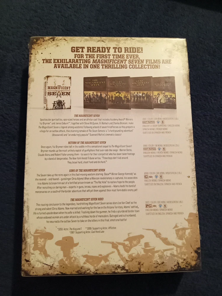 Genre:WesternsRelease Year:2009Director:John Sturges, Burt Kennedy, George MccowanMovie/TV Title:Magnificent Seven 4-PackRating:NREdition:4-Disc SetUPC:0883904106920Actor:Yul Brynner, Eli Wallach, Lee Van Cleef, Steve McQueen, Stefanie Powers, George Kennedygtin13:0883904106920Format:DVDType:Movie