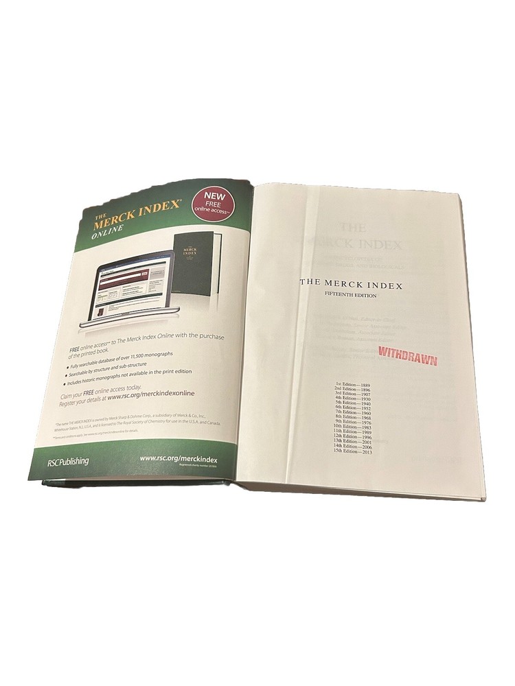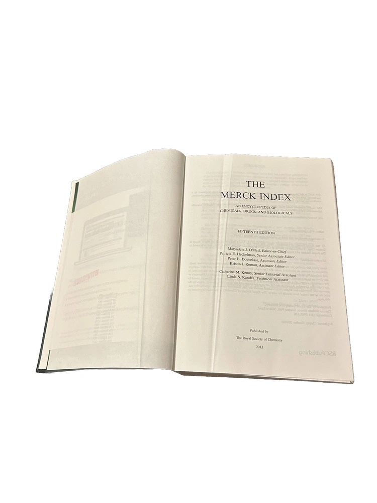 The product is "The Merck Index: An Encyclopedia of Chemicals, Drugs, and Biologicals" published by Merck in 2013. This textbook is a comprehensive resource in the subject areas of Science and Medical, providing information on a wide range of chemicals, drugs, and biological substances. It is authored by Merck and published by the Royal Society of Real Chemistry, T.H.E. in the United Kingdom. The book is in hardcover format, suitable for adult education and vocational school levels, and contains advanced, intermediate, and technical content with illustrations.