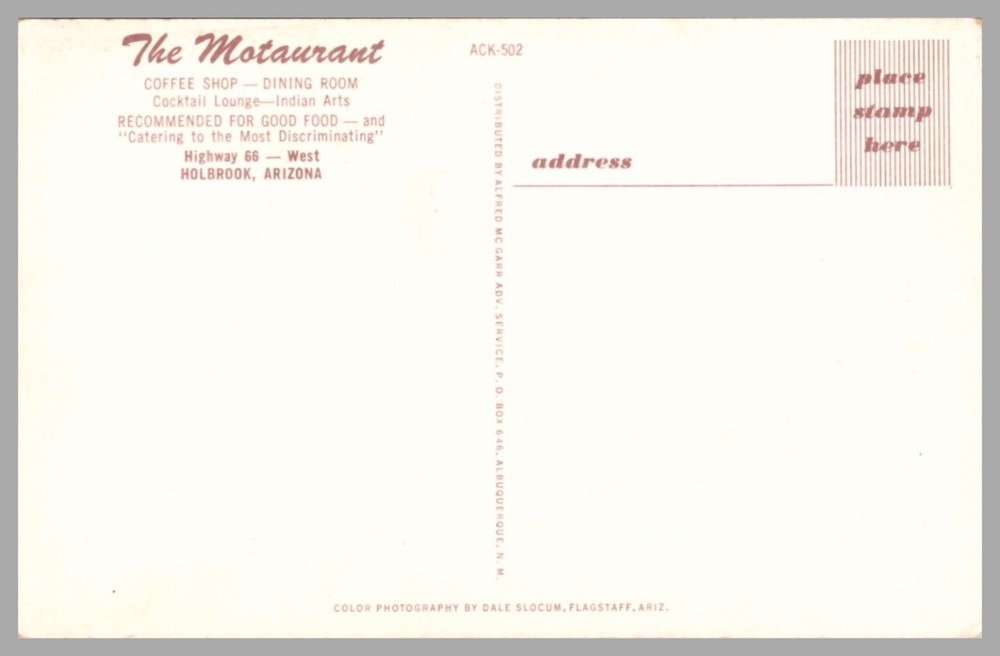 This vintage postcard features a photochrome image of the Motaurant Coffee Shop on Highway 66 in Holbrook, Arizona from around 1950. Published by Alfred McGarr Advertising Service in Albuquerque, NM, this original postcard captures a moment in time in the United States' history. With a standard size of 5.5 x 3.5 inches and made of paper, this collectible showcases a piece of roadside America and the charm of cities and towns in Arizona during the mid-20th century.
