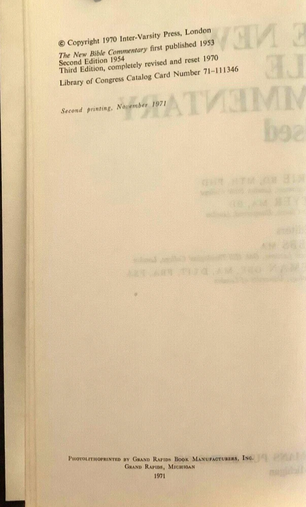 The New Bible Commentary Revised, Third Edition, 2nd Printing, 1971 hardcover in good condition. The spine and covers are solidly attached; a bit of a tilt to the spine. Some edge and corner wear to the covers; some handling marks and scuffs to the covers. Pages are clean with no writing found inside. See photos. Shipped with USPS Media Mail.
