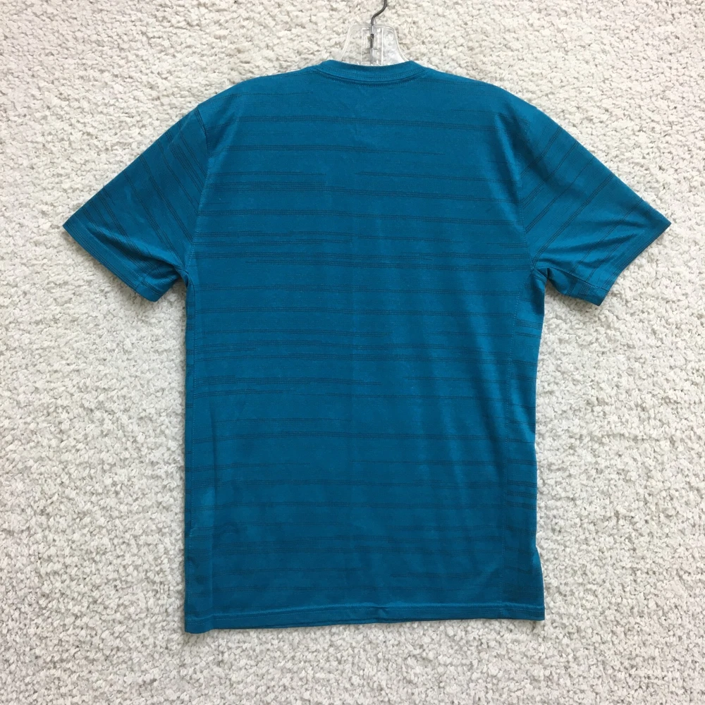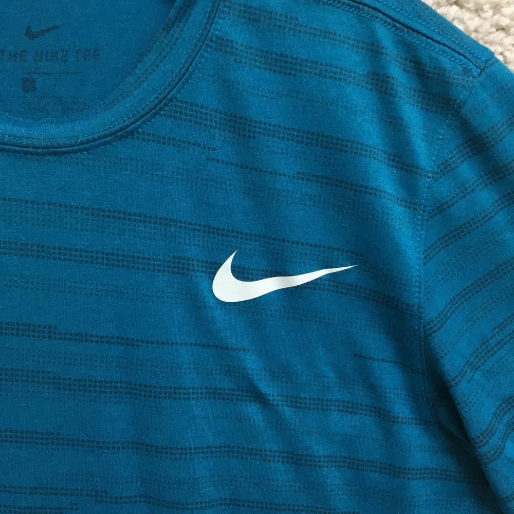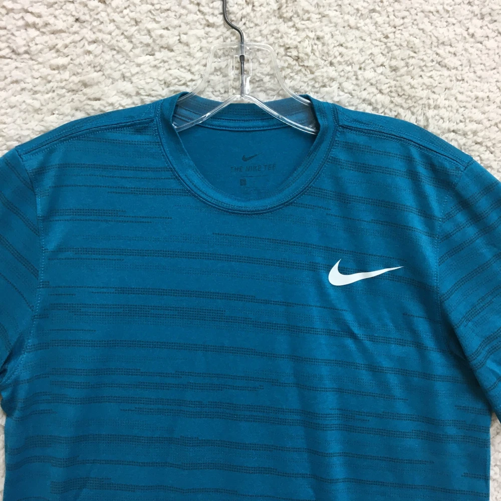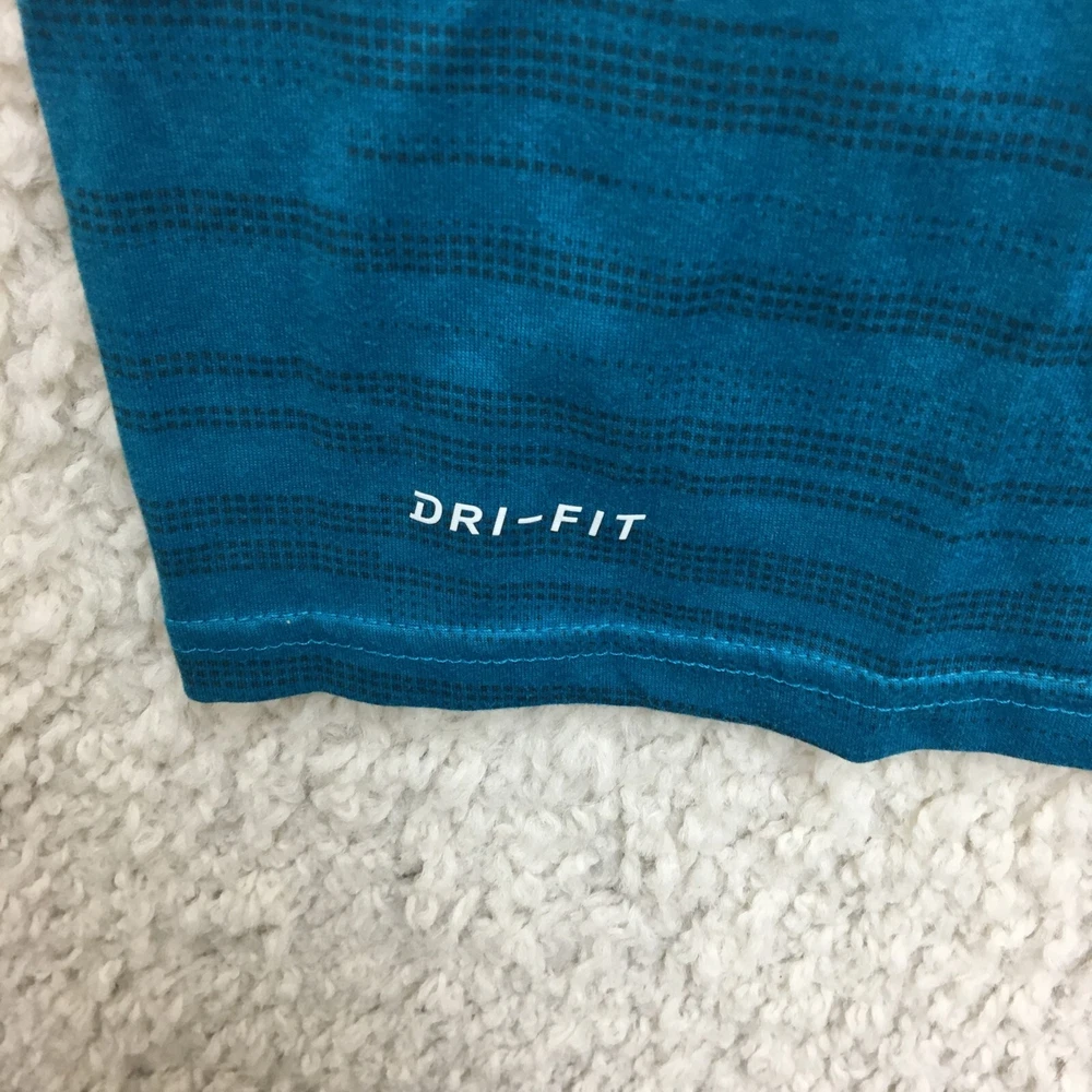 Garment Care: Machine Washable Pattern: Striped Brand: Nike Occasion: Activewear Performance/Activity: Walking Department: Men Theme: Classic, Fish Style: Pullover Material: Polyester Season: Fall, Spring, Summer, Winter Product Line: Nike Dri-FIT Color: Blue Closure: Pullover Size Type: Regular Type: T-Shirt Seller Notes: “Good Used Condition. Please, See Pictures for Full Condition and Measurements.” Country/Region of Manufacture: Honduras Neckline: Crew Neck Fabric Type: Flannel Accents: Logo Size: M Sleeve Type: Casual Sleeve Fit: Regular Features: All Seasons, Breathable, Easy Care, Stretch Sleeve Length: Short Sleeve
