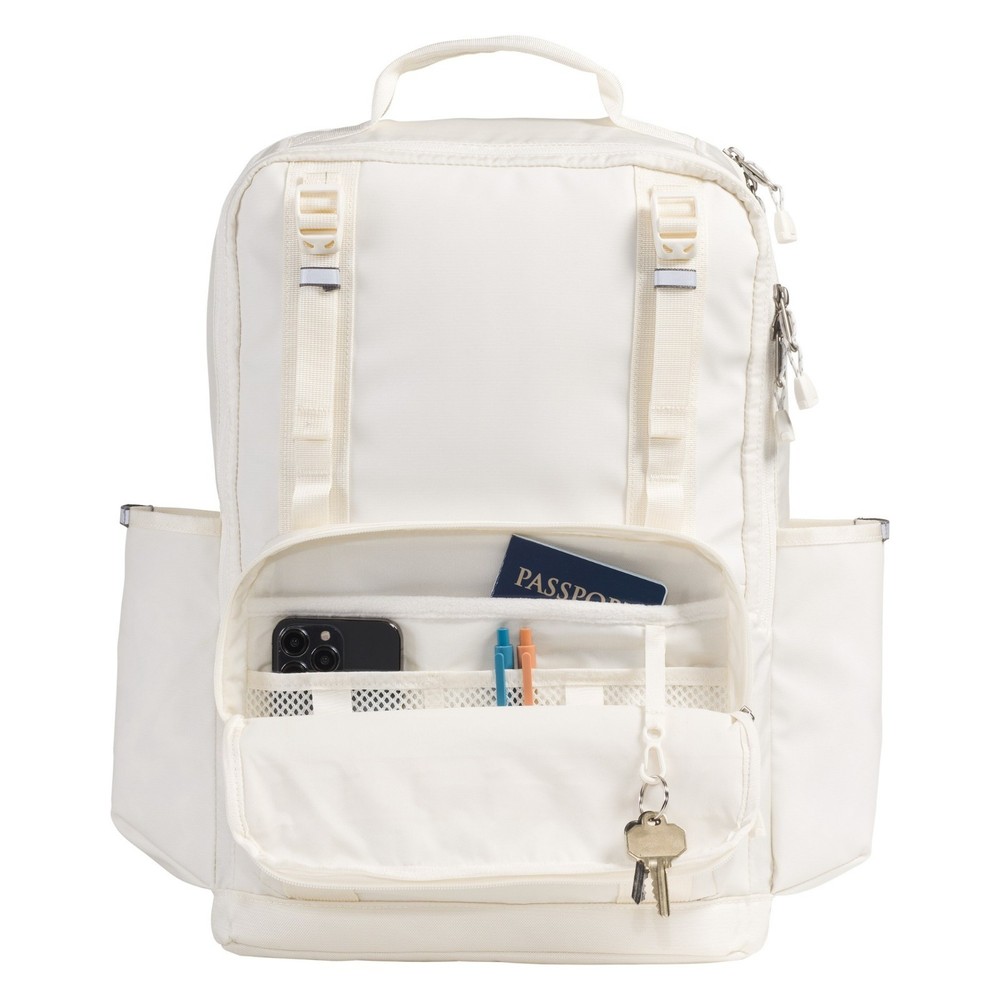 Features Base Camp fabric makes this pack both durable and stylish Padded back panel Padded, fleece-lined 16 in. laptop compartment Large, zippered main compartment holds your work, school or travel items External, secure zipper front pocket includes a fleece-lined sleeve, 2 mesh drop pockets and a key hook Webbing straps on front of bag can hold a jacket 2 water bottle pockets with hidden stretch webbing bands to help secure items Daisy-chain webbing offers lash points Top grab handle Adjustable sternum strap 360° reflectivity This item meets carry-on size restrictions for most airlines (size not to exceed 45 linear inches when adding L+W+H; this is subject to change, so check with your airline) Imported.