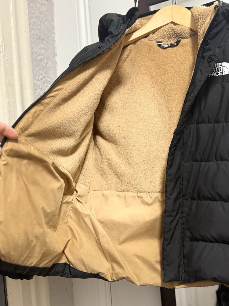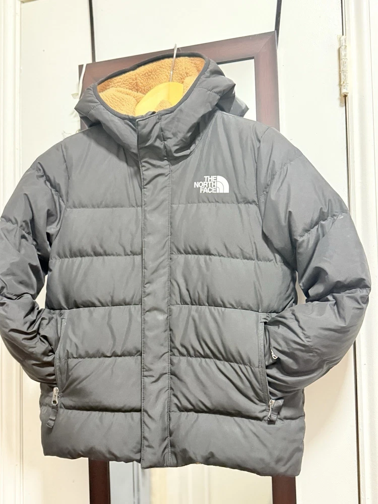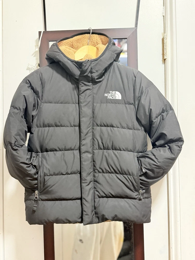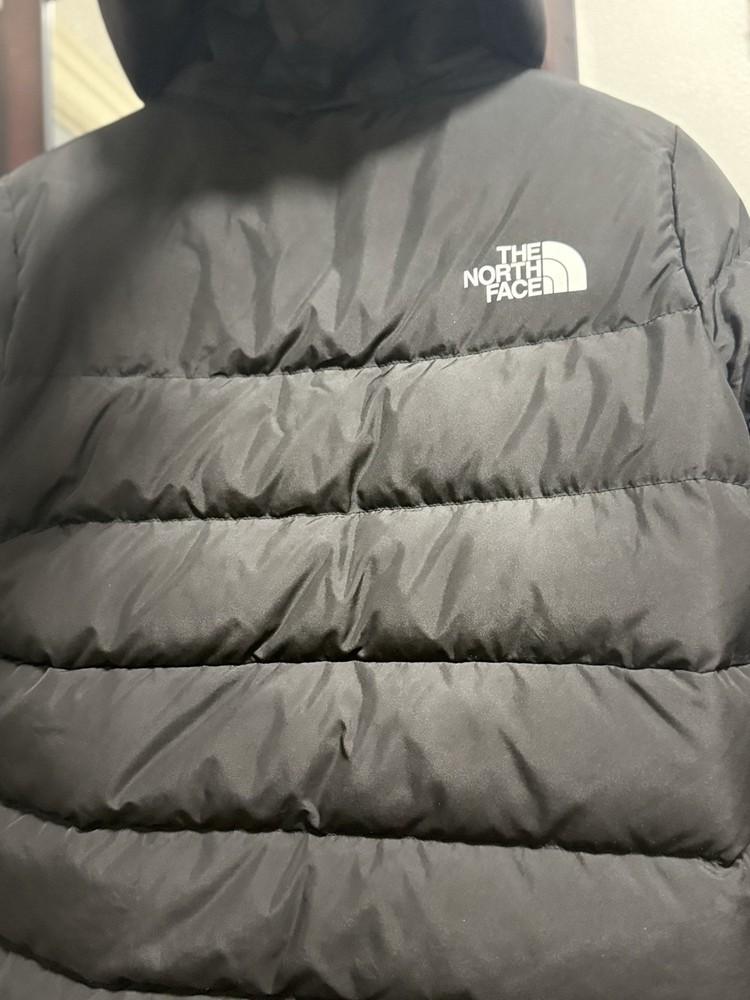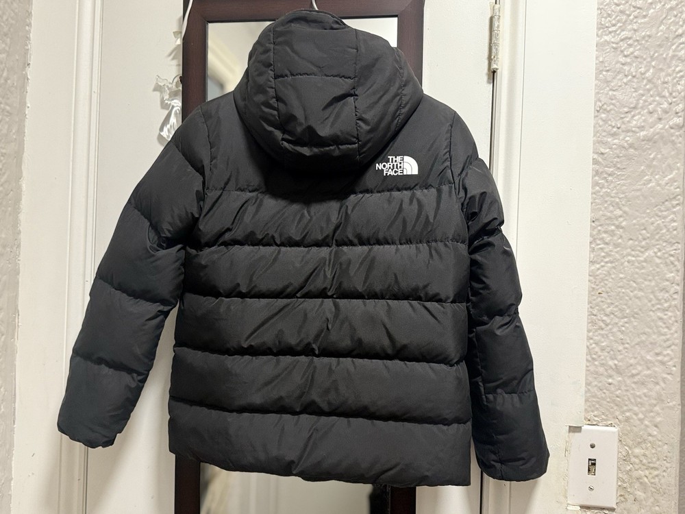 The North Face kids puffer jacket (600 fill), black with hood. Very warm, in great condition. No rips, holes, or damage. Down is evenly distributed (not flat or clumped). From a smoke-free, pet-free home. Care/washing instructions: please refer to the inner label. See photos for details.