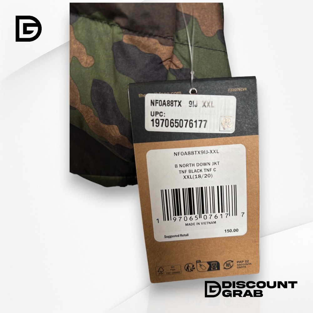 THE NORTH FACE Boys' Reversible North Down Hooded Jacket Size XXL Product Description This is a THE NORTH FACE Boys' Reversible North Down Hooded Jacket Size XXL. Item has been thoroughly inspected and seems to be in brand new unused condition, see photos. Product: THE NORTH FACE Boys' Reversible North Down Hooded Jacket Size : XXL (Youth) Brand: The North Face – Renowned for durable, high-performance outerwear designed for all-weather protection. Reversible Design: 2-in-1 Style – One side features a quilted, insulated exterior, while the reverse side offers a sleek, puffer-style look Versatile styling for different looks and conditions Warmth & Insulation: 600-fill recycled down insulation – Lightweight, breathable warmth Durable Water-Repellent (DWR) finish – Helps shed light rain and snow Designed to keep kids warm in cold winter conditions without bulky layers Features & Fit: Attached insulated hood – Extra warmth and protection from the elements Elastic cuffs and hem – Helps seal in heat and keep out cold air Zip hand pockets – Convenient for storage or keeping hands warm on both sides Standard fit – Roomy enough for layering Color: Camo Condition: Brand new with tags Clean and ready to wear Shipping & Handling: Ships within 1 business day Carefully packaged and tracked for safe delivery Questions? Don’t hesitate to message me--happy to provide more details or photos! Product Specifics Style: Parka Brand: The North Face Color: CAMO Outer Shell Material: 100% Polyester Size: 2XL Type: Jacket Department: Boys Policies Shipping We ship every day Monday - Friday. All orders ship the following business day. Top Rated We have sold over 145,000 items on eBay and counting! Returns We hope you love your purchase, however if you need to return it, we have a 30 day return policy. Please note that the item you receive may vary slightly from the one pictured. We strive to provide accurate representations, but due to factors such as manufacturing variations or availability, the condition and appearance of the product you receive might differ. We cannot guarantee that every item will match the exact one depicted in the photo. Rest assured, our commitment to delivering a high-quality product remains unchanged. If you have any concerns or questions, feel free to reach out to us before making your purchase. Your satisfaction is our priority. Questions? Have a question you need answered? Message us on eBay and we'll respond within 1 business day! We want you to be confident with your purchase and are here to help put your mind at ease. About Us We are a small eBay store based out of Indianapolis, IN. We aim to provide great products at an even better discount. We post new items daily and always have a great grab bag of items to choose from. We rarely offer the same thing twice and that is what makes our eBay store so much fun. If you have any questions or concerns please feel free to drop us a message here on eBay and we will get back to you within 1-2 business days. Suggested For You The North Face Boys Freedom Insulated Jacket TNF Blue Size XL (14/16). $79.99 The North Face Boys Freedom Insulated Jacket TNF Blue Size XL (14/16) $79.99 The North Face Boys Freedom Insulated Jacket - Black/Camo - Size XXL (18/20) $79.99 The North Face Boys Freedom Insulated Jacket - Black/Camo - Size XL (14/16) $79.99 The North Face Boys Freedom Insulated Jacket - Black/Camo - Size XXL (18/20) $79.99 The North Face Boys Freedom Insulated Jacket Black/Camo Size XL (14/16) $79.99 The North Face Boys Freedom Insulated Jacket Black/Camo Size XXL (18/20) $79.99 The North Face Boys Reversible Mount Chimbo Full-Zip Hooded Jacket Size XXL $44.99 Add suggested items to your listings - Check it out on 3Dsellers.com eBay listing template by 3D sellers.com - Try for Free!