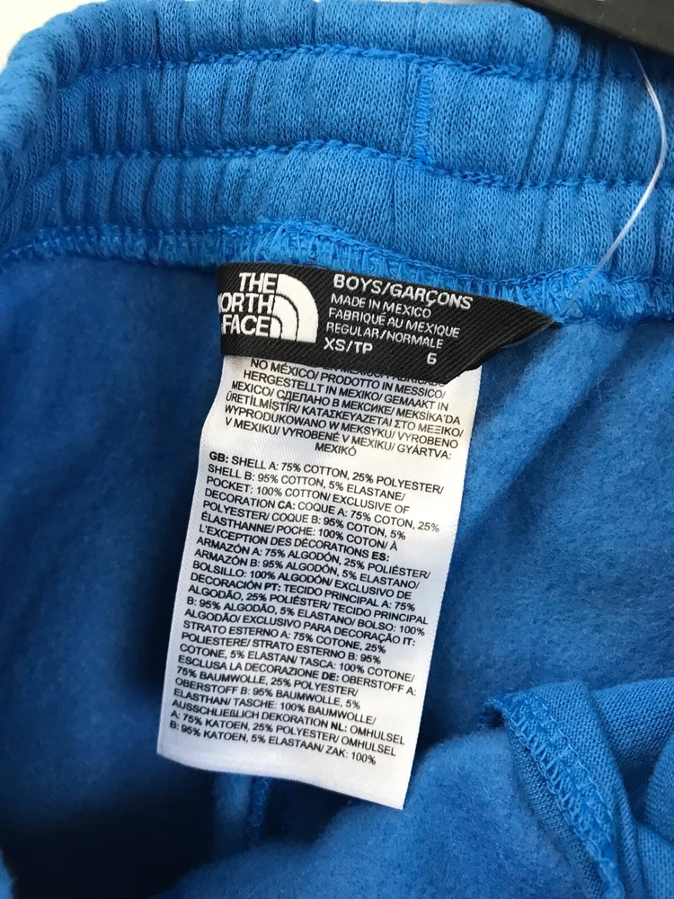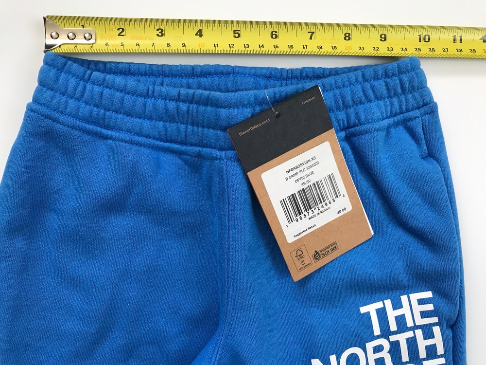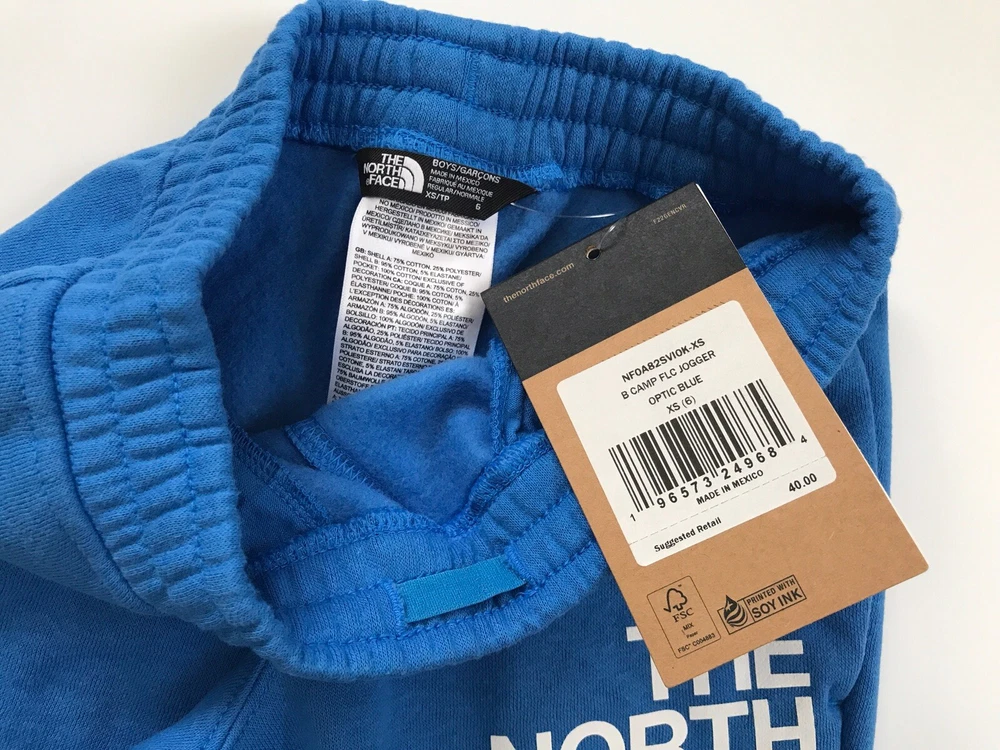 The North Face Boys' Camp Fleece Jogger New with tags. Blue Boy’s XS (6) Encased-elastic waistband with an internal drawcord On-seam hand pockets Rib on cuffs Water based screen printed graphic 75% cotton, 25% polyester Made in Mexico