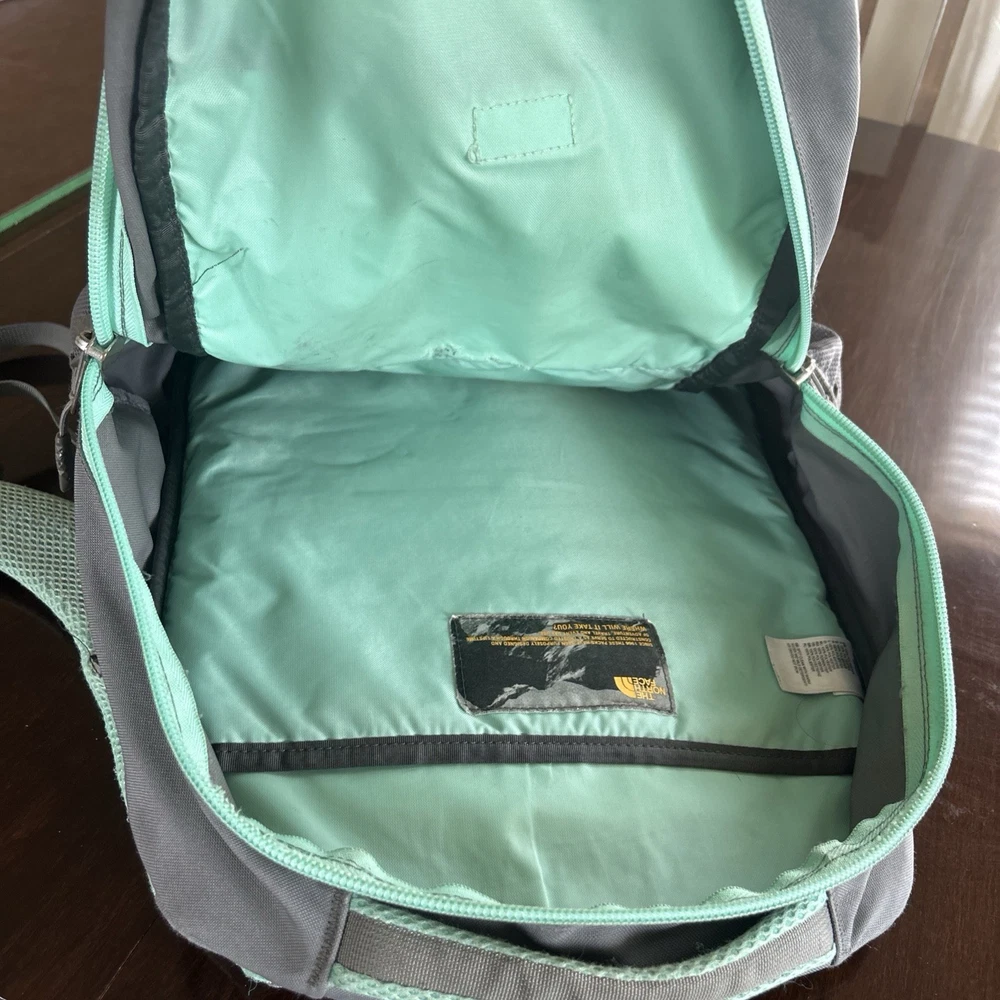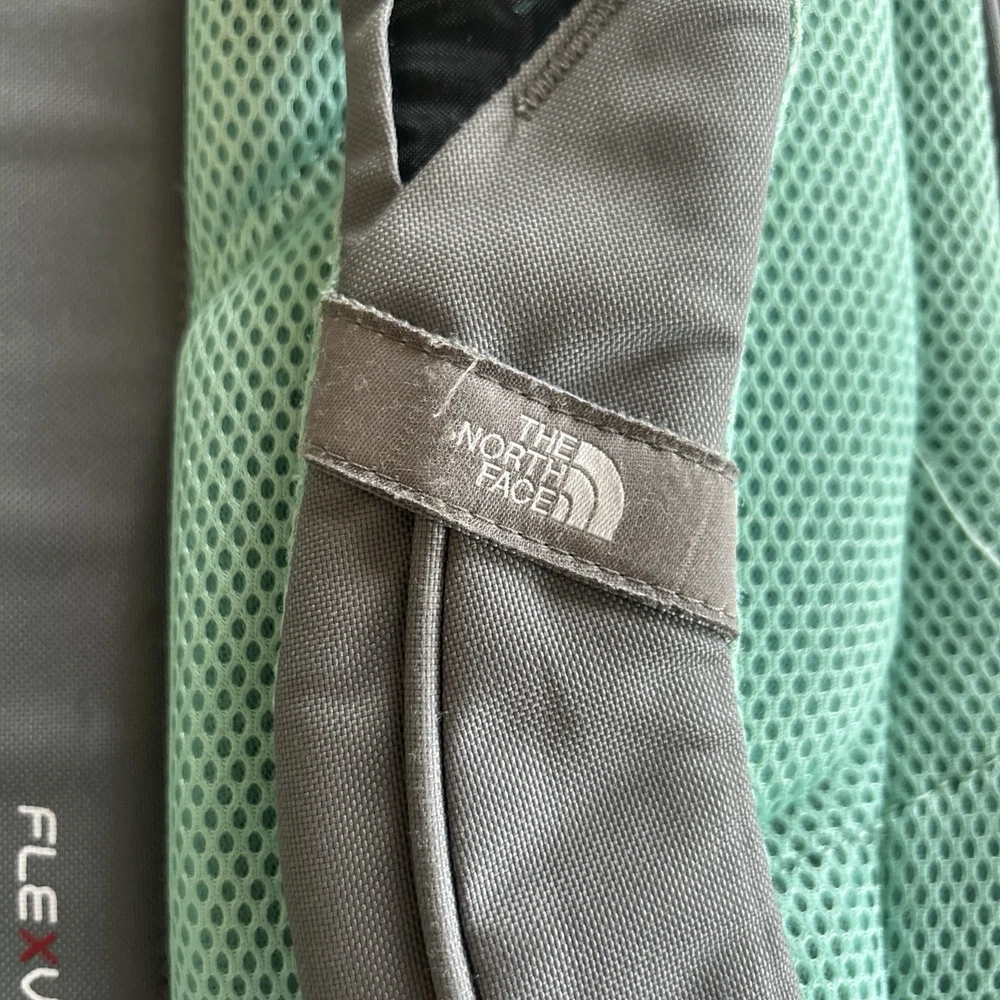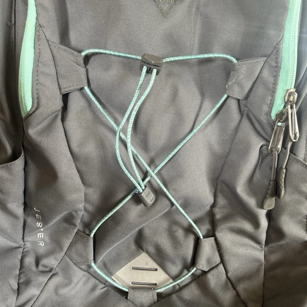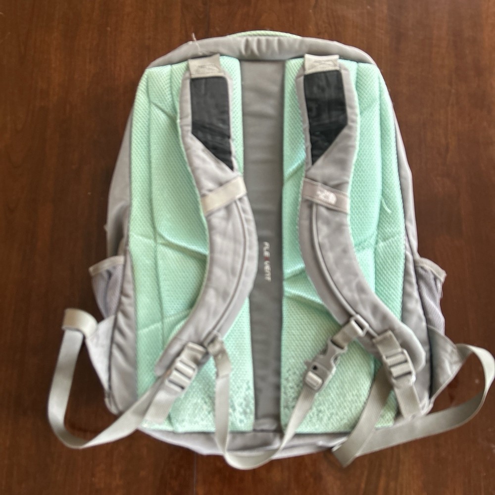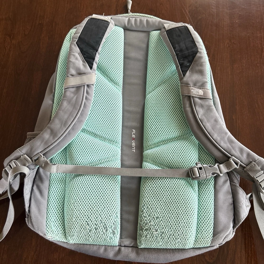 The North Face Jester Backpack Gray & Teal. Adjustable Straps, Laptop/Tablet Pocket onside, Flexvent. Pre-owned and shows some wear, please read description below and see photos. READ- This backpack has working zippers, there is wear to the mesh on the lower back and a strap back (as shown in pics).