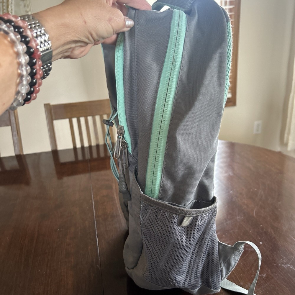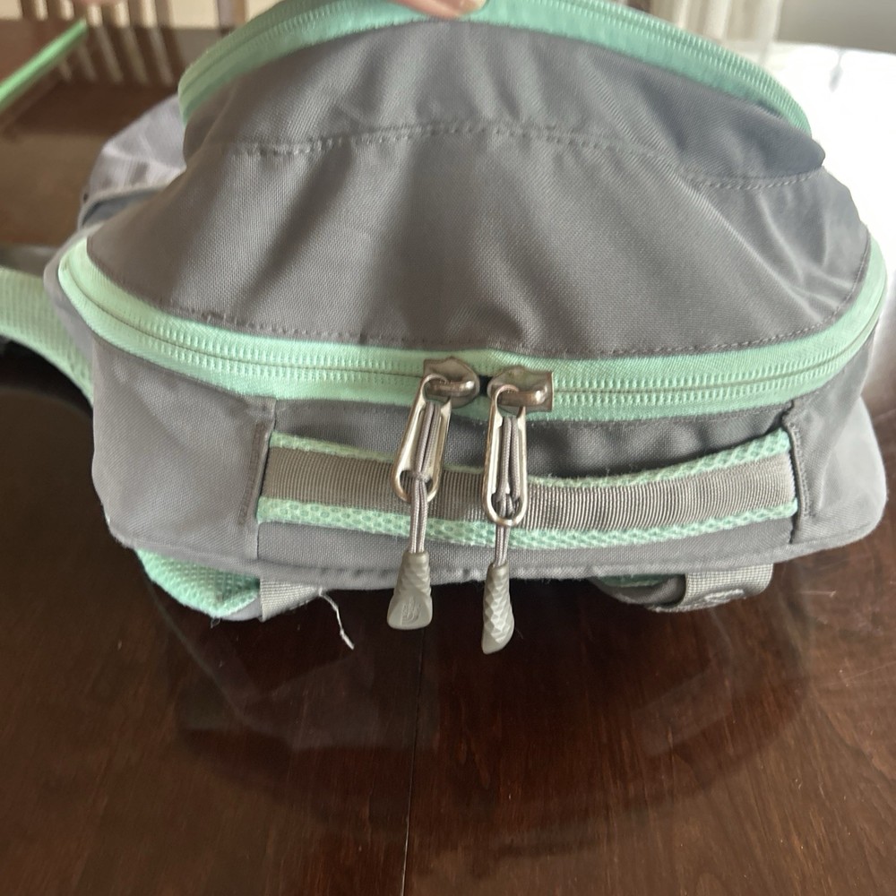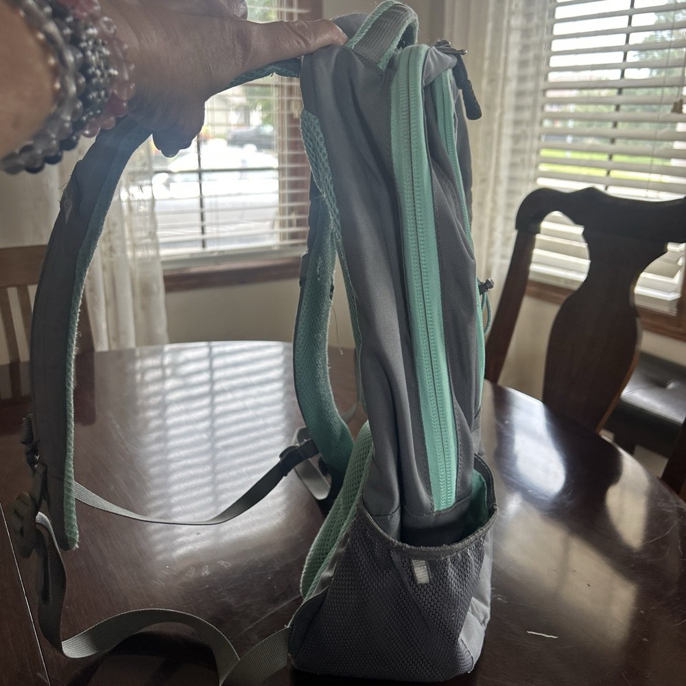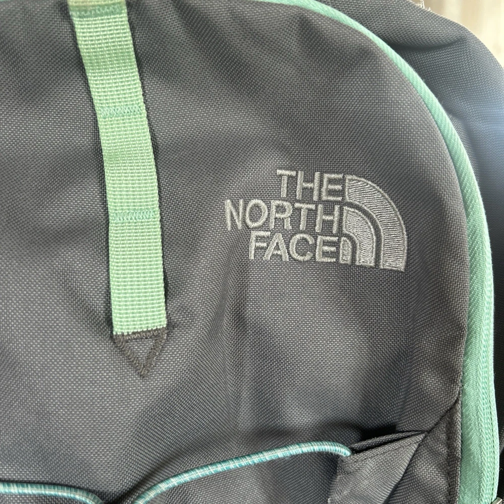 The North Face Jester Backpack Gray & Teal. Adjustable Straps, Laptop/Tablet Pocket onside, Flexvent. Pre-owned and shows some wear, please read description below and see photos. READ- This backpack has working zippers, there is wear to the mesh on the lower back and a strap back (as shown in pics).