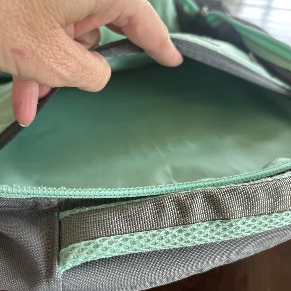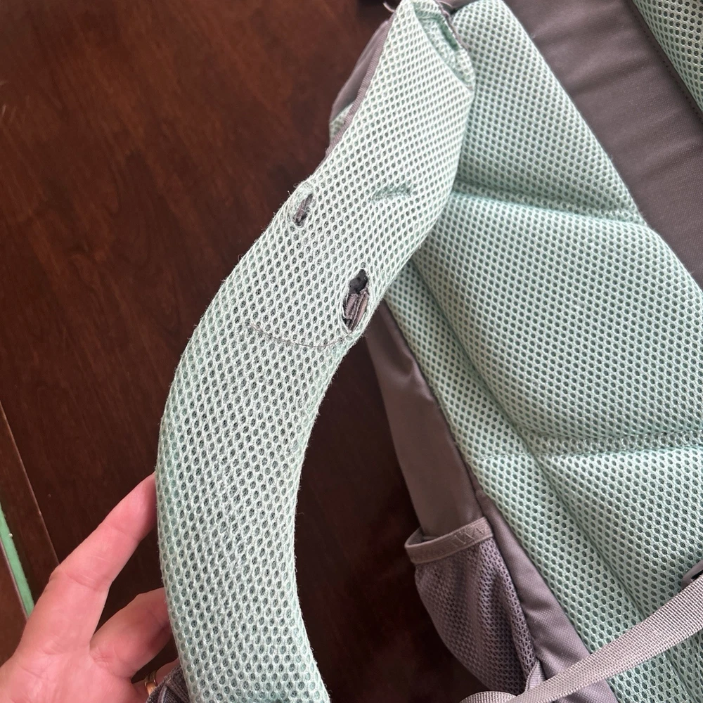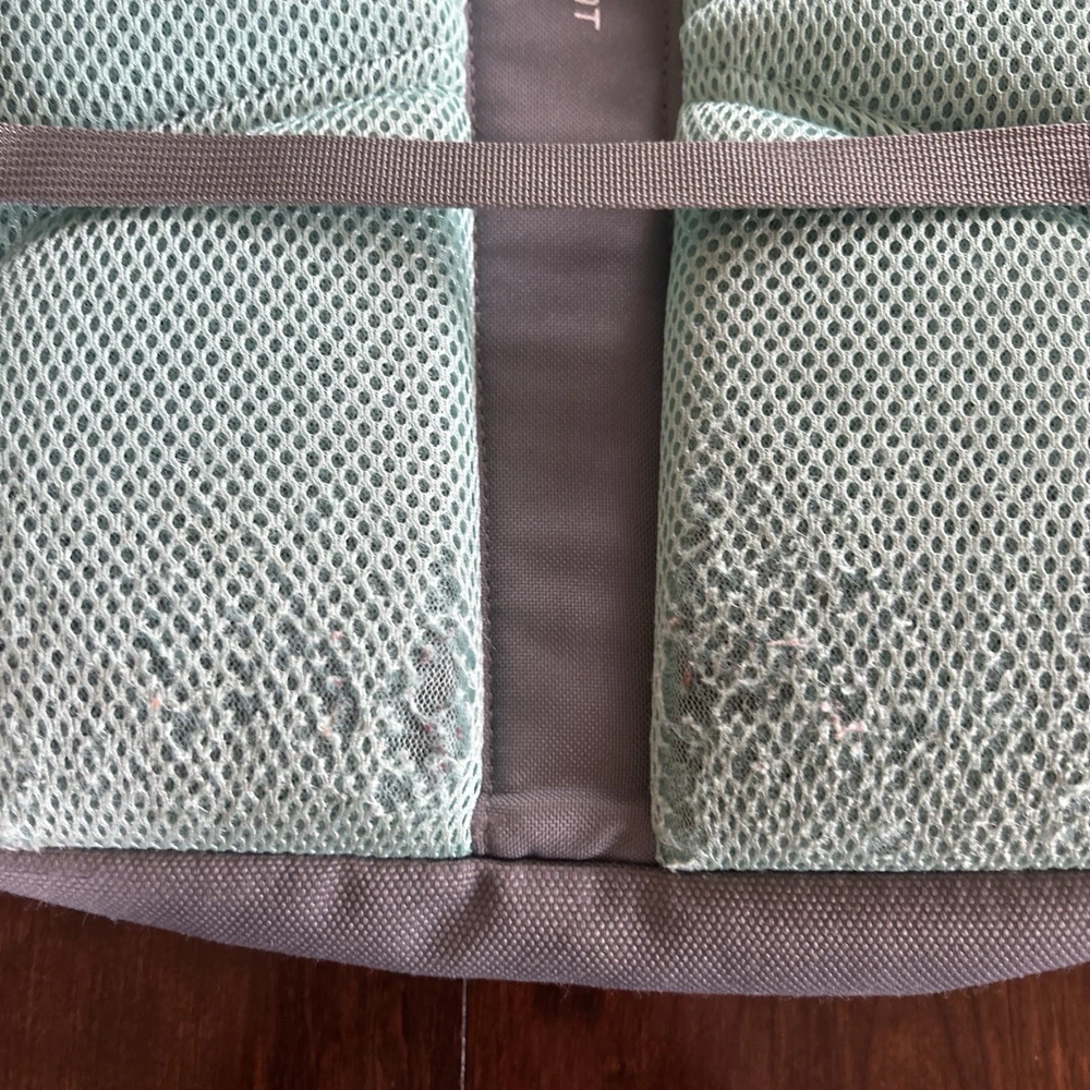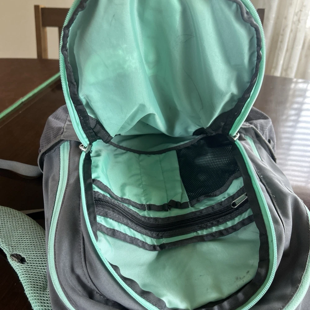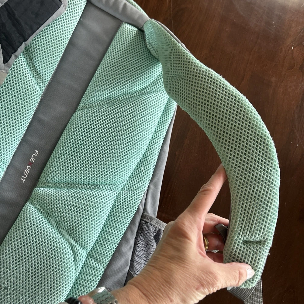 The North Face Jester Backpack Gray & Teal. Adjustable Straps, Laptop/Tablet Pocket onside, Flexvent. Pre-owned and shows some wear, please read description below and see photos. READ- This backpack has working zippers, there is wear to the mesh on the lower back and a strap back (as shown in pics).