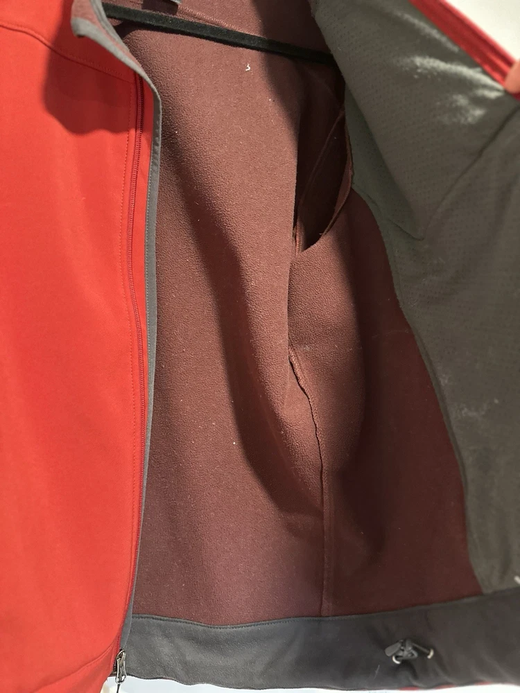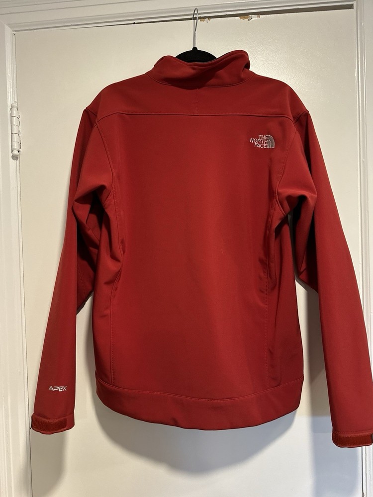 The North Face Mens Medium Apex Bionic Softshell Deep Red Full Zip Jacket. Hand warmer zip pockets. Single zip Chest pocket. Adjustable cuffs. Drawstring waist. Excellent used condition. No rips, stains or defects. Please see pictures for measurements.