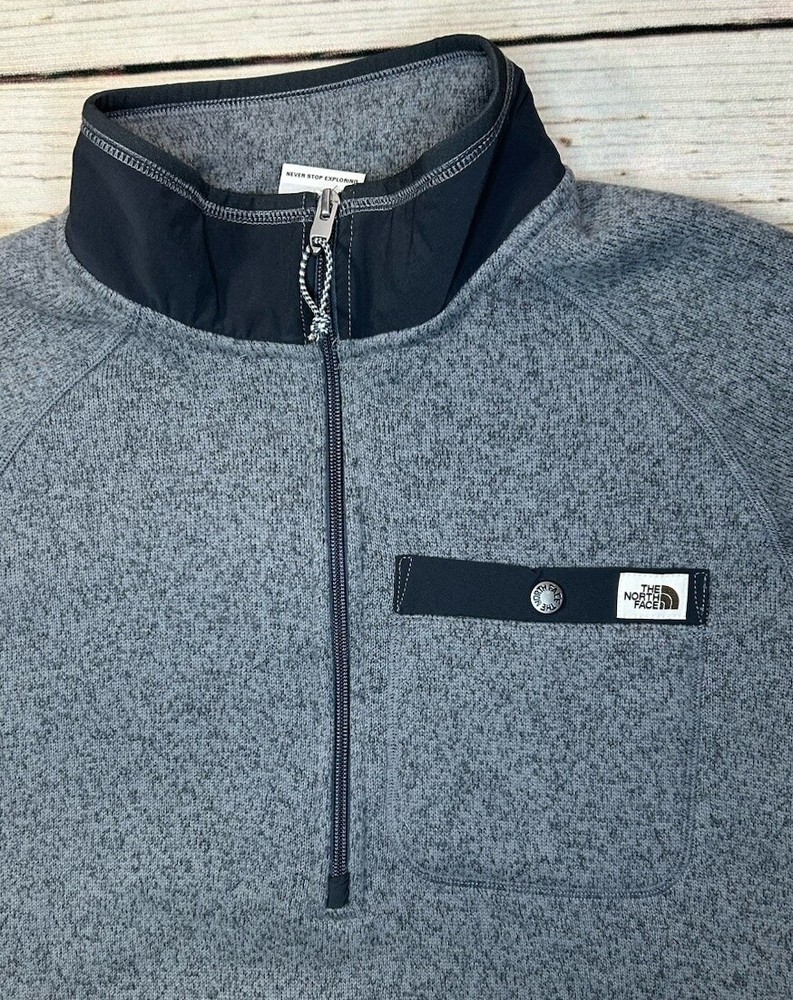 Fabric Type: Fleece Graphic Print: No Size Type: Regular Garment Care: Machine Washable Features: 1/4 Zip Fit: Regular Accents: Logo Vintage: No Color: Gray Type: Sweater Season: Fall, Spring, Winter Style: Pullover Personalize: No Material: Polyester Pattern: Solid Country/Region of Manufacture: Haiti Size: M Neckline: Mock Neck Occasion: Casual, Travel Brand: The North Face Department: Men Sleeve Length: Long Sleeve
